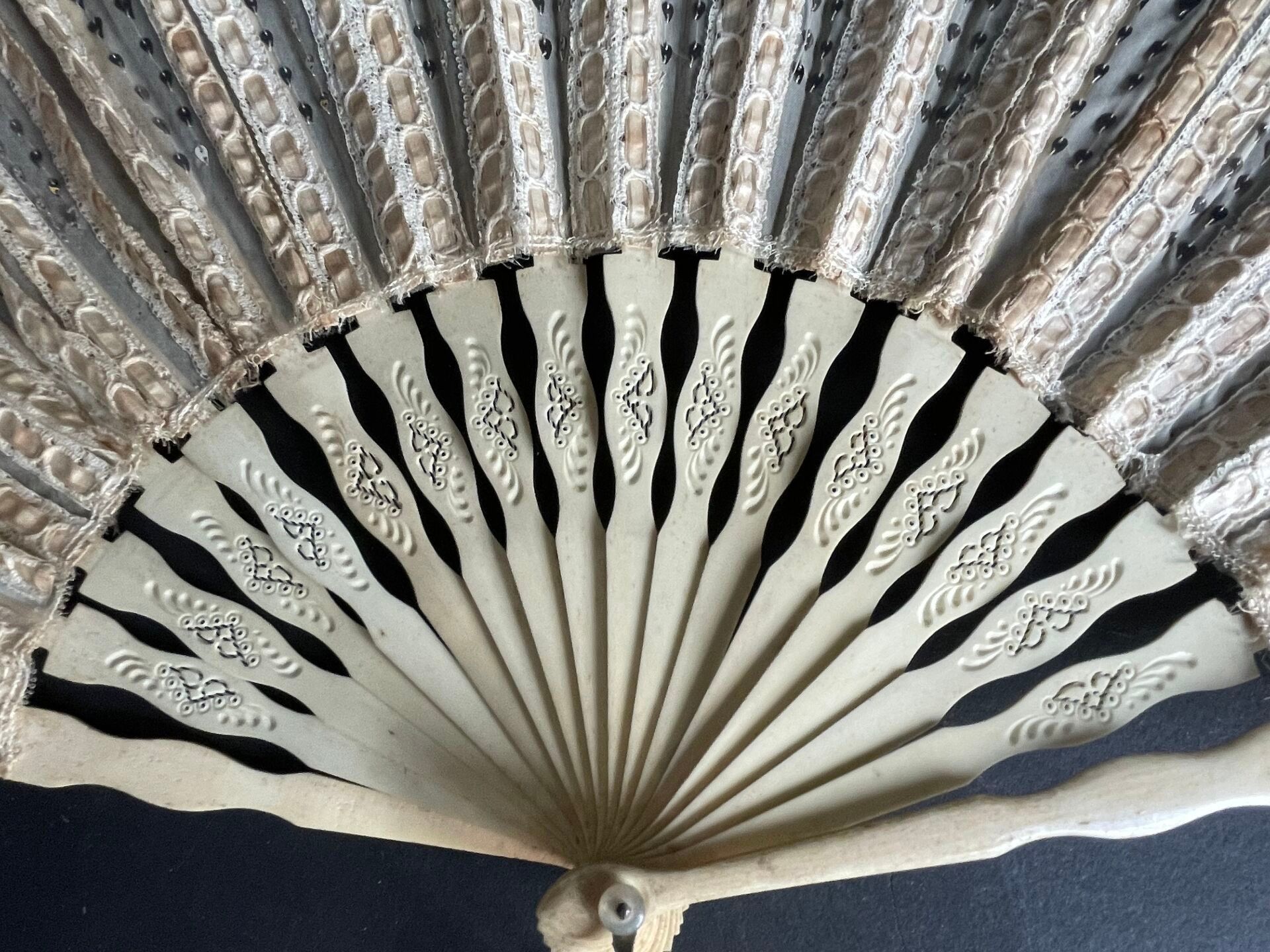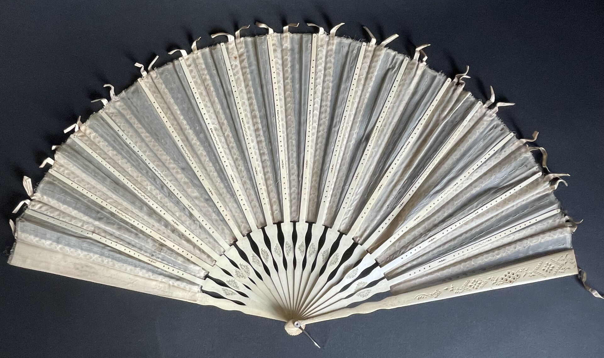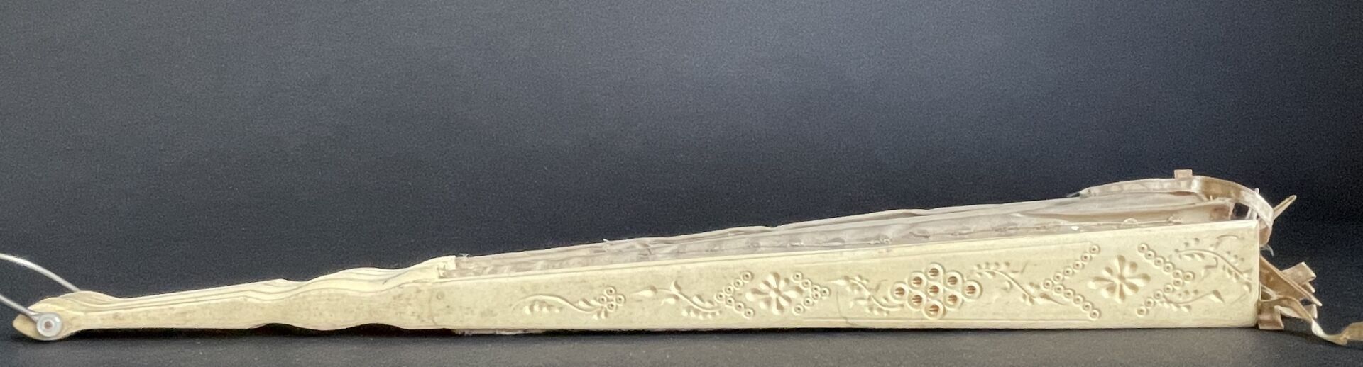 Folded fan, the gauze sheet sewn with drop sequins and ribbons evoking the lacing of a corset.