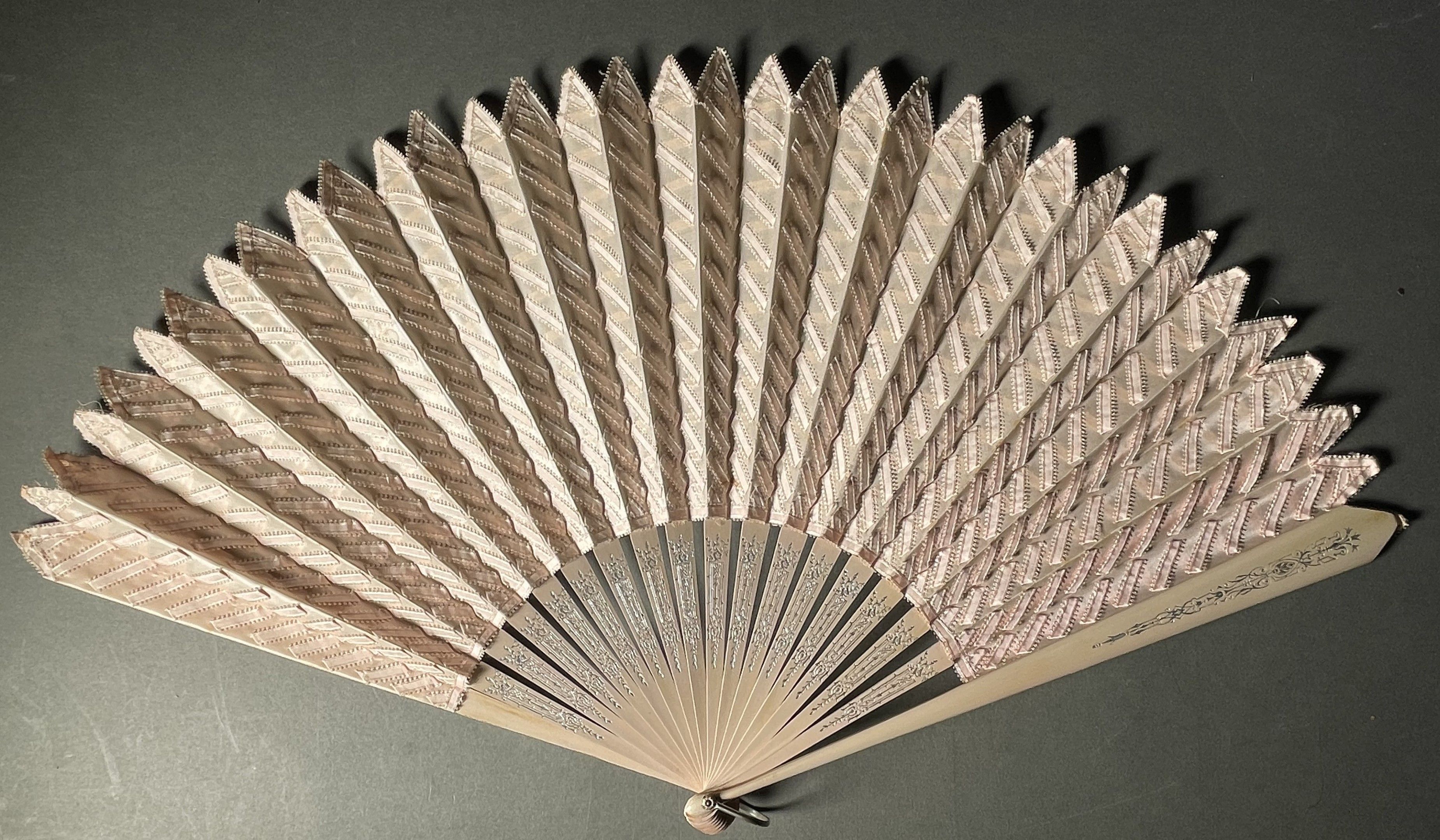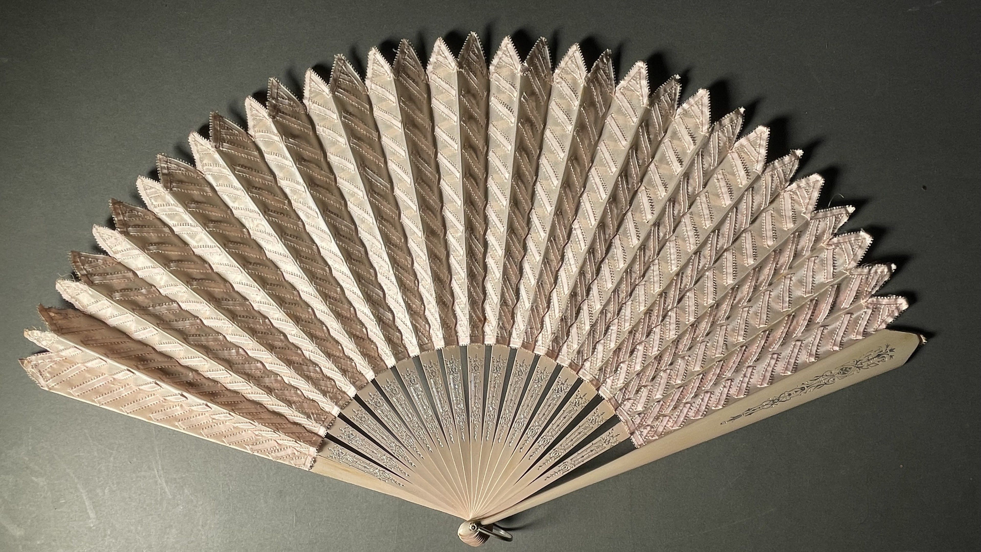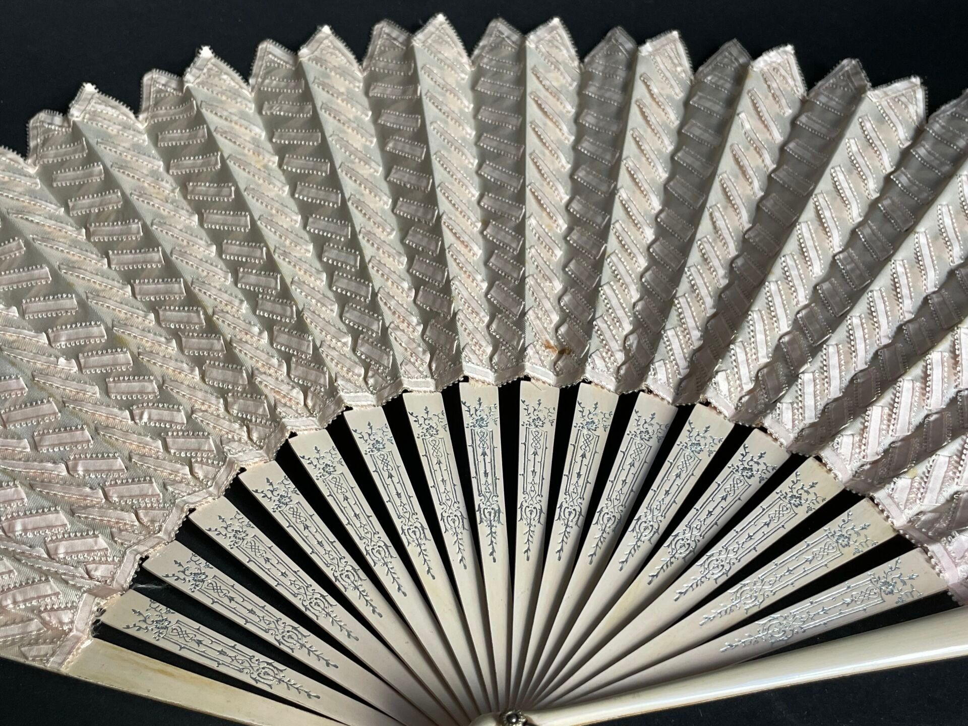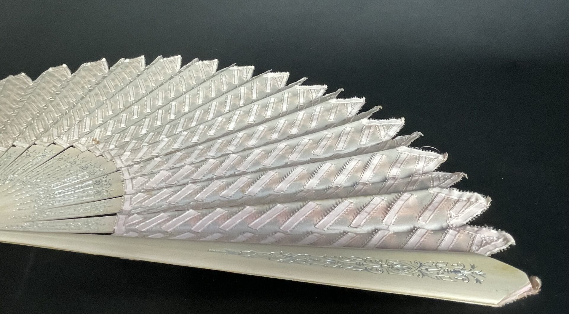 Folded fan, the powder pink satin leaf decorated with pink lacing.