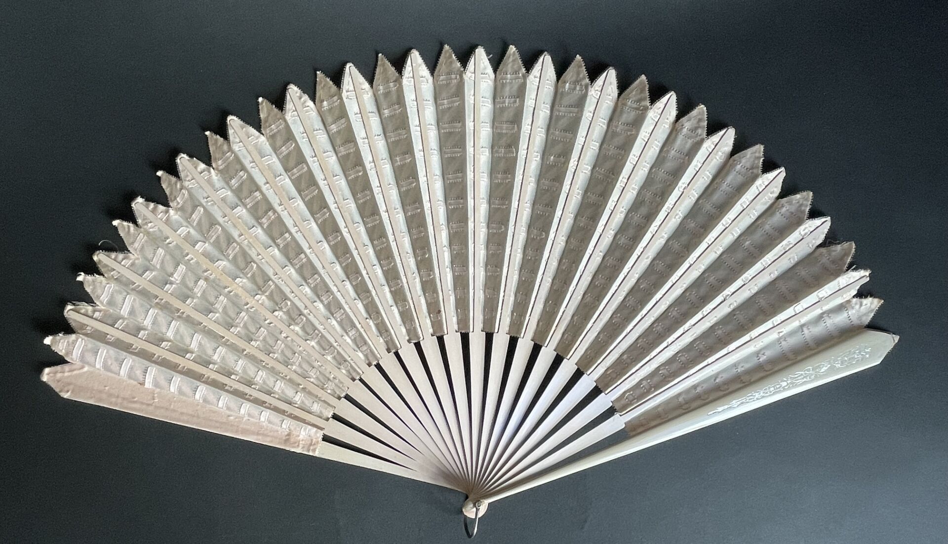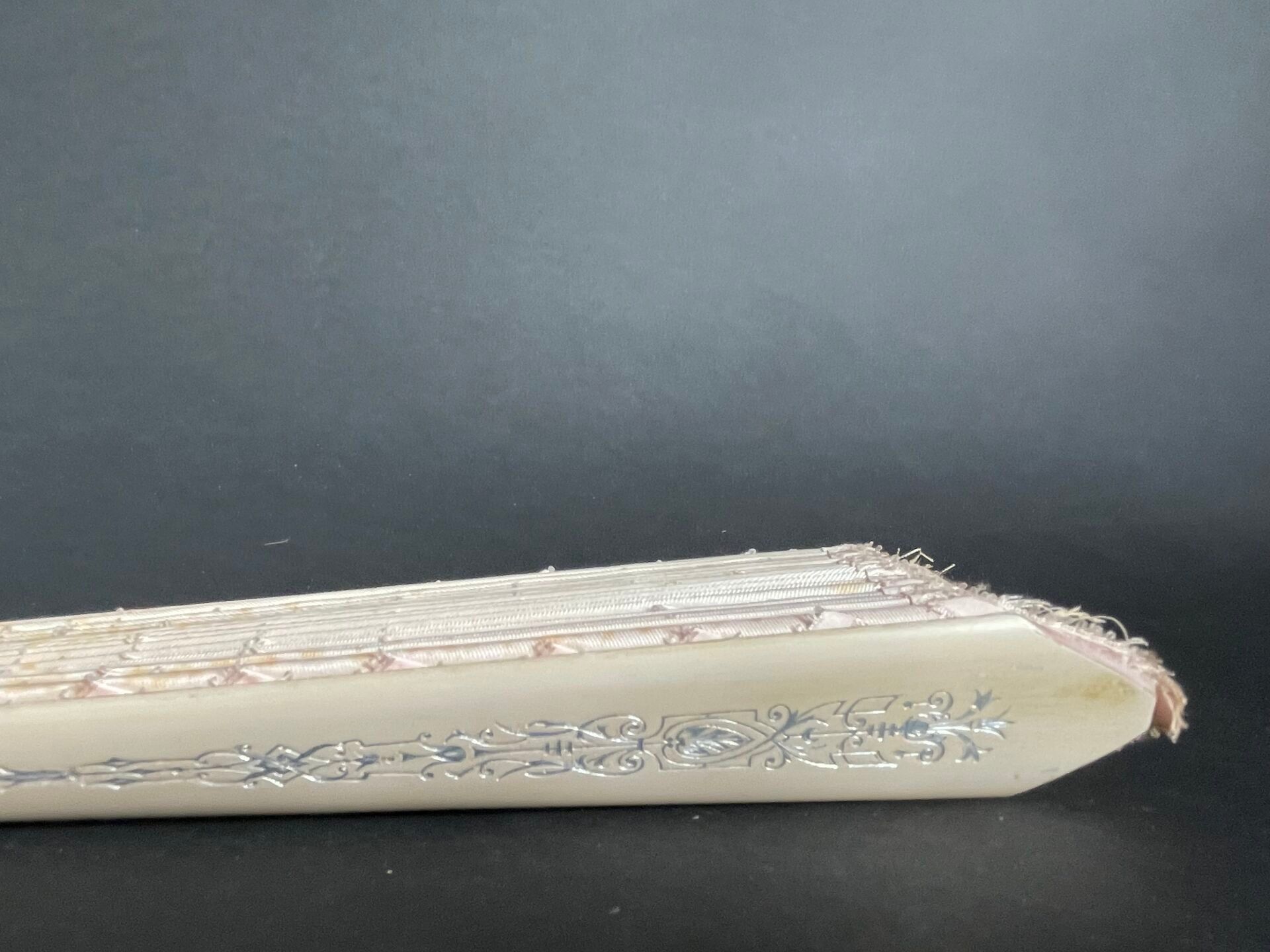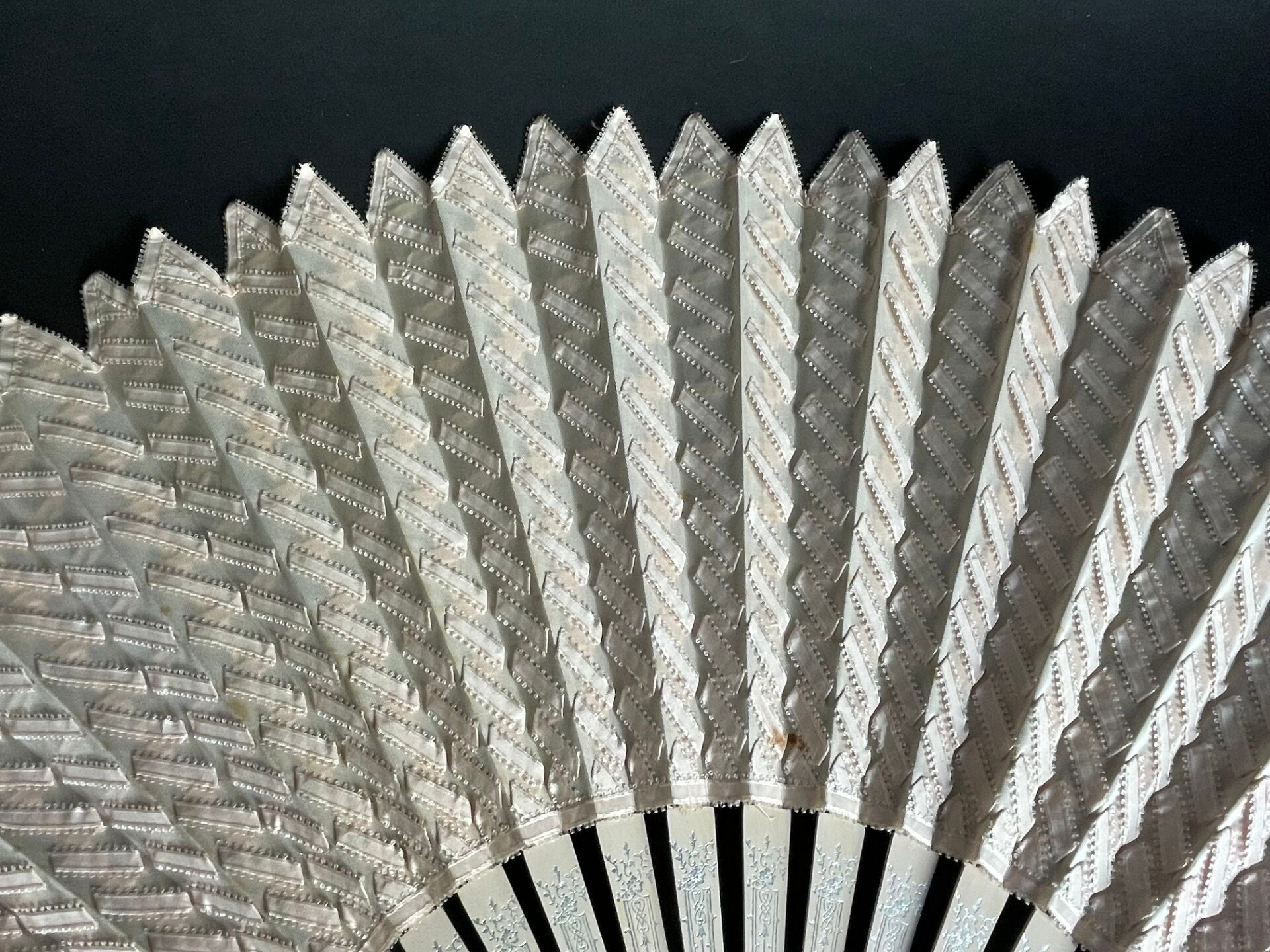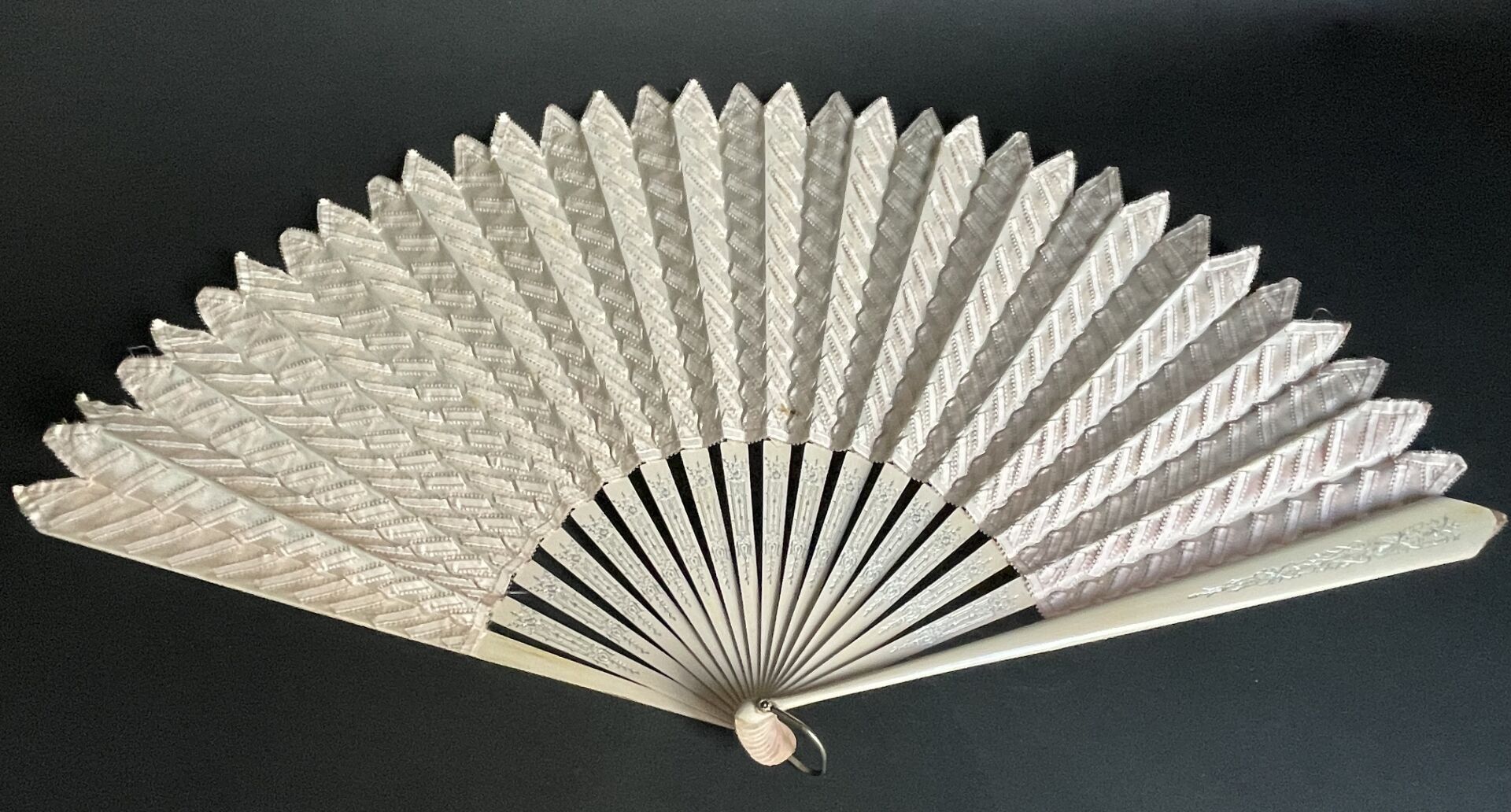 Folded fan, the powder pink satin leaf decorated with pink lacing.