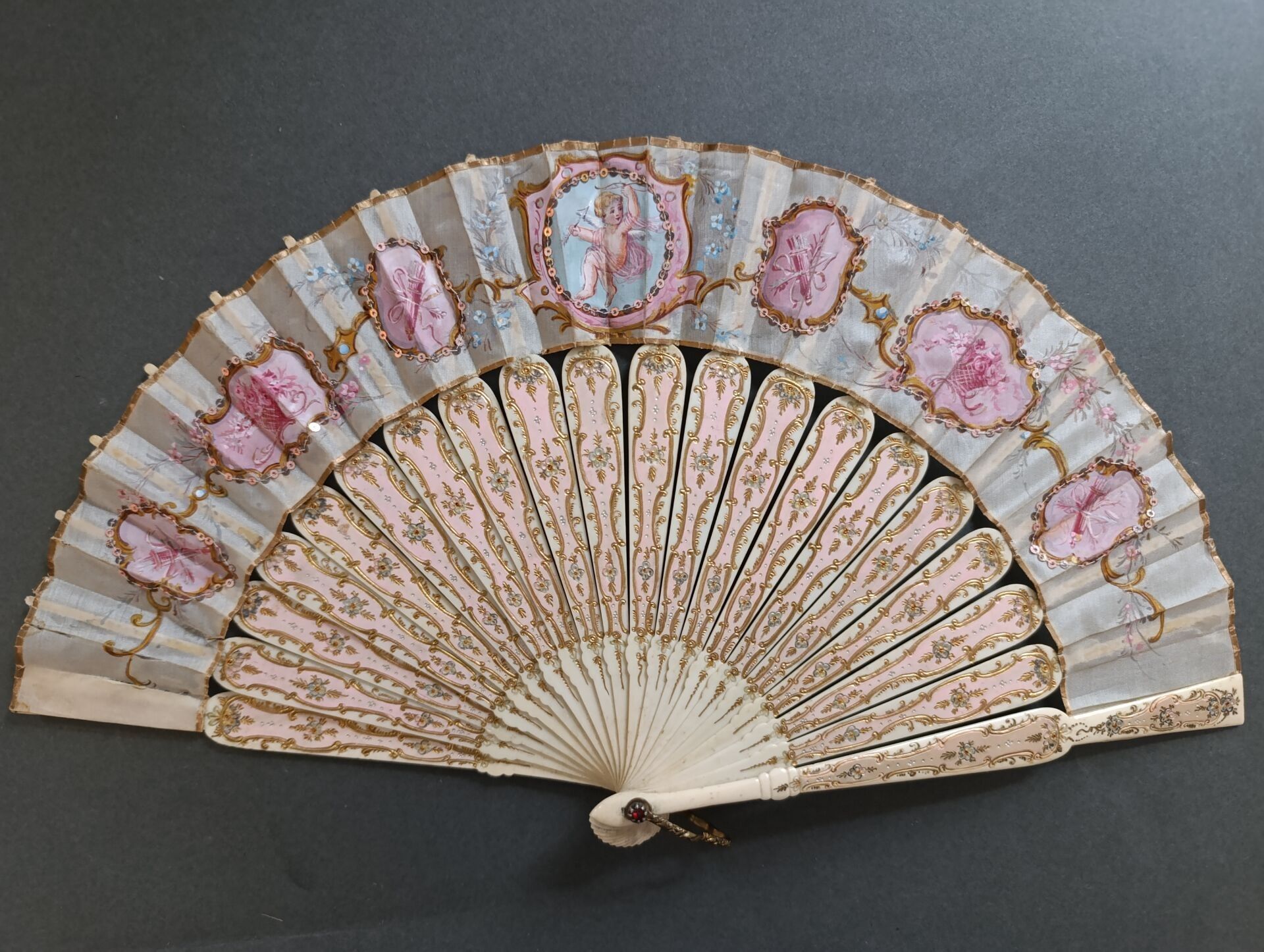 Folded fan for a little girl, the silk sheet is mounted in the English style and painted with six labels on the theme of Love.