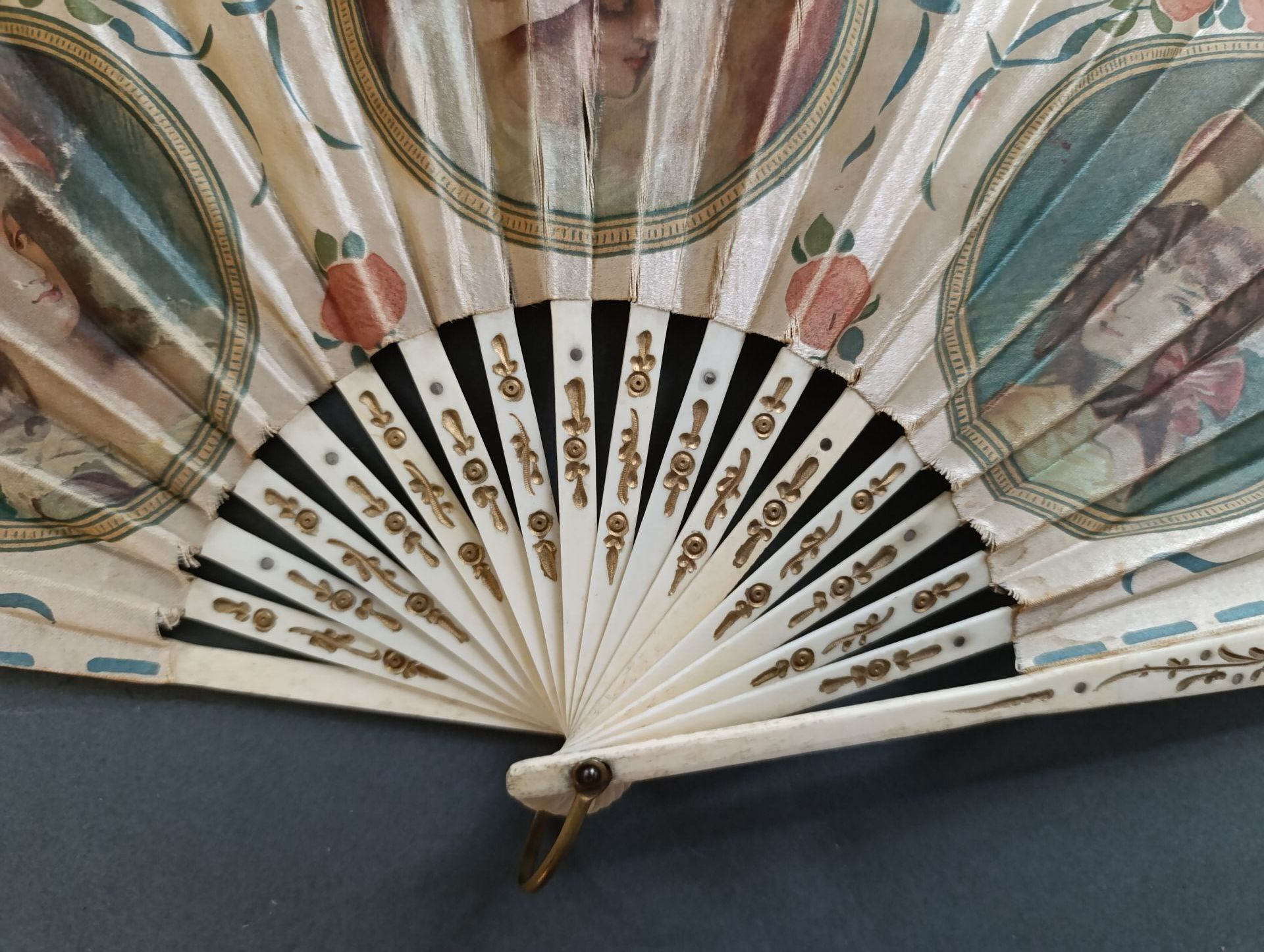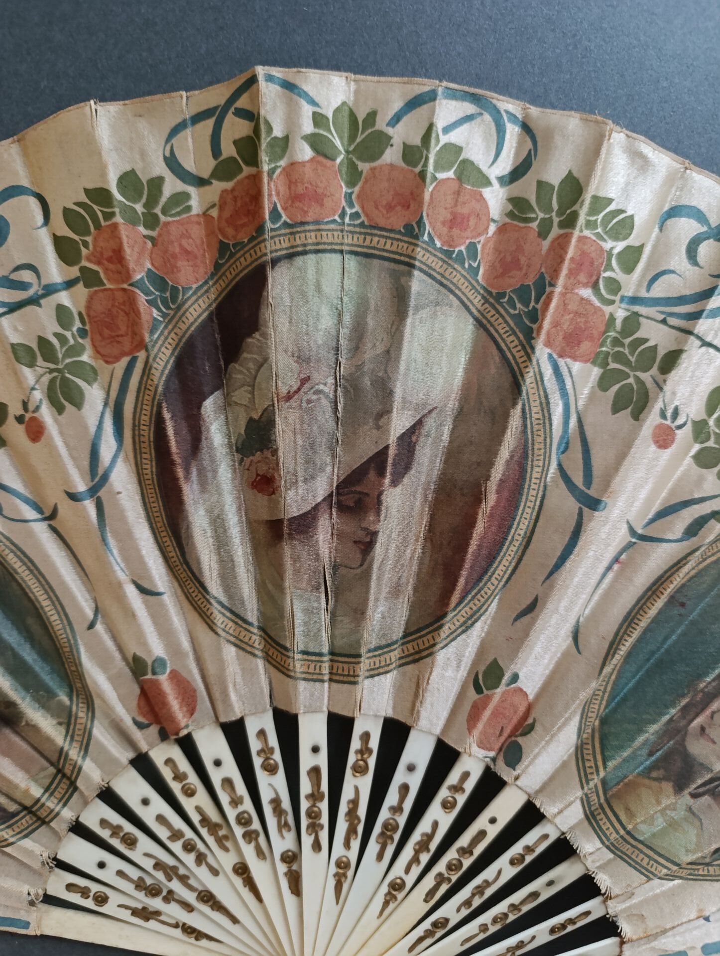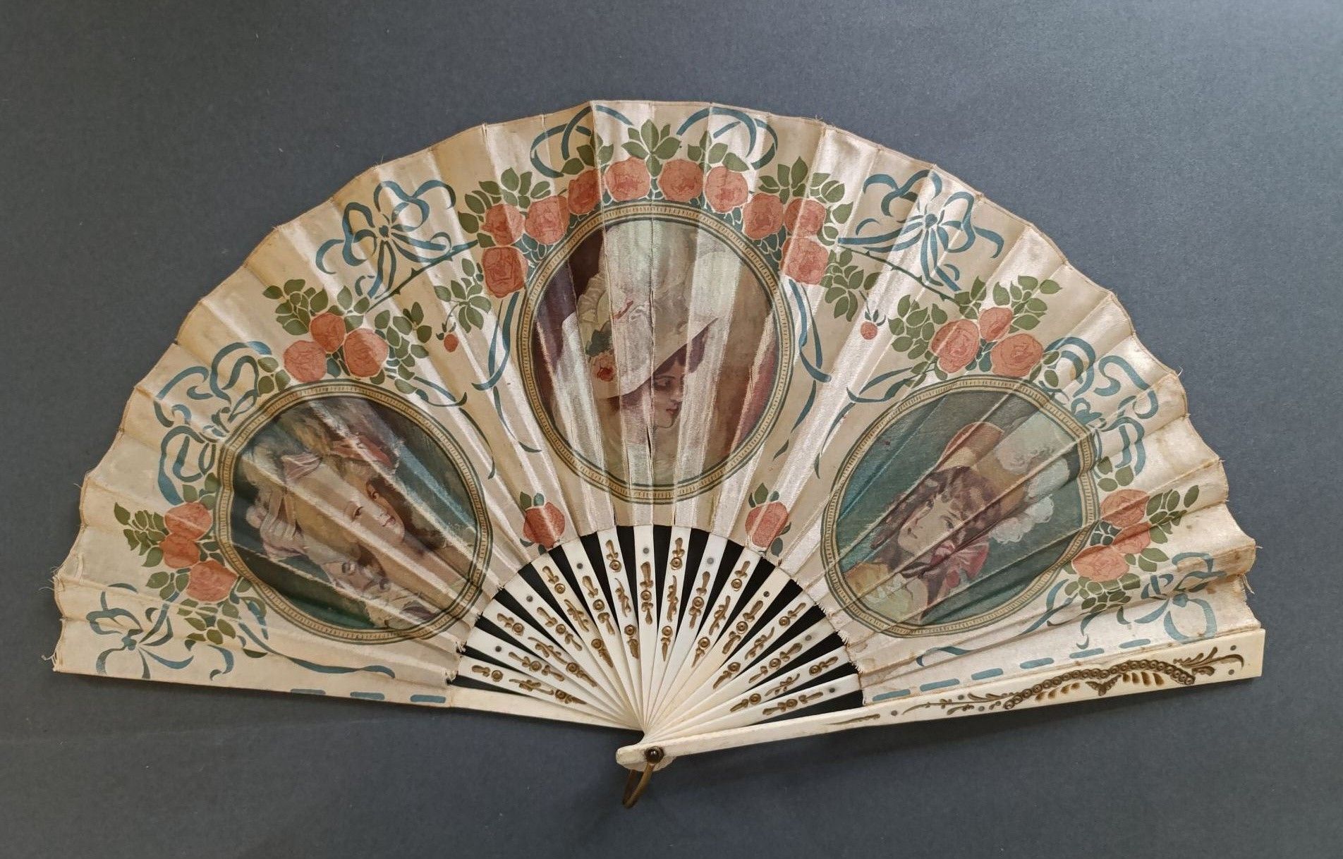 Folded fan, silk sheet, printed with three bust portraits of elegant women wearing hats.