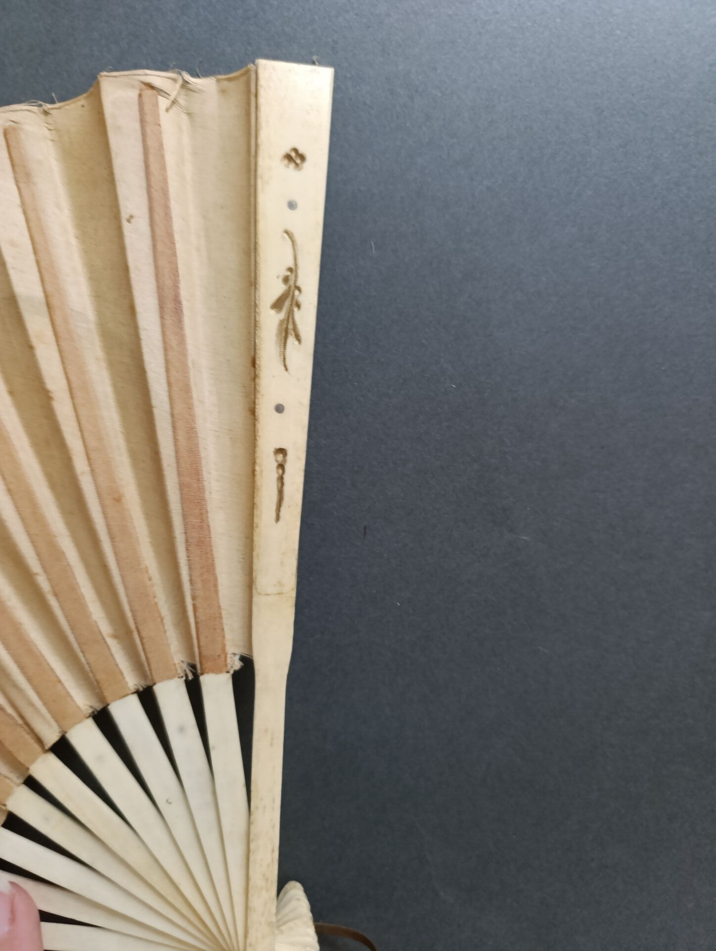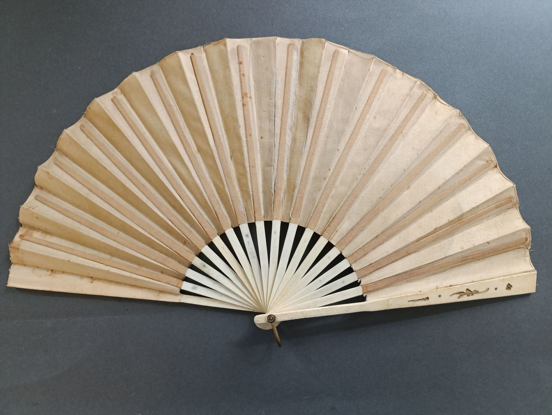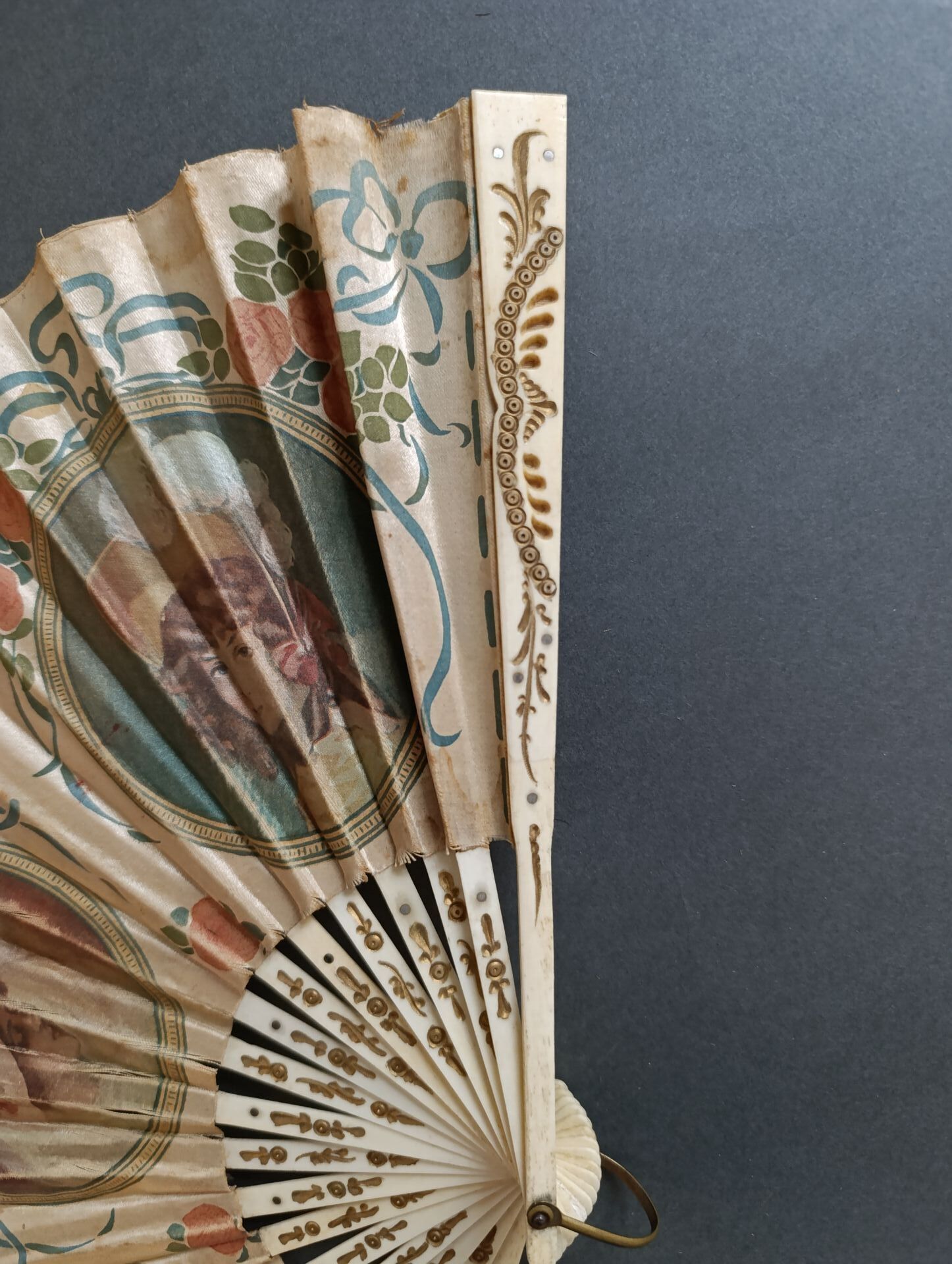 Folded fan, silk sheet, printed with three bust portraits of elegant women wearing hats.