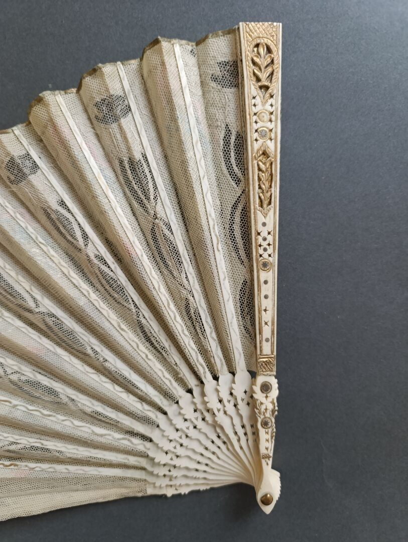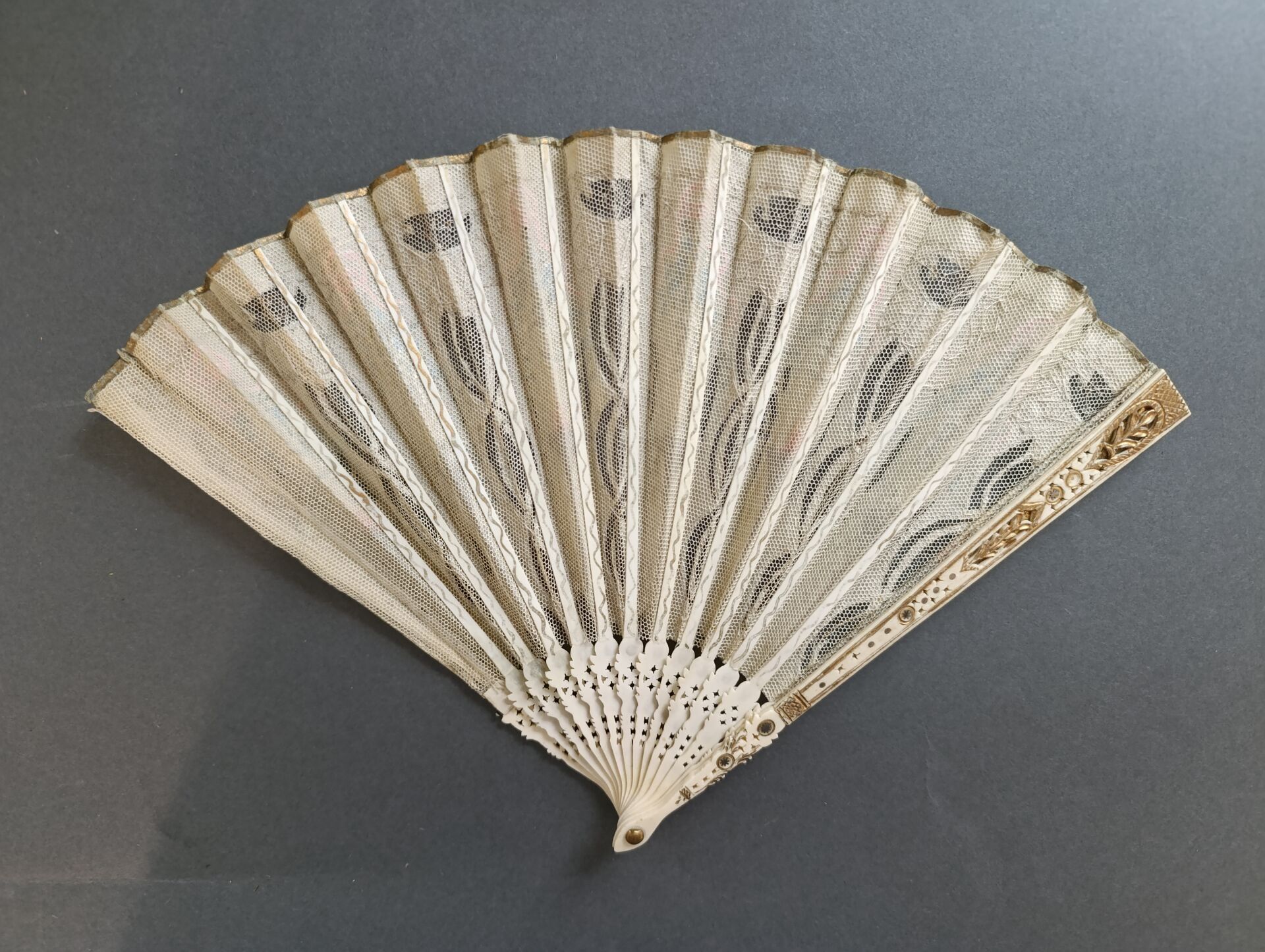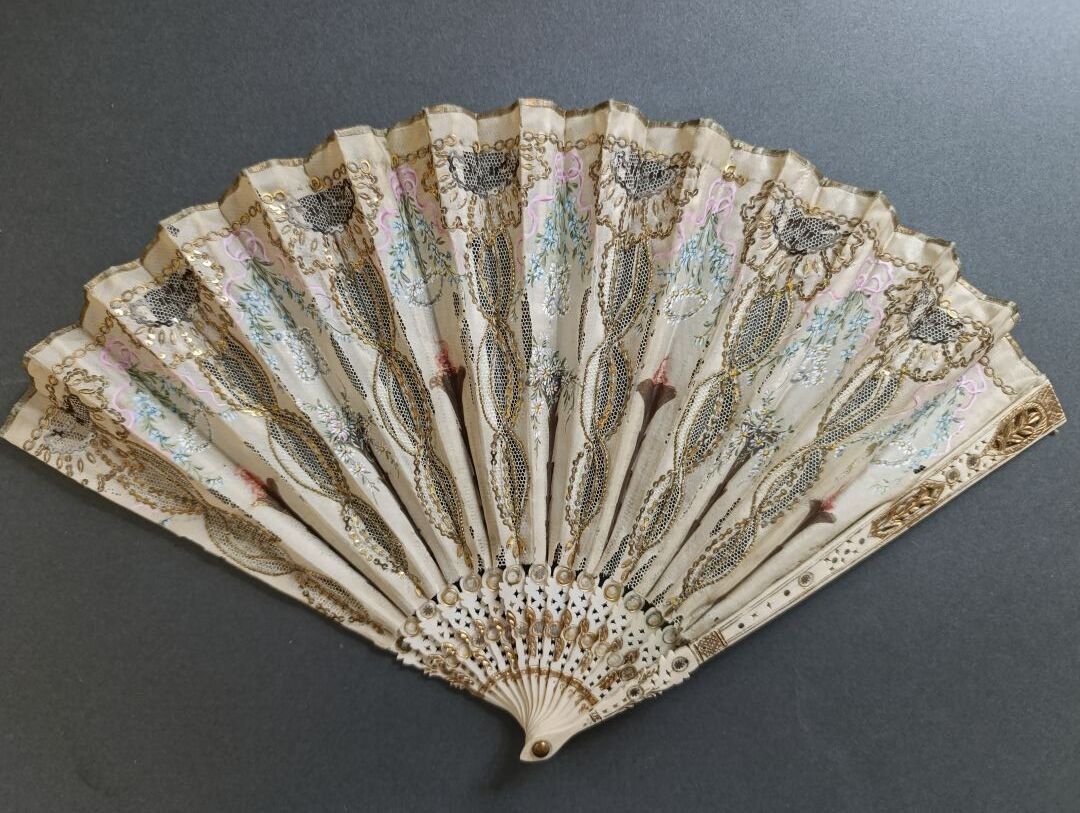 Folded fan, silk leaf, animated with tulle windows, enhanced with sequins, and painted with torches, ribbons and flowers.