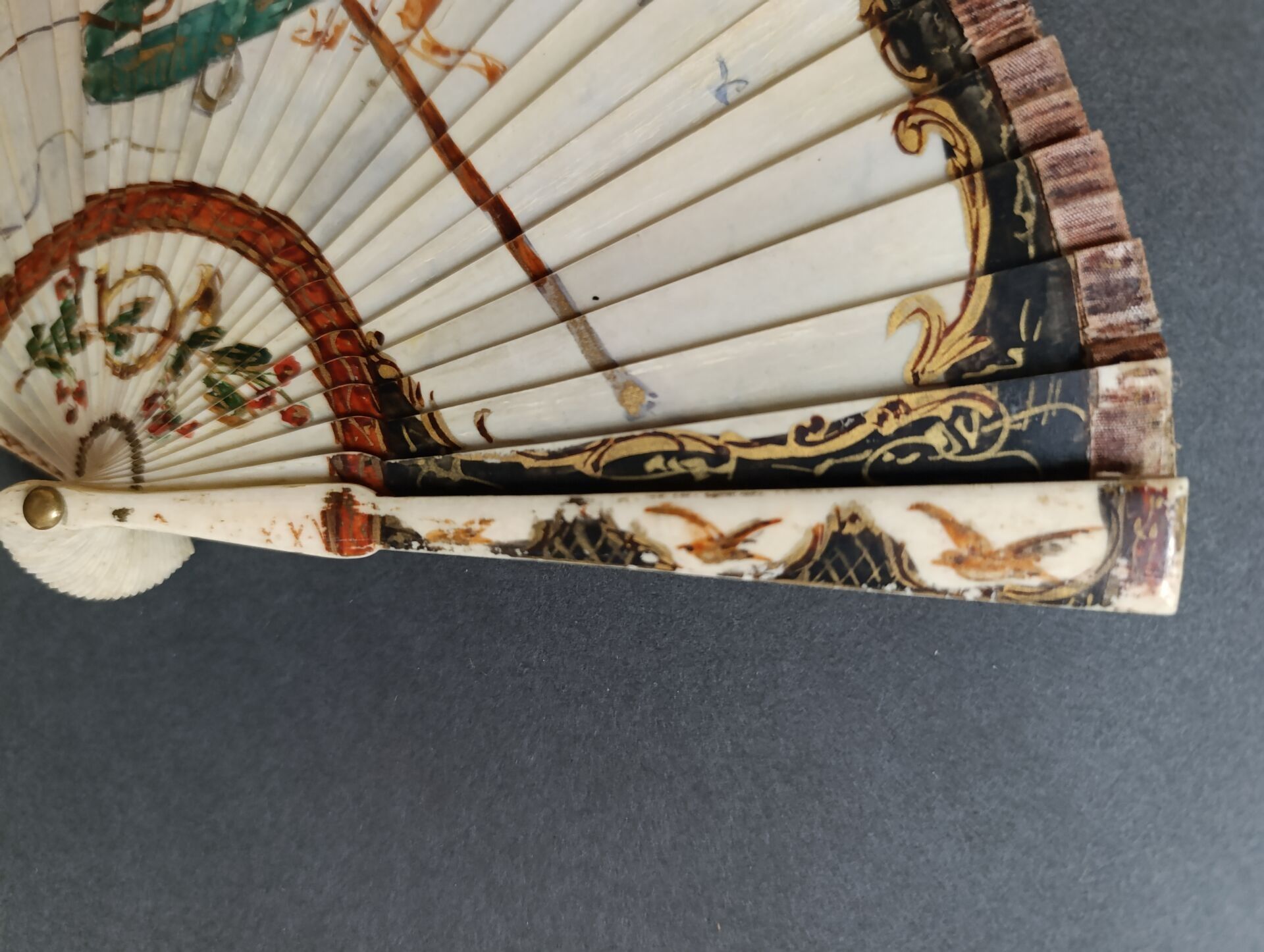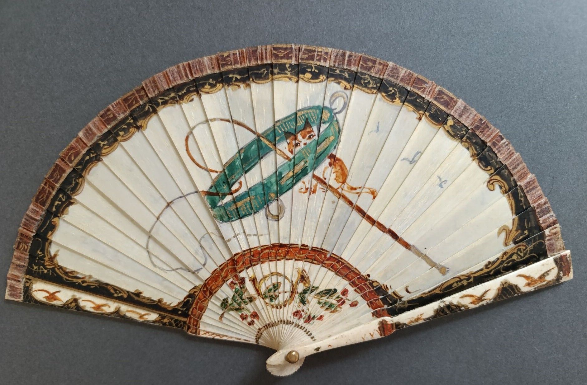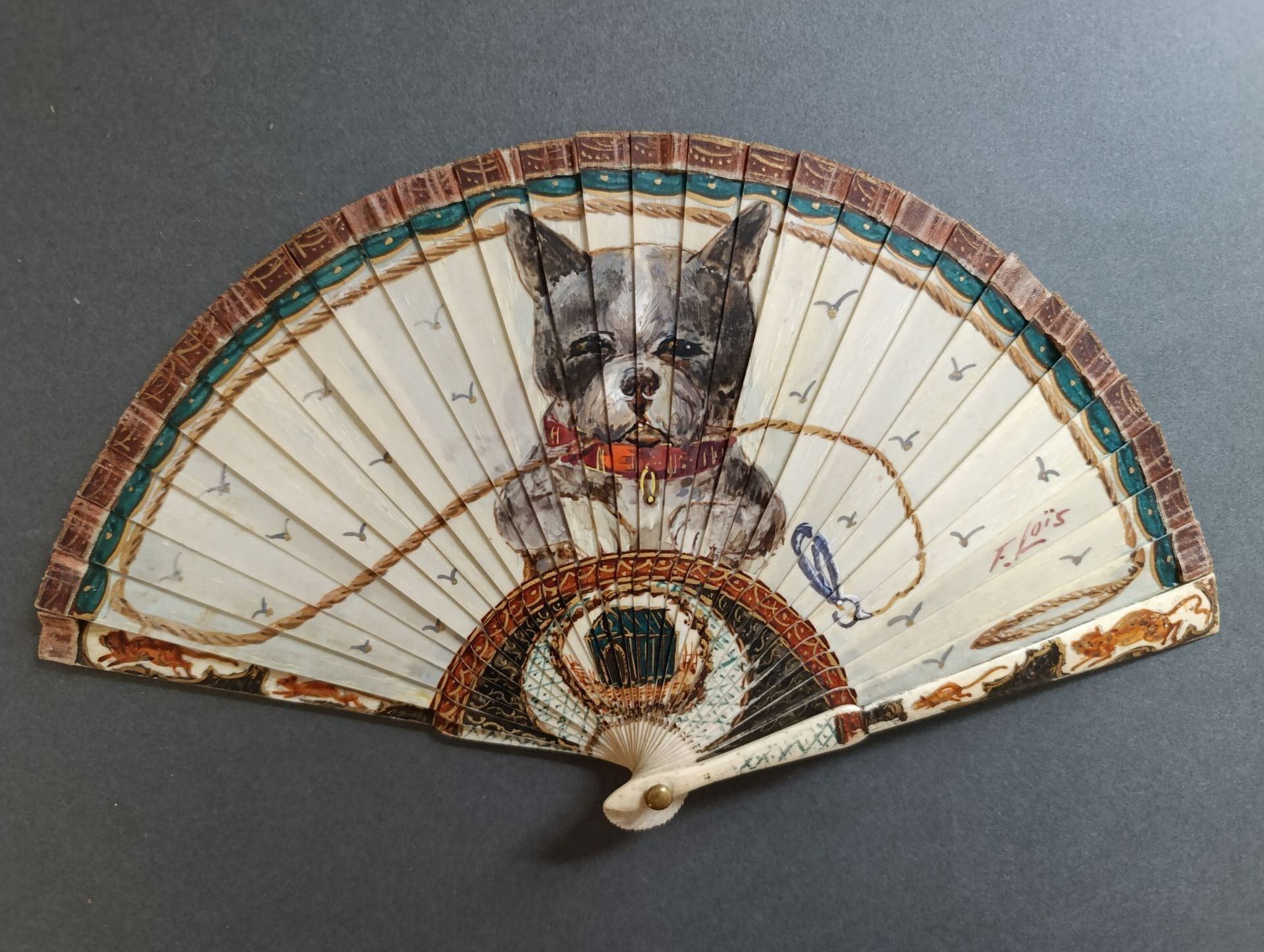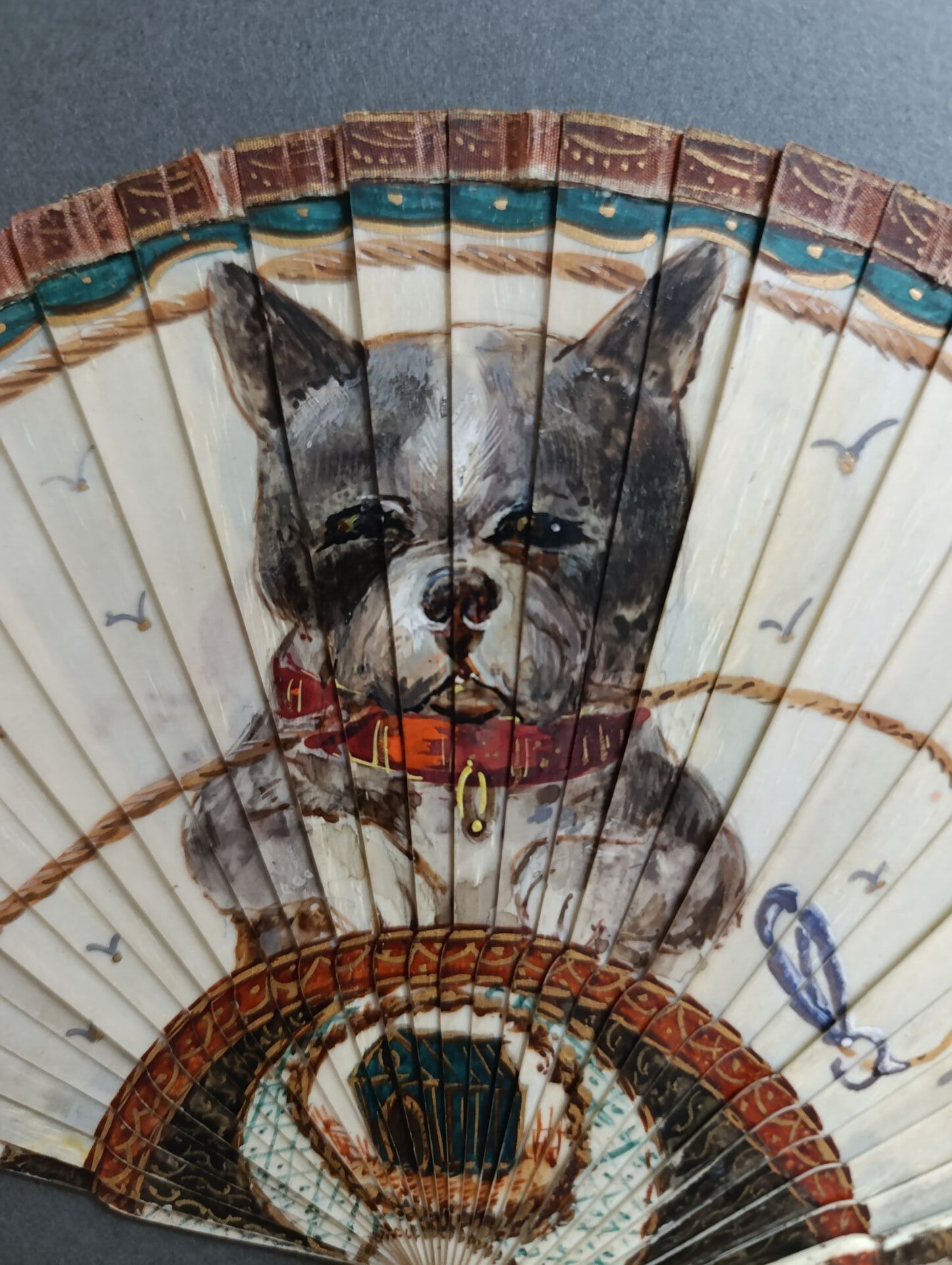 A broken bone fan painted with a portrait of a dog holding its leash in its mouth.