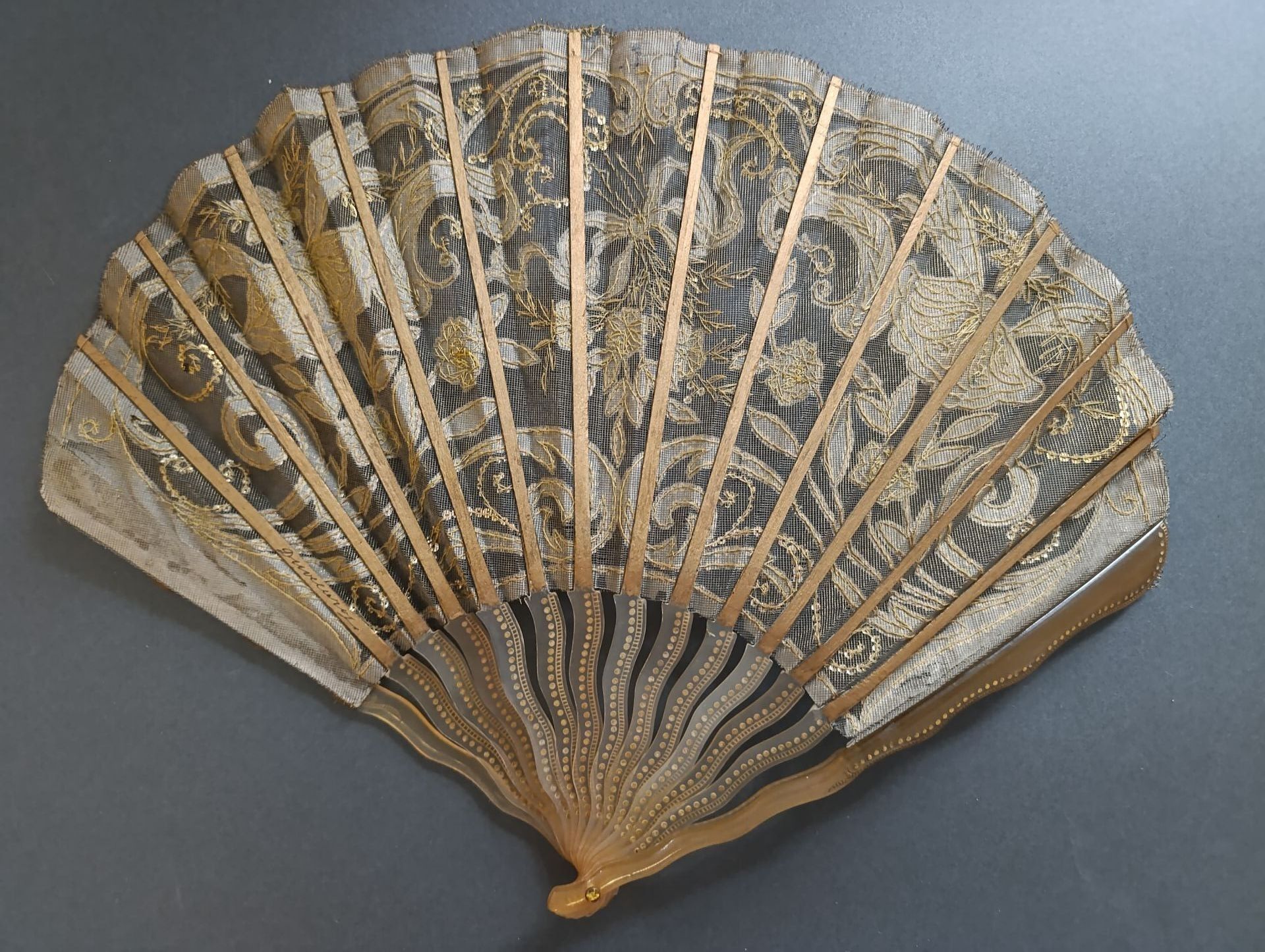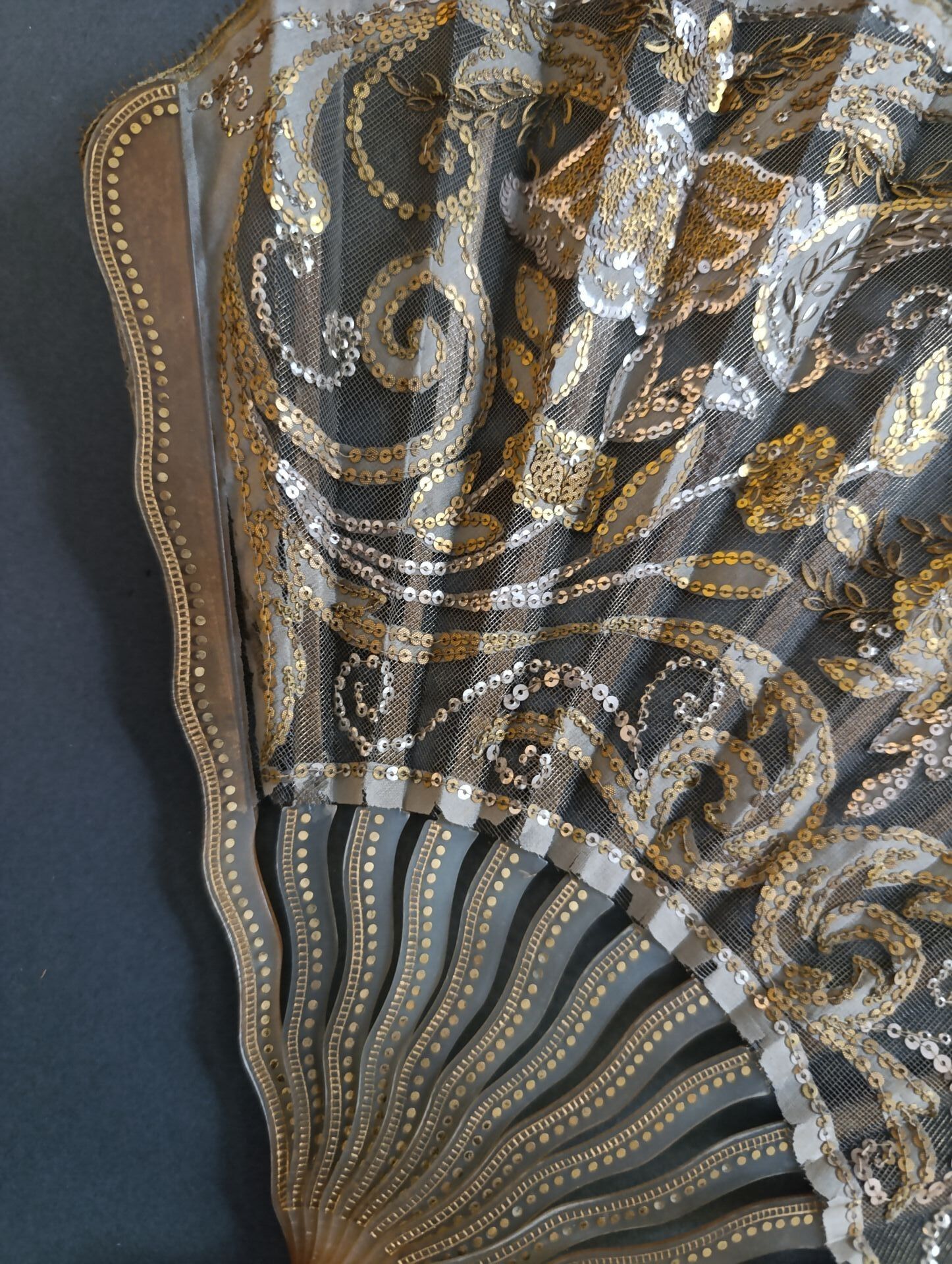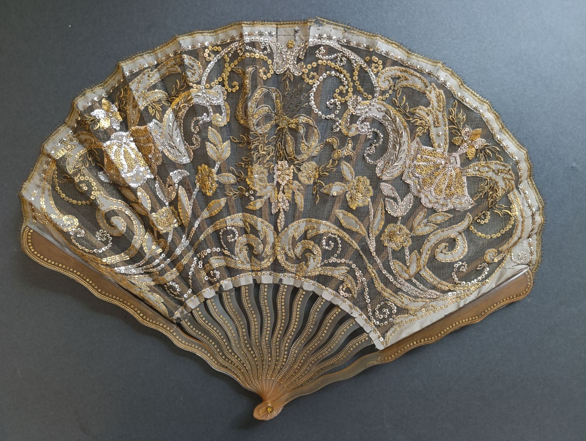 A folded, balloon-shaped fan with a tulle leaf embroidered with sequins depicting scrolls and flowers surrounding a bouquet hanging from a ribbon in the centre.