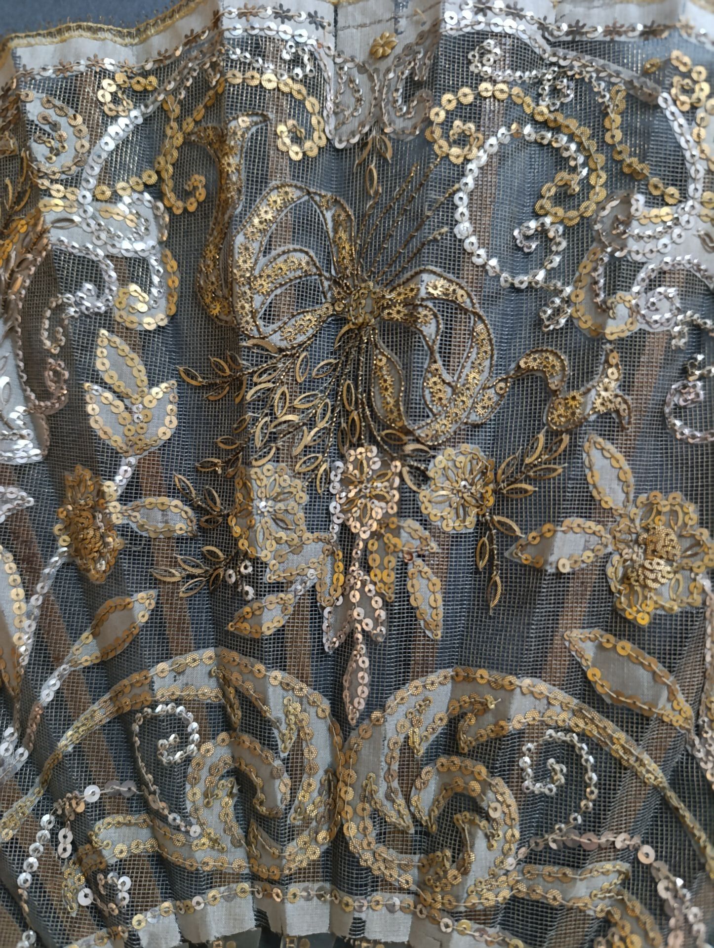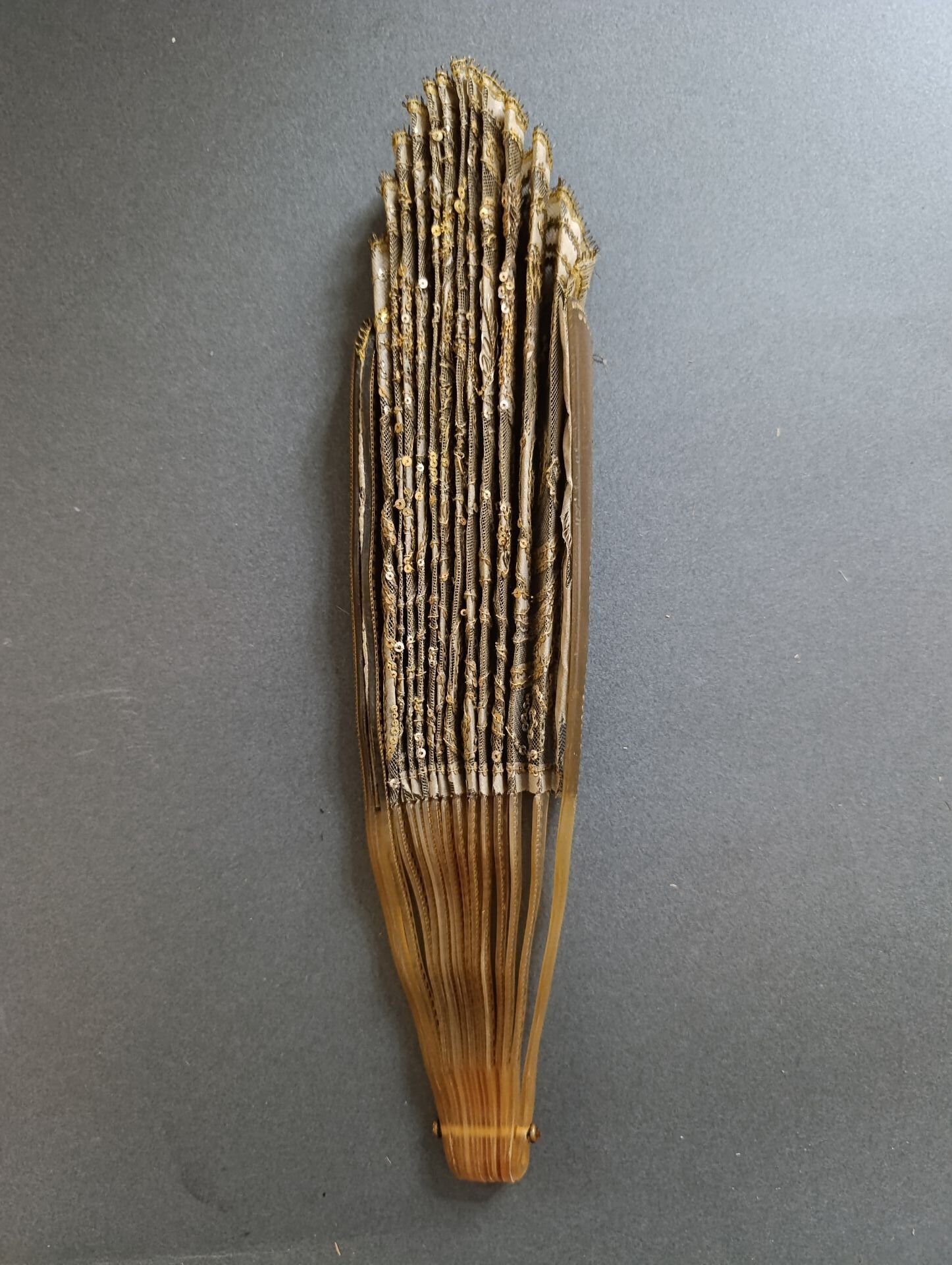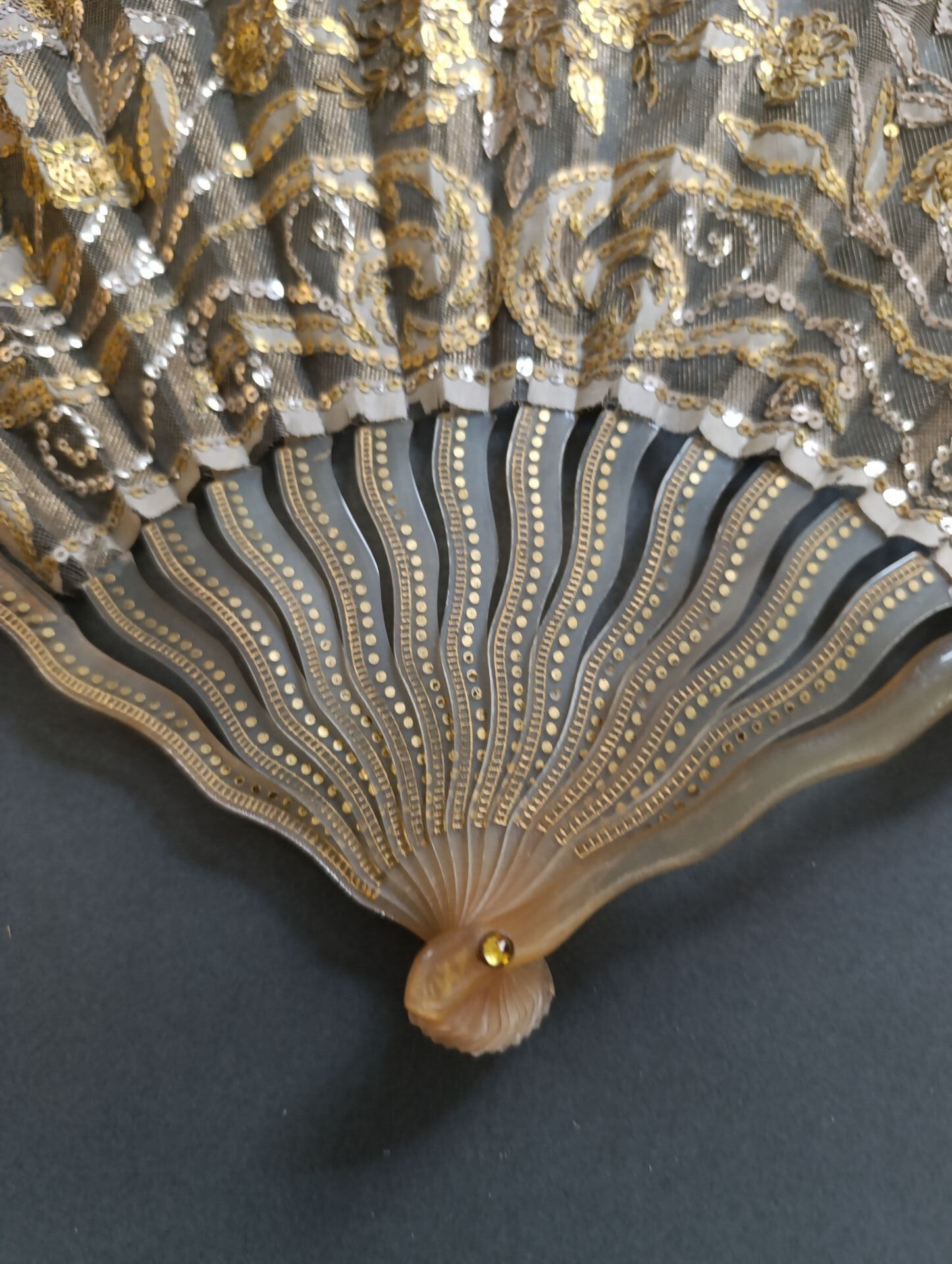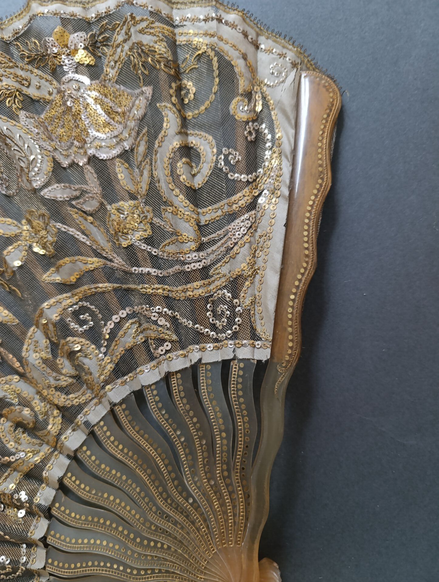 A folded, balloon-shaped fan with a tulle leaf embroidered with sequins depicting scrolls and flowers surrounding a bouquet hanging from a ribbon in the centre.