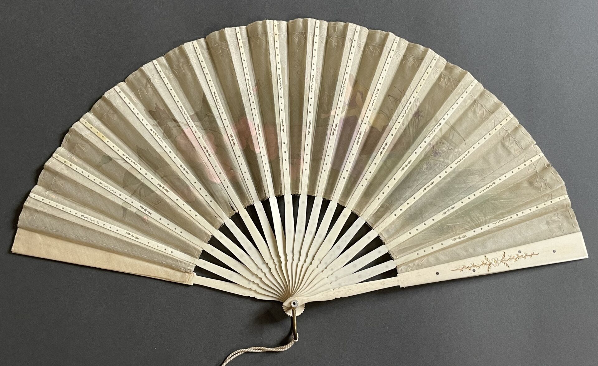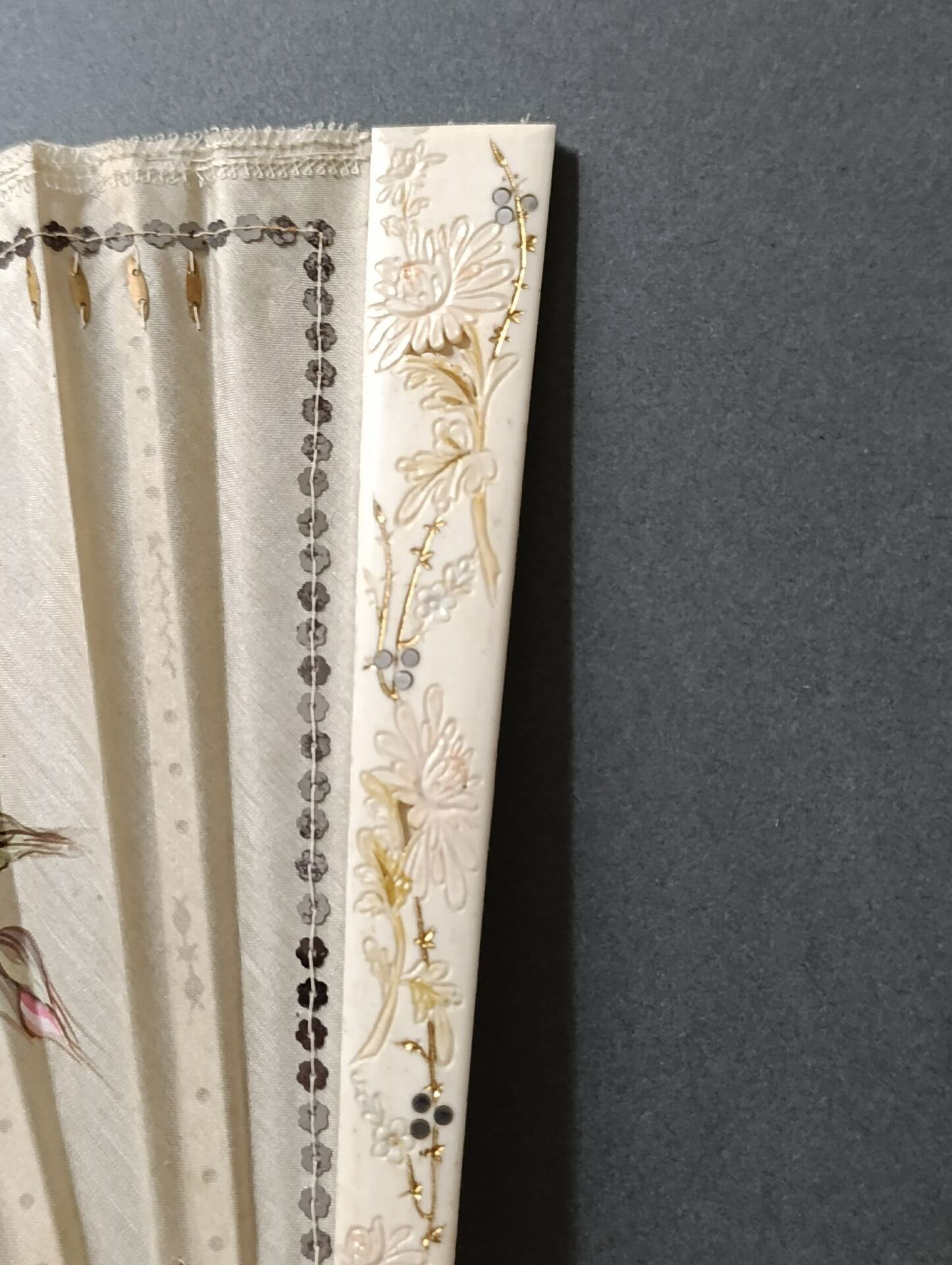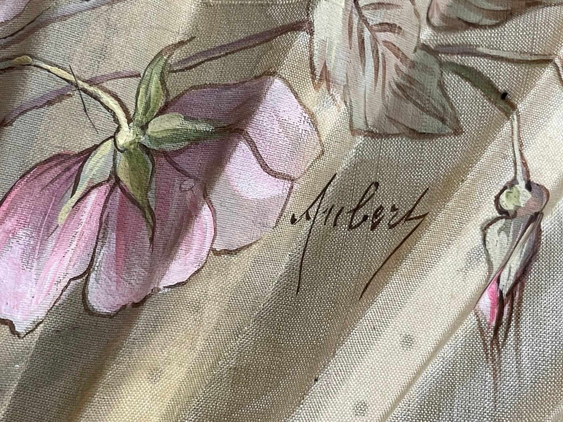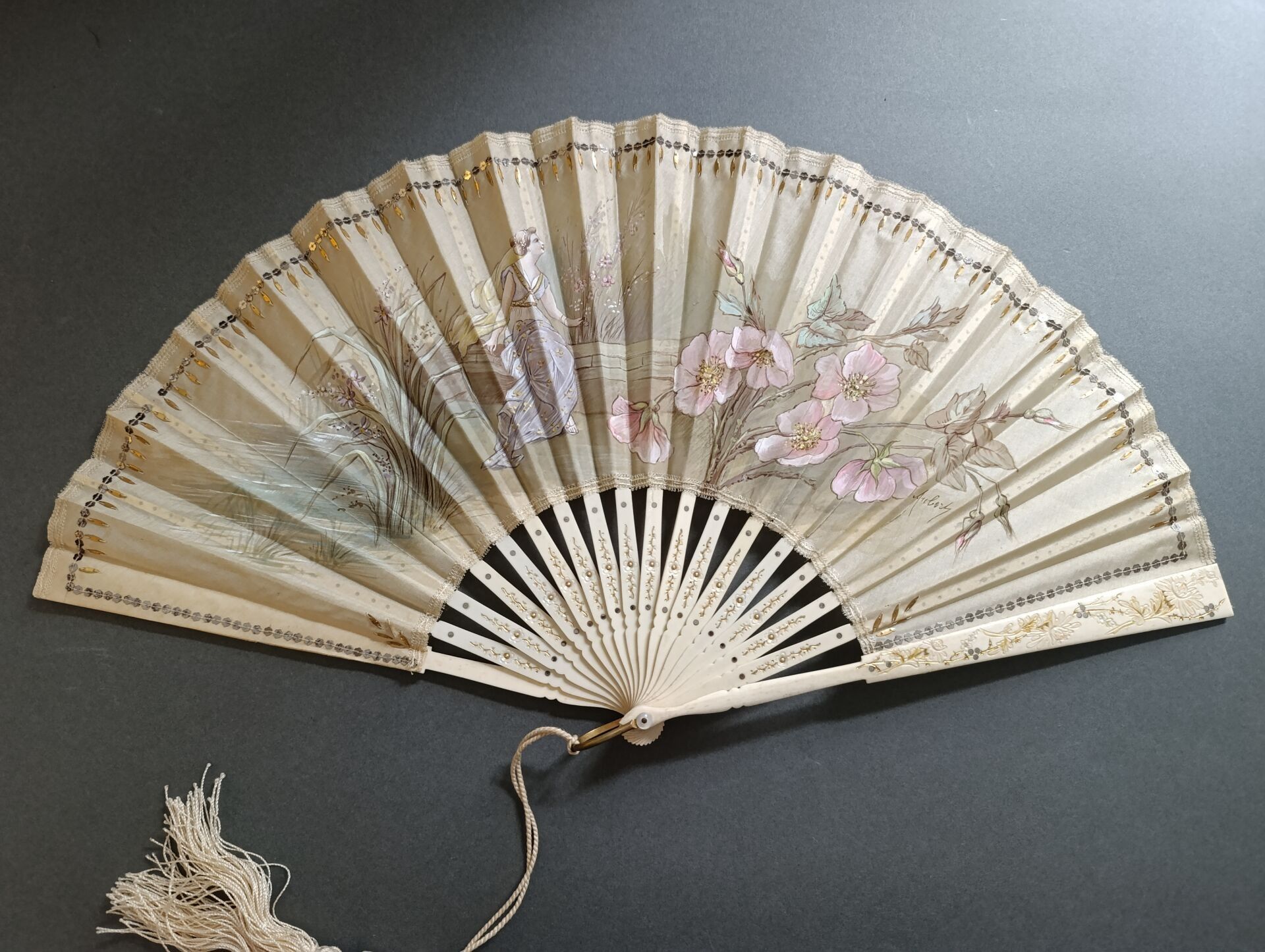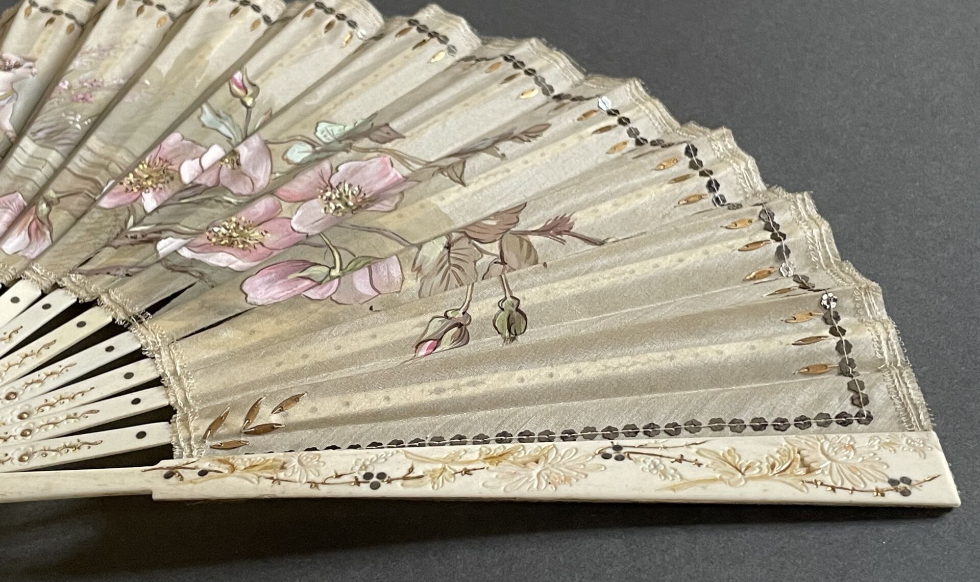 Folded fan, the silk leaf painted with a young woman next to a bouquet of rosehips in bloom. Signed "Aubert" on the right.
