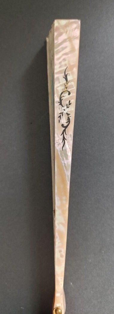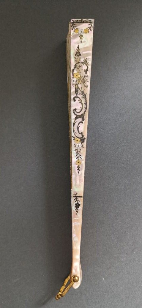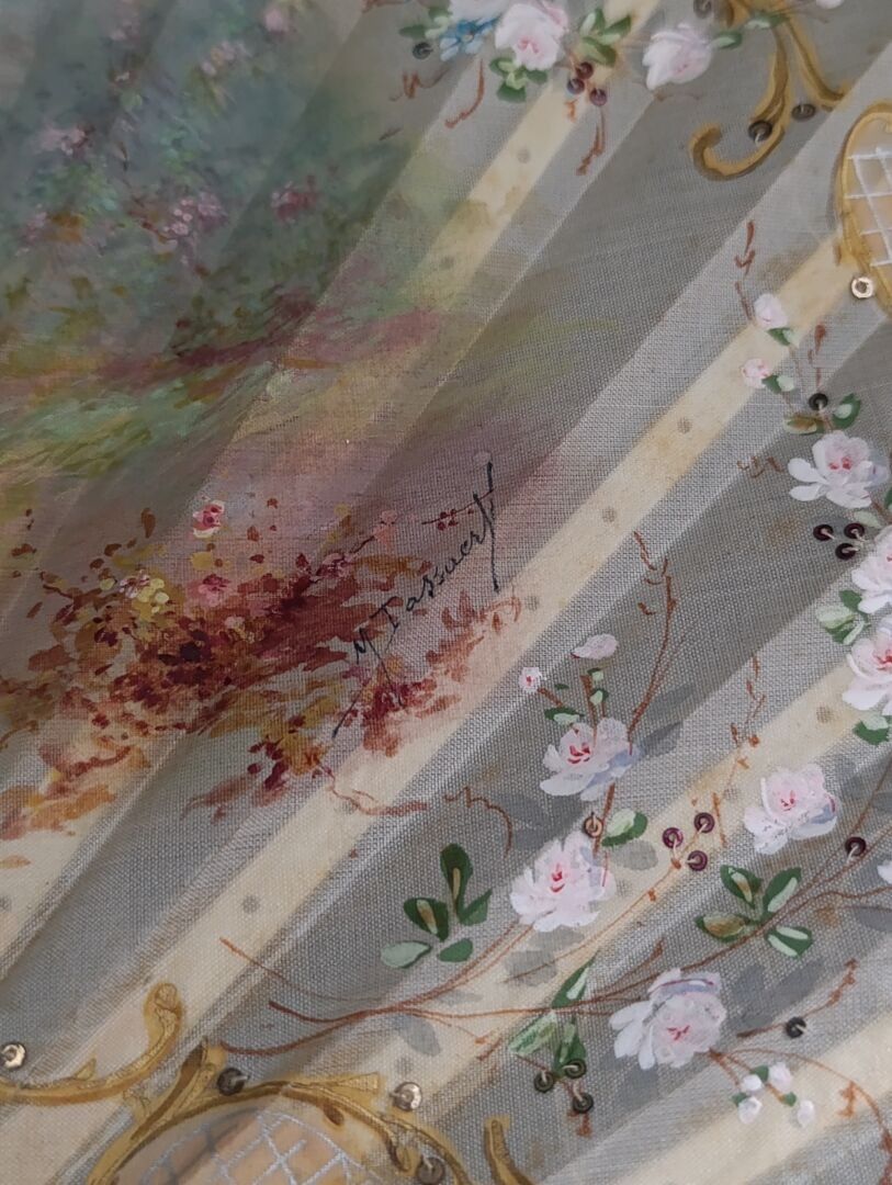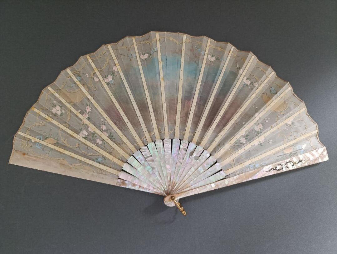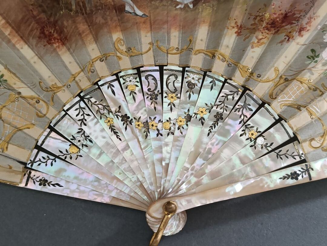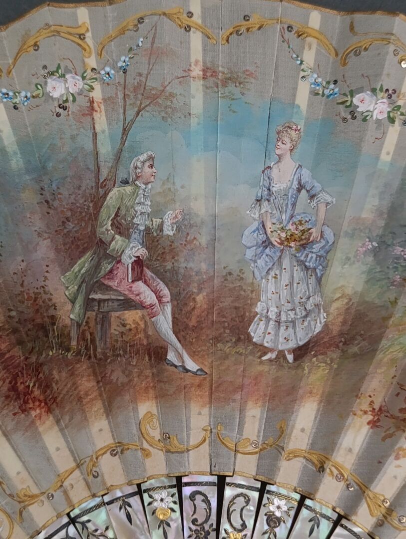 Folded fan, the silk leaf painted in the 18th century style of a couple in a country setting.