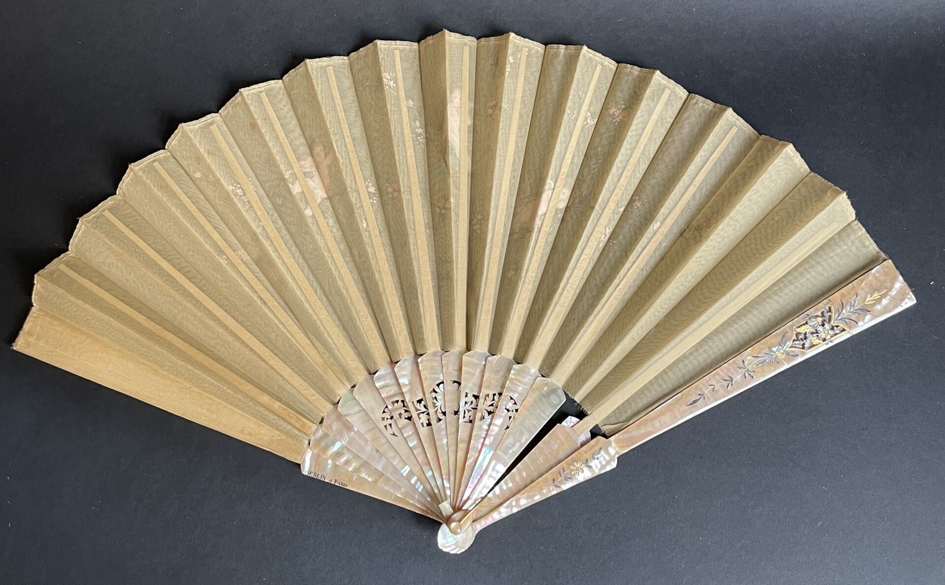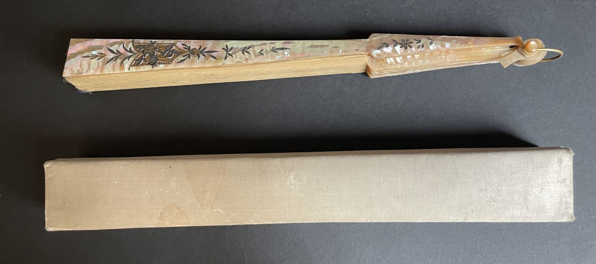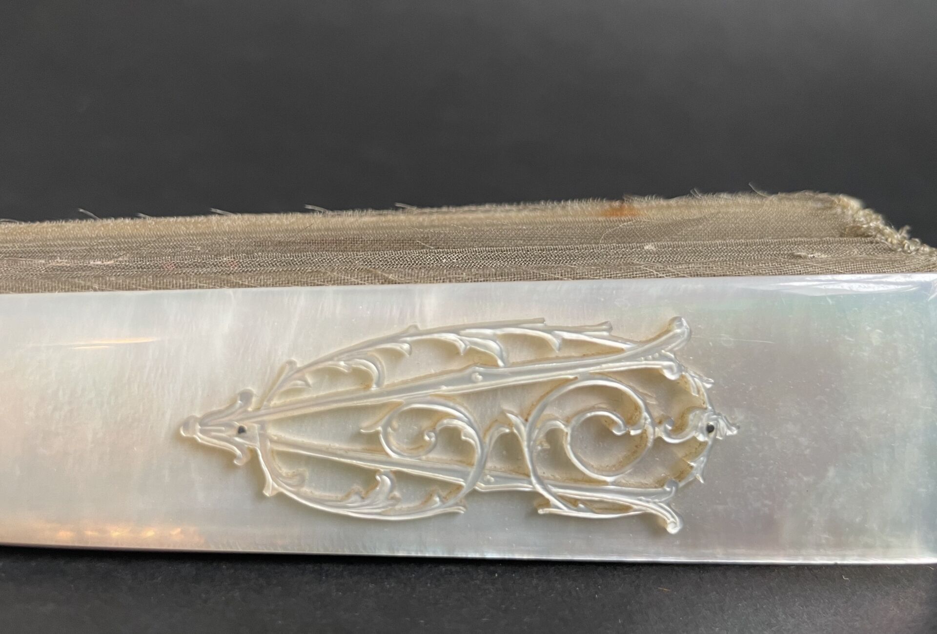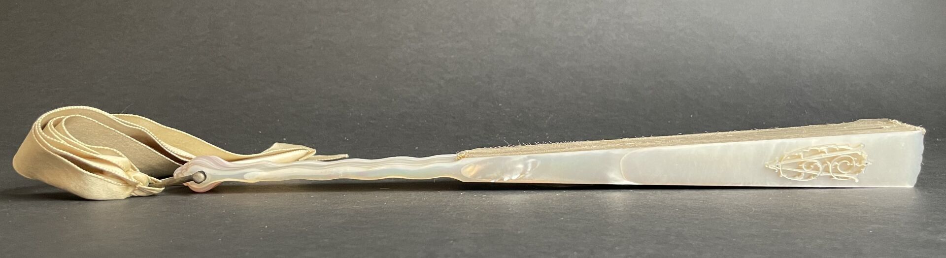 Mounted in white mother-of-pearl with serpentine strands. The plume is embellished with a numeral. Brace and silk ribbon.