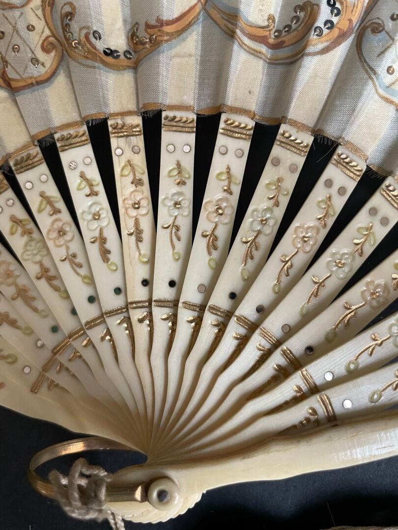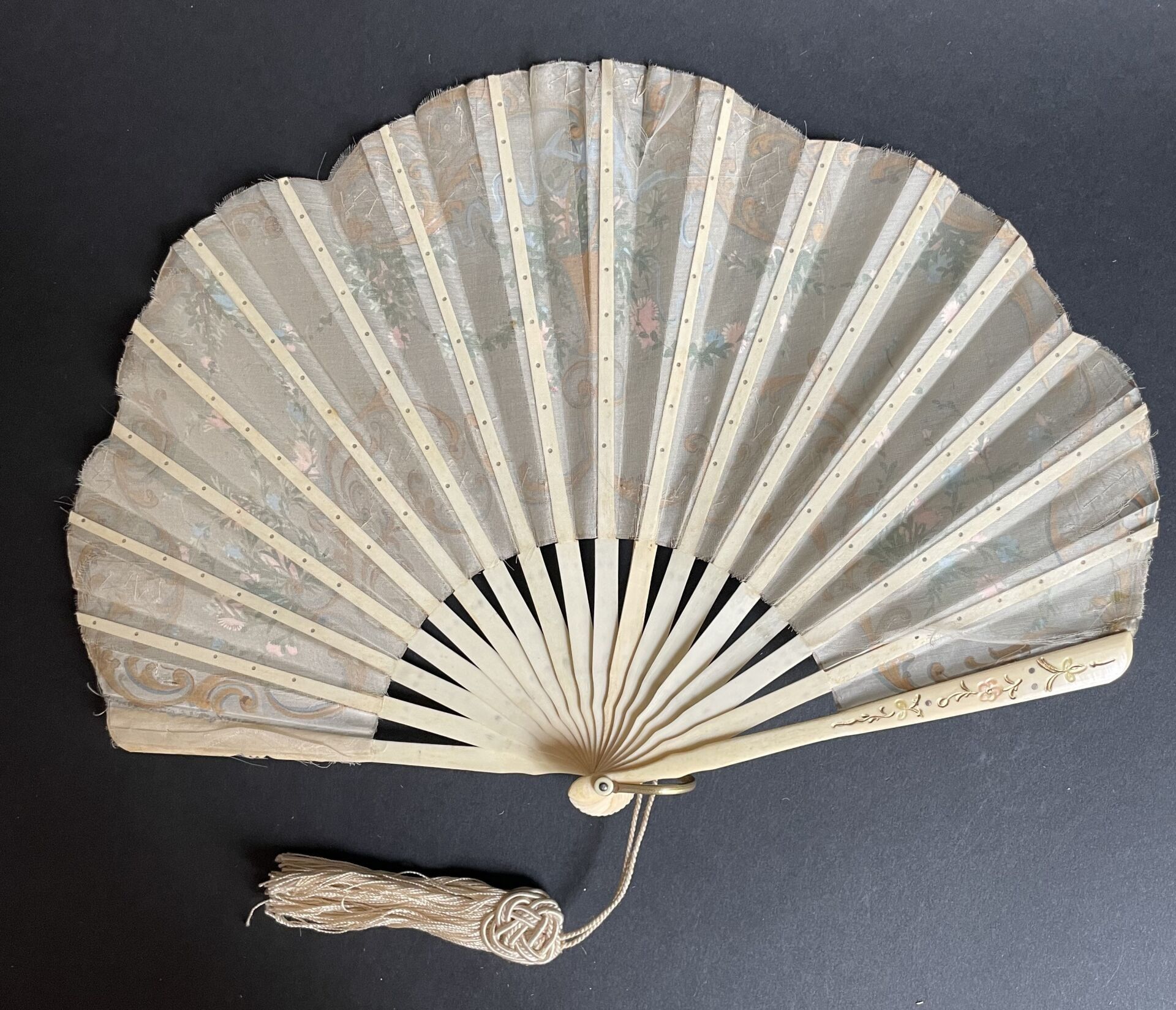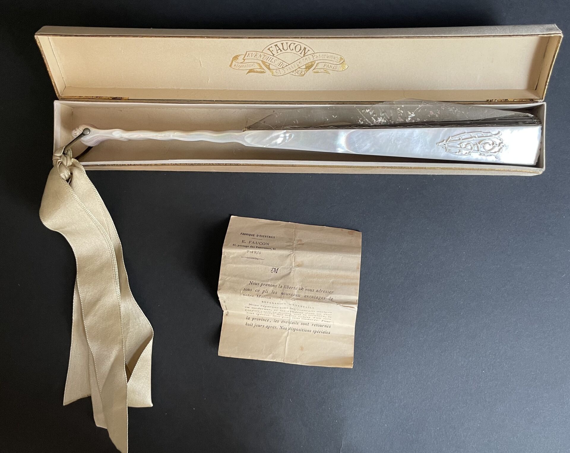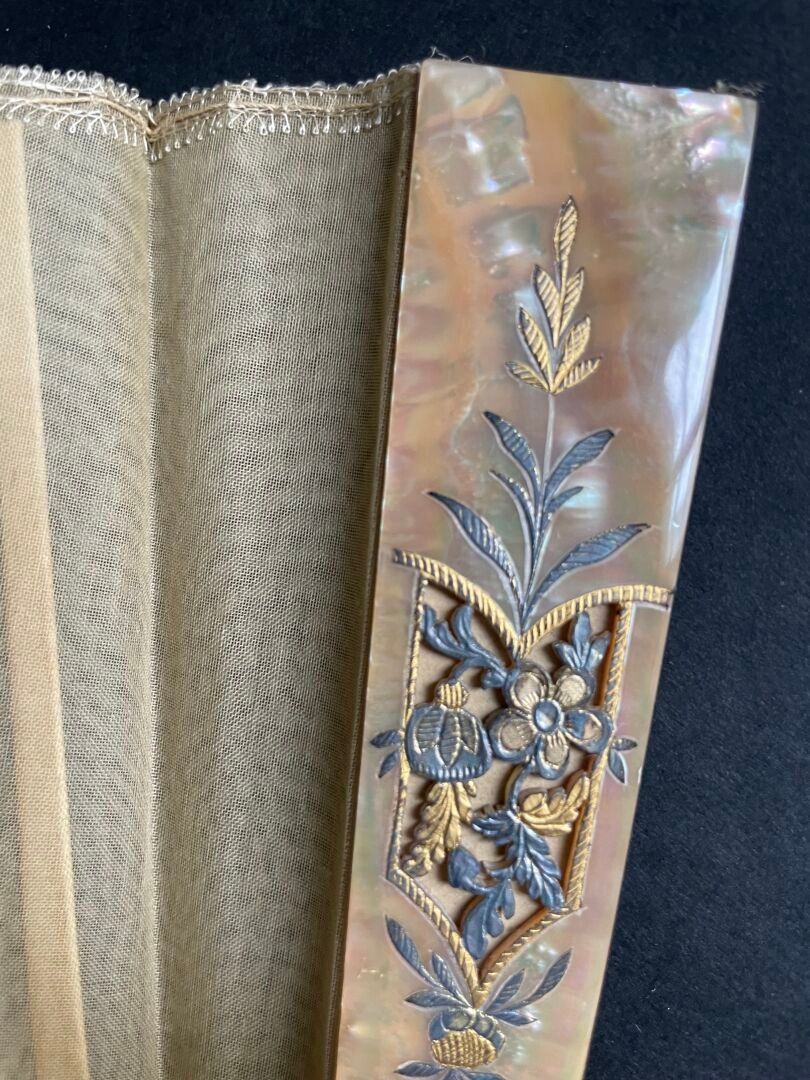 Mounted in white mother-of-pearl with serpentine strands. The plume is embellished with a numeral. Brace and silk ribbon.