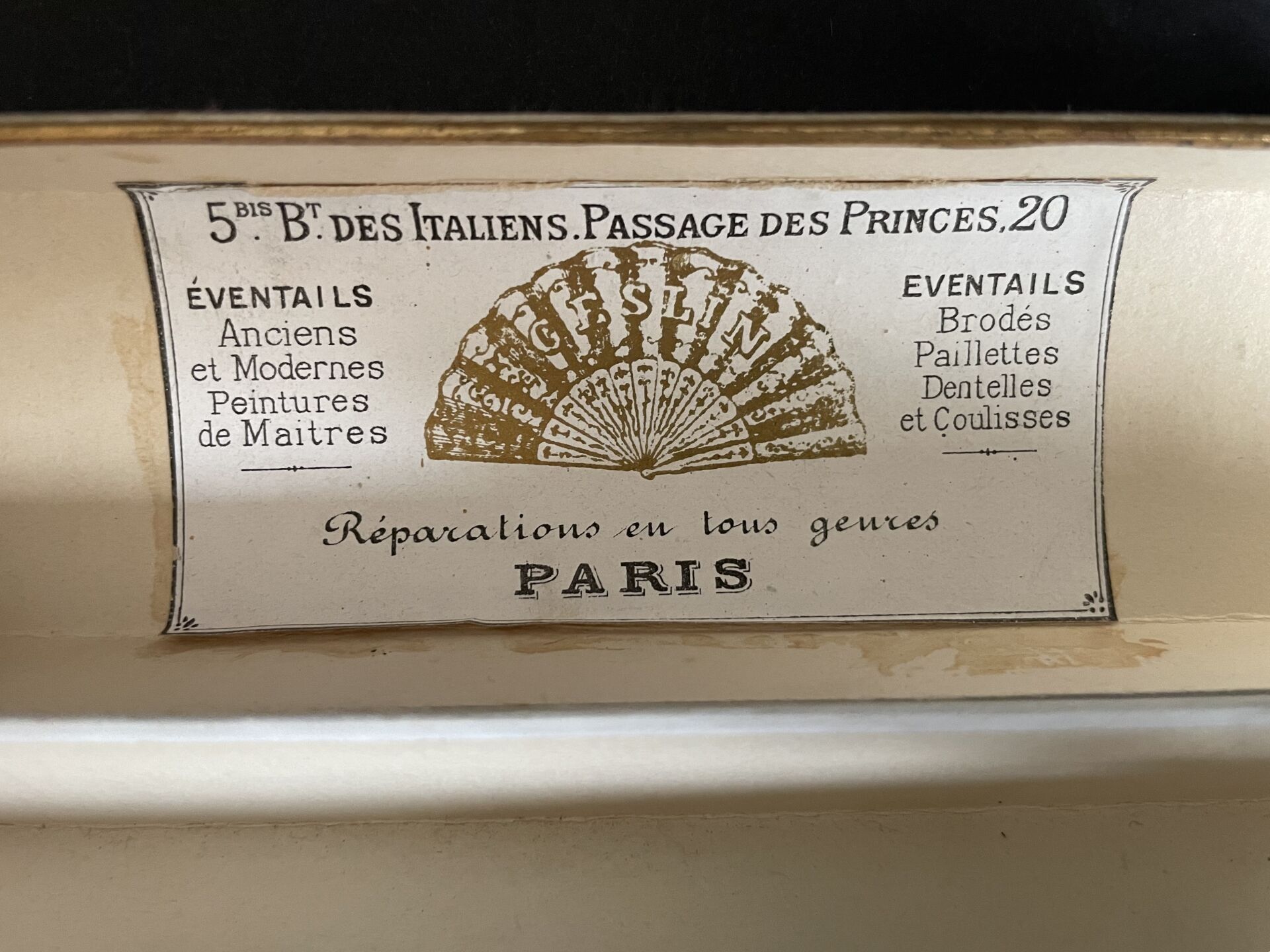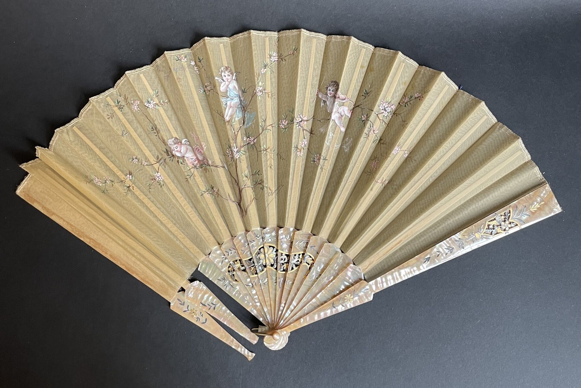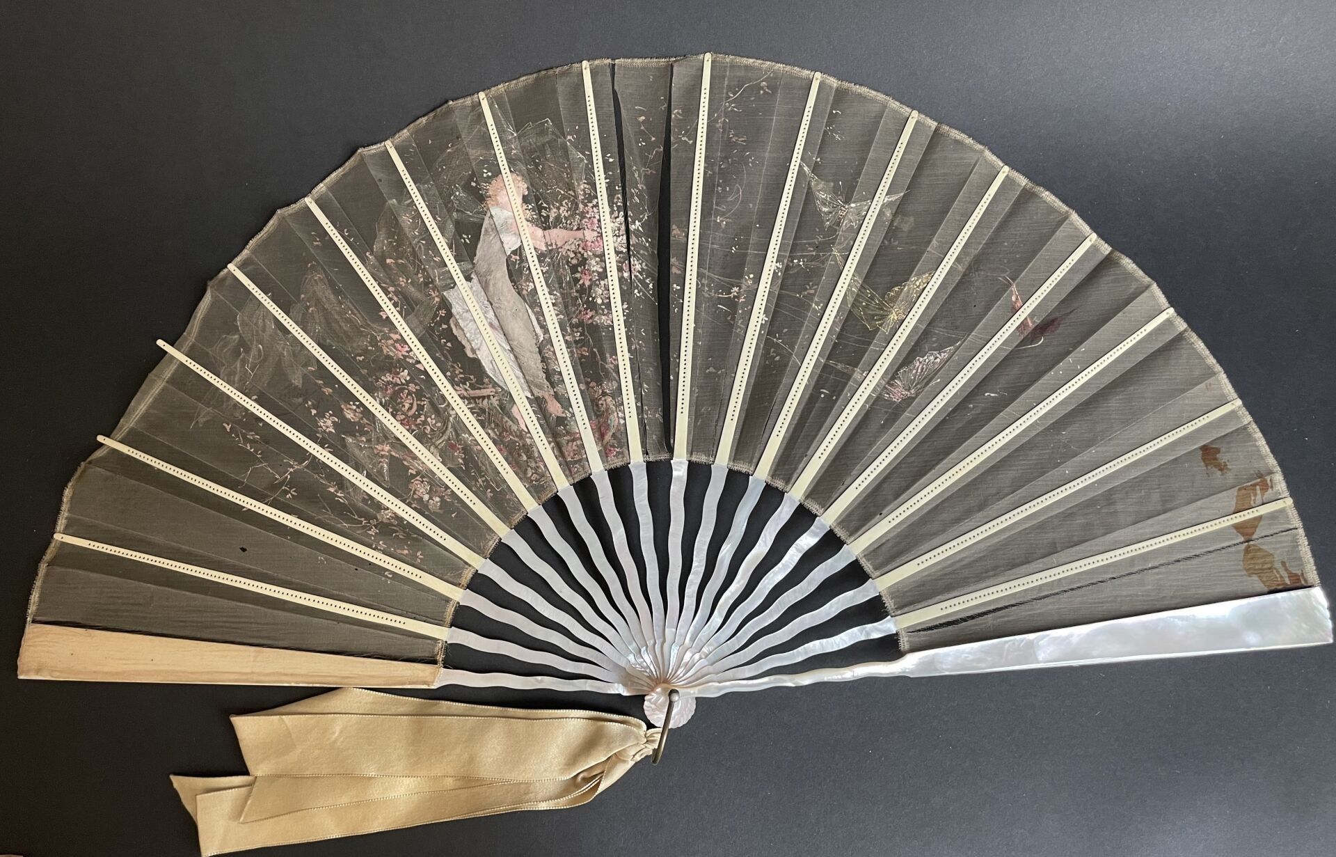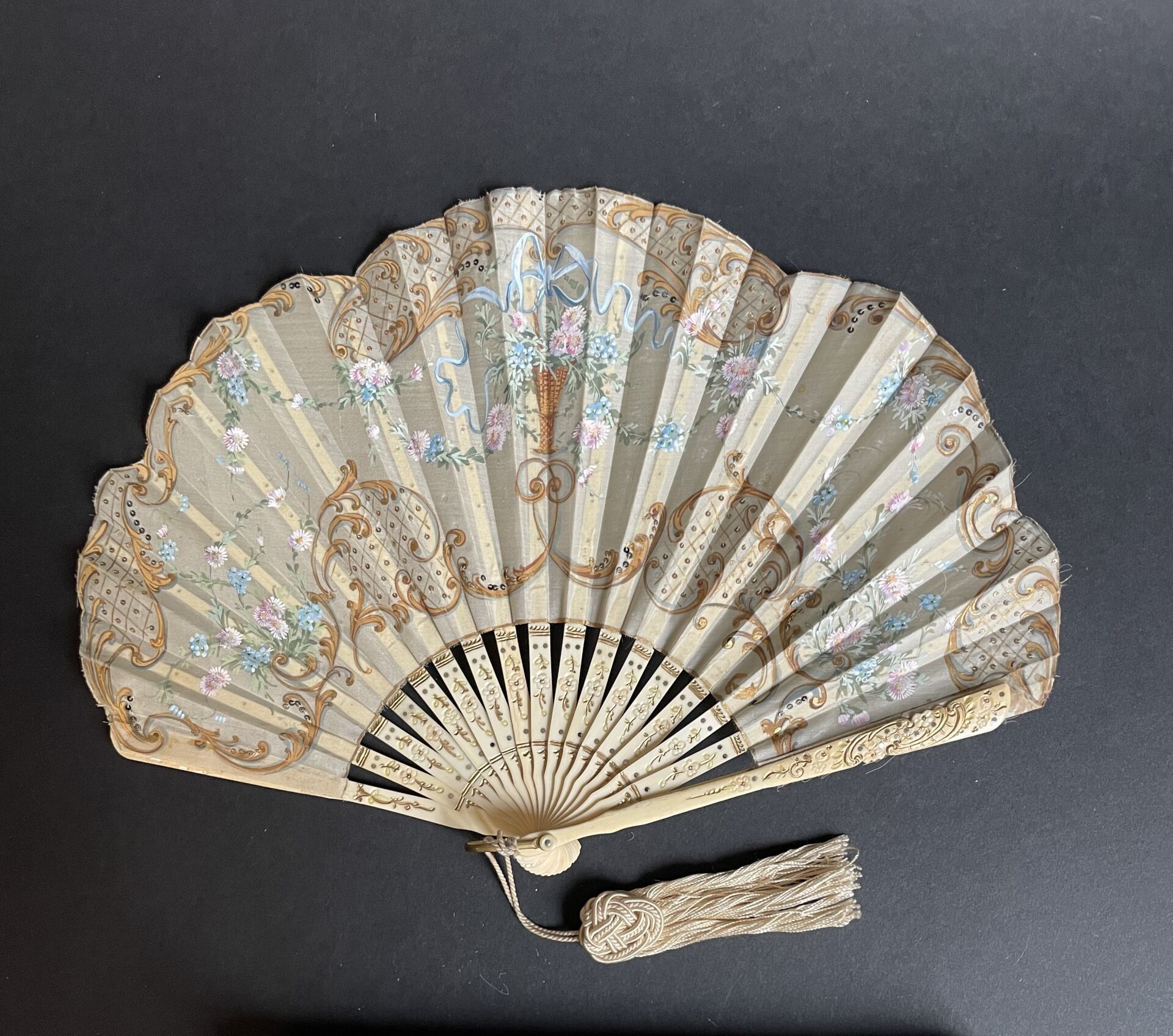 Mounted in white mother-of-pearl with serpentine strands. The plume is embellished with a numeral. Brace and silk ribbon.