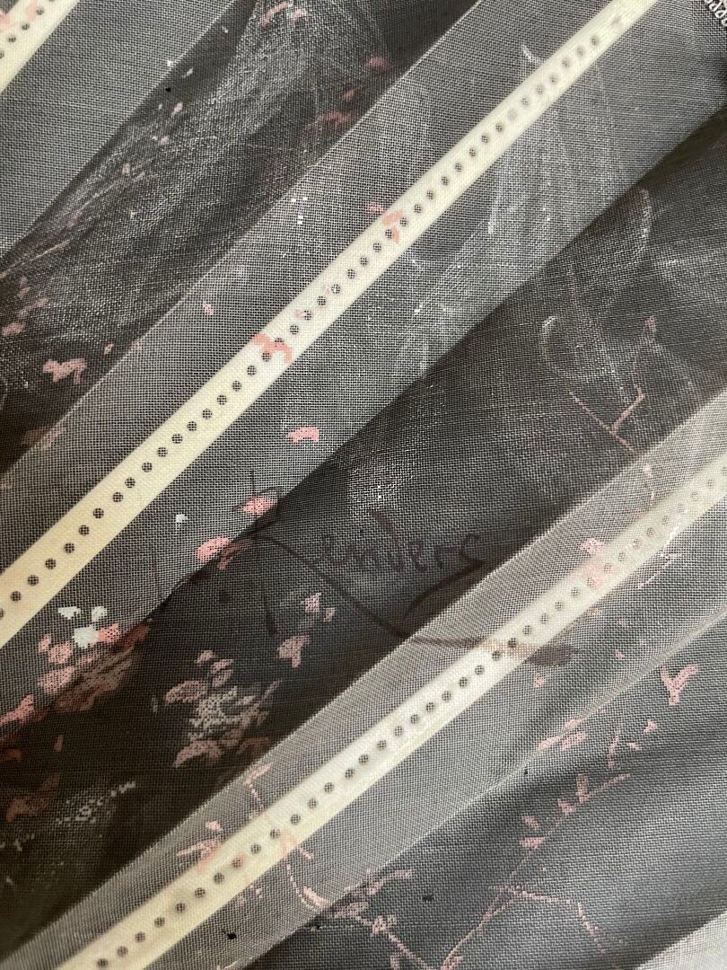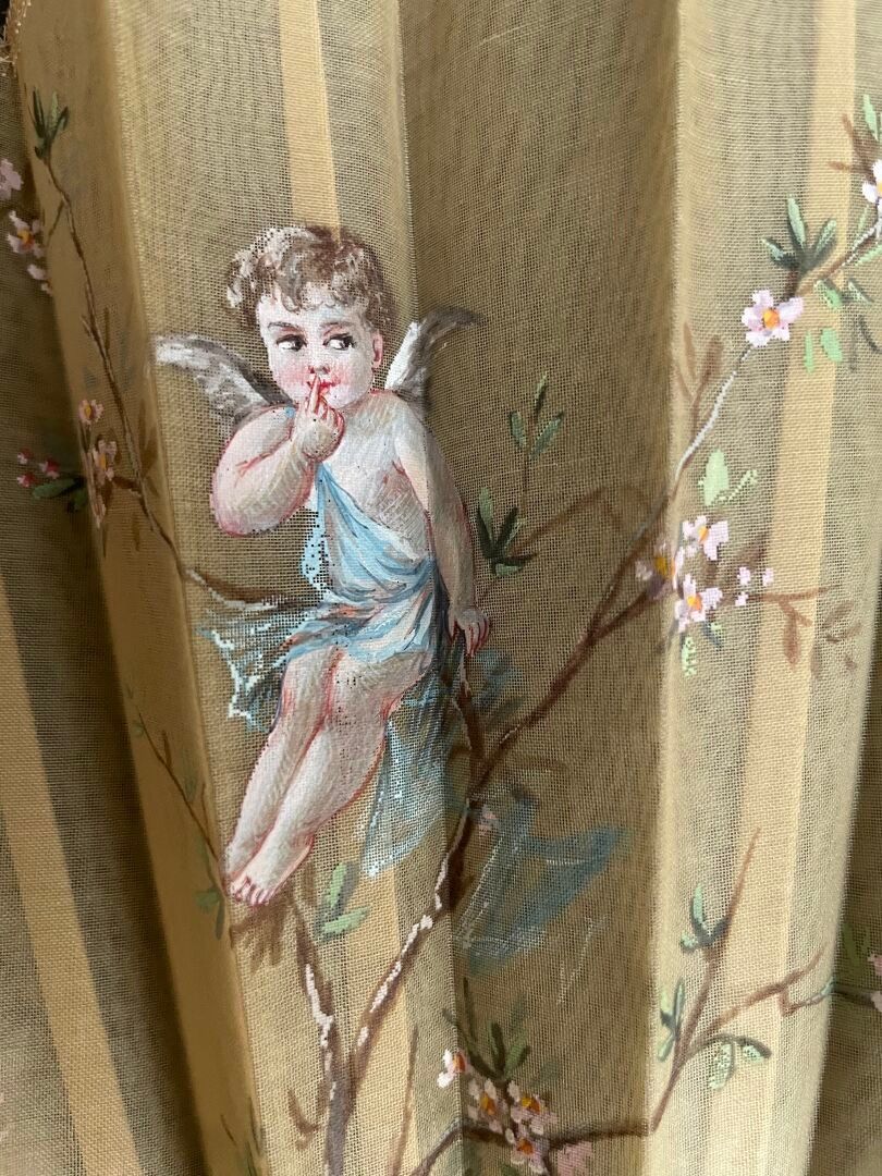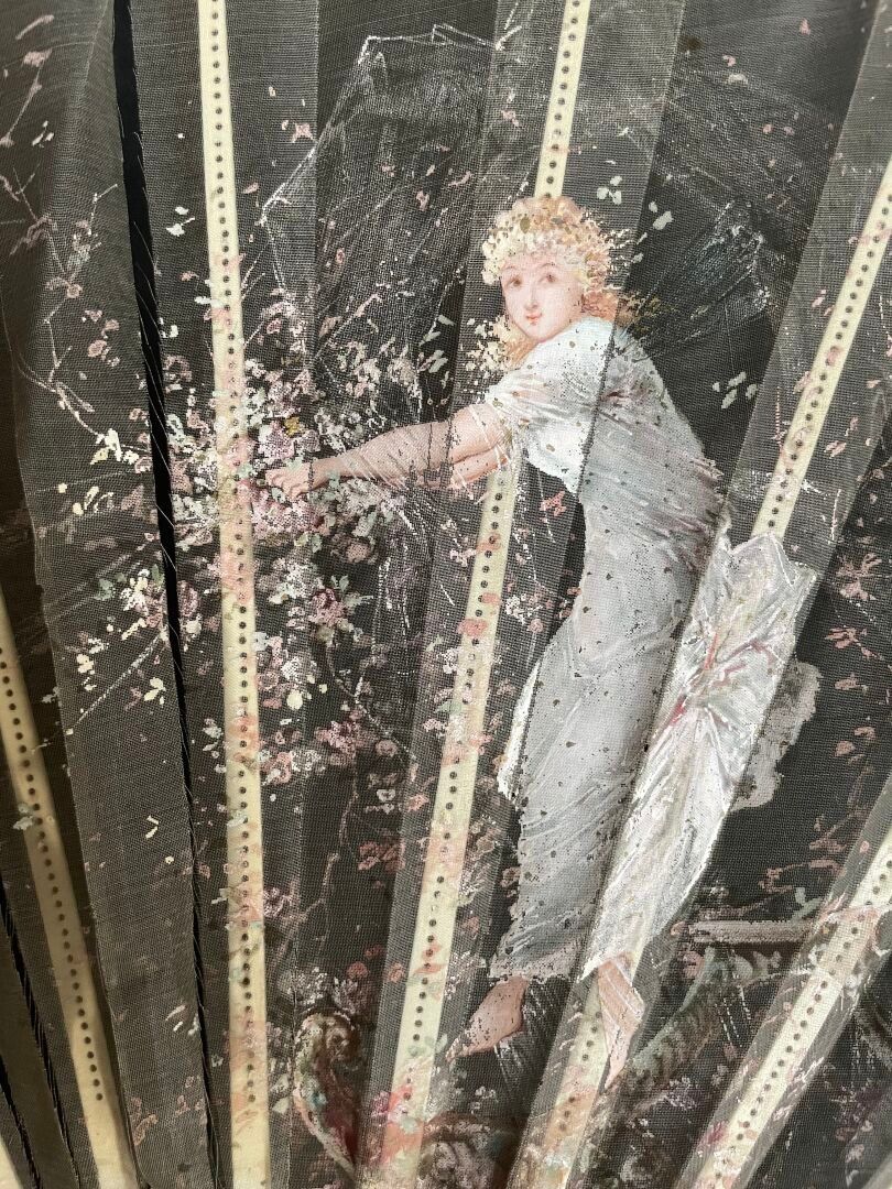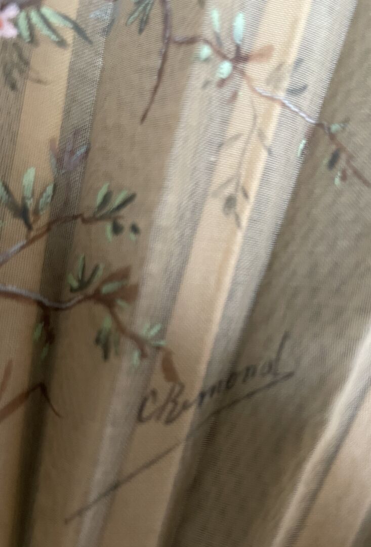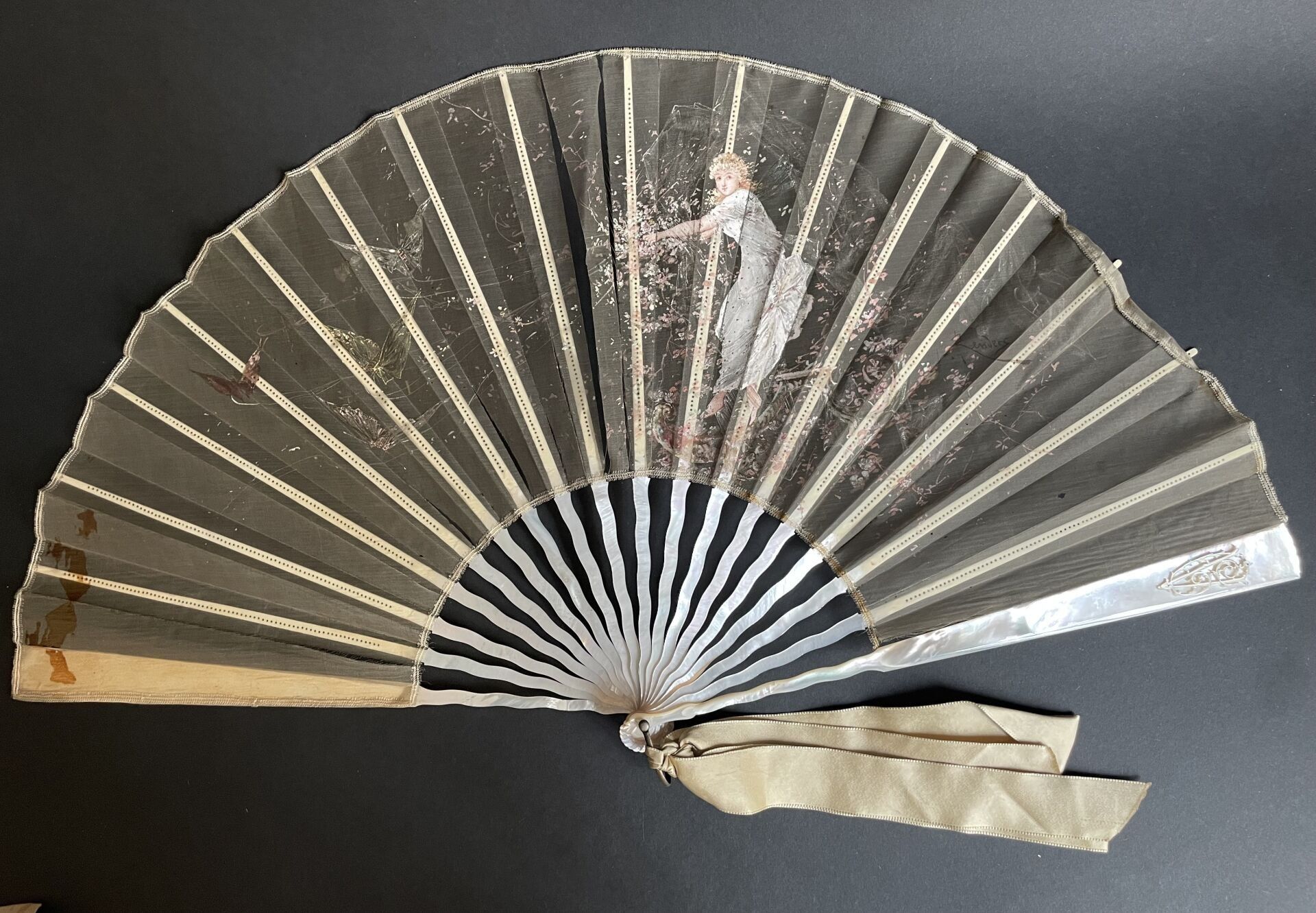 Silk leaf painted with a young girl with butterfly wings among roses. Signed "L. Renders".