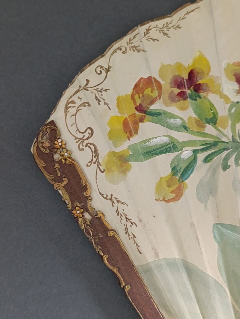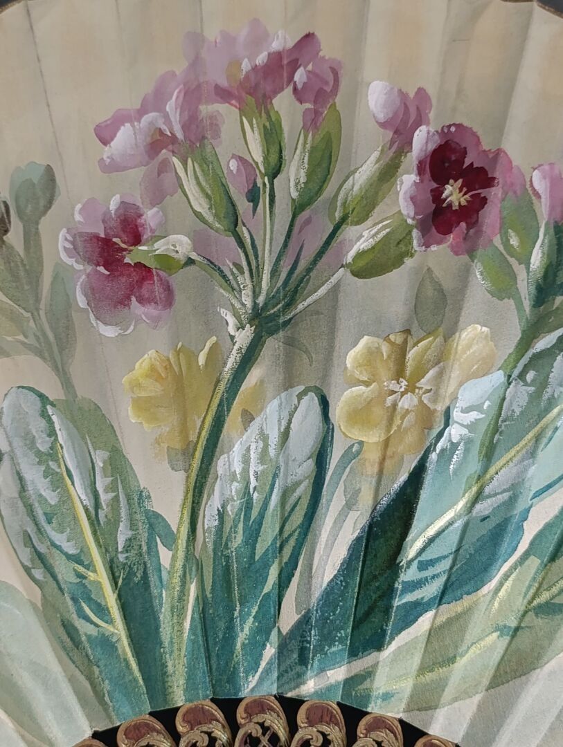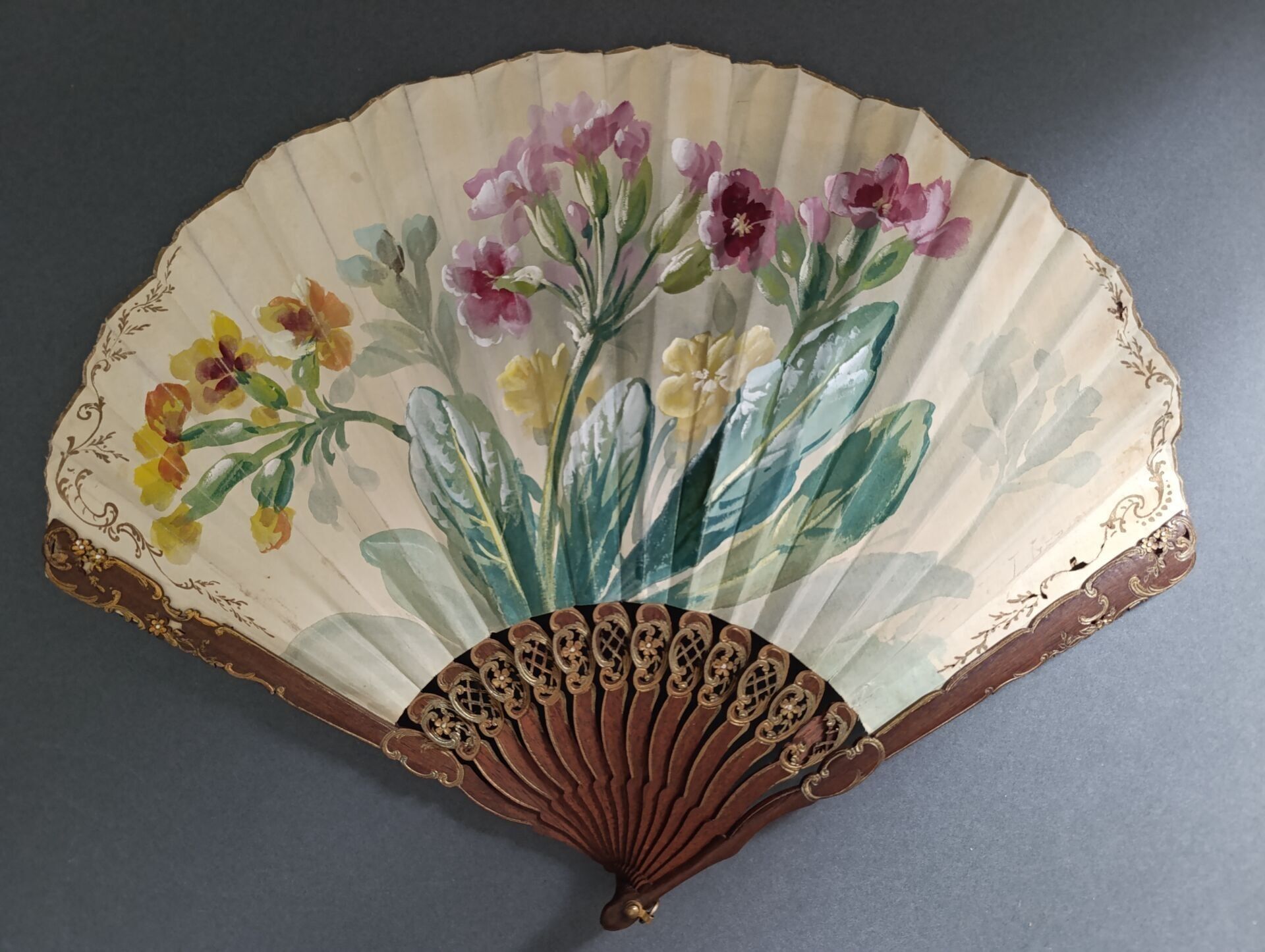 Balloon-shaped folded fan, mounted in the English style, in silk painted with pink and yellow primroses.