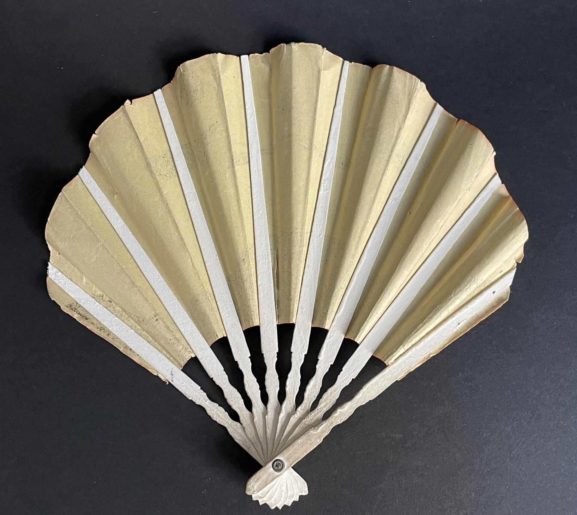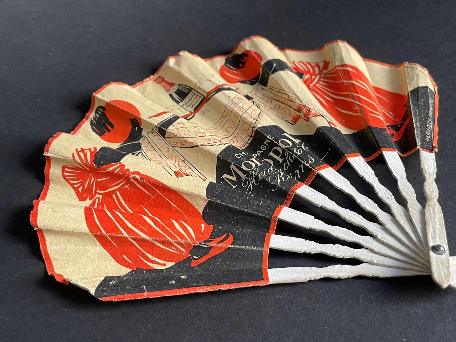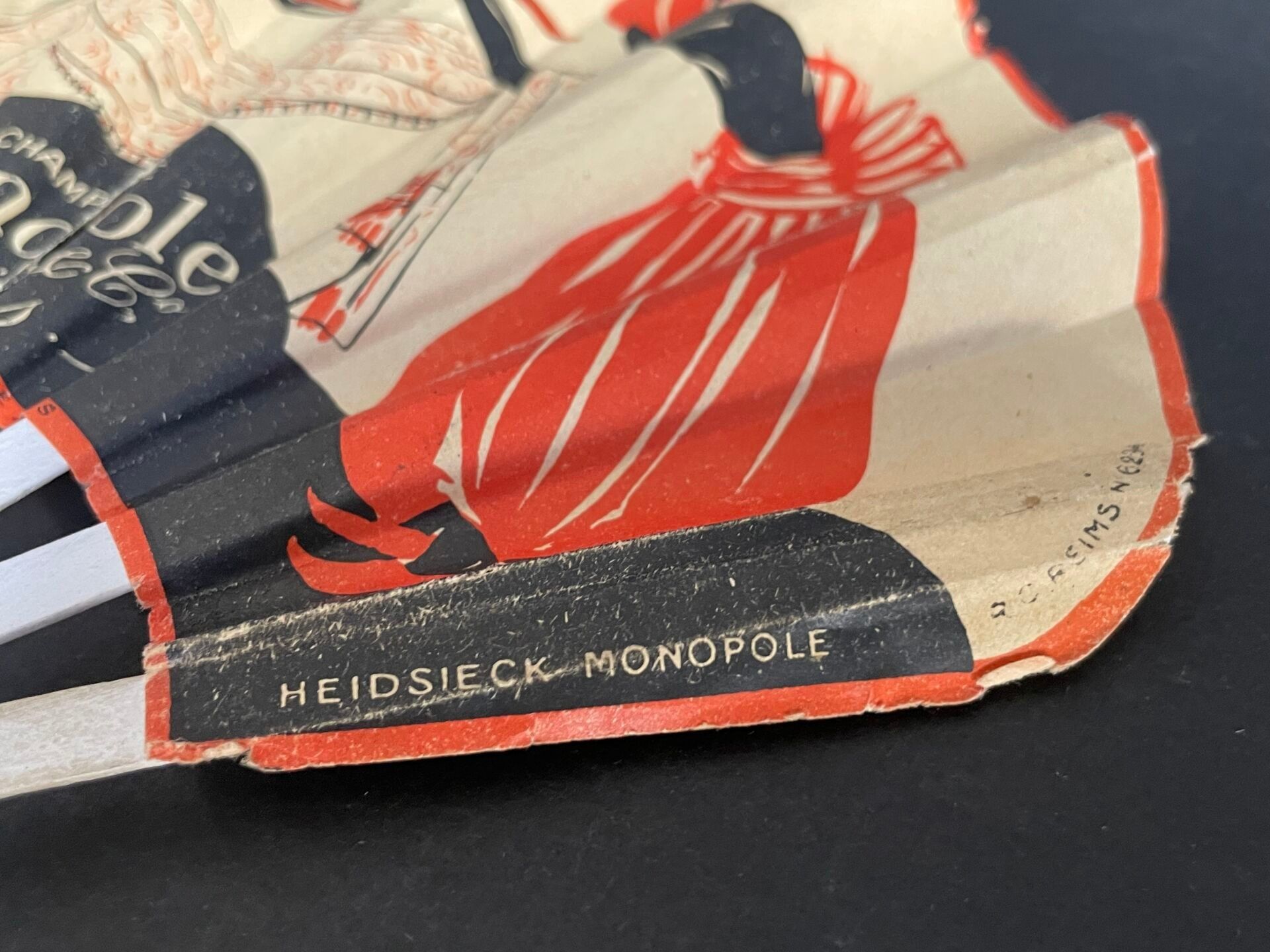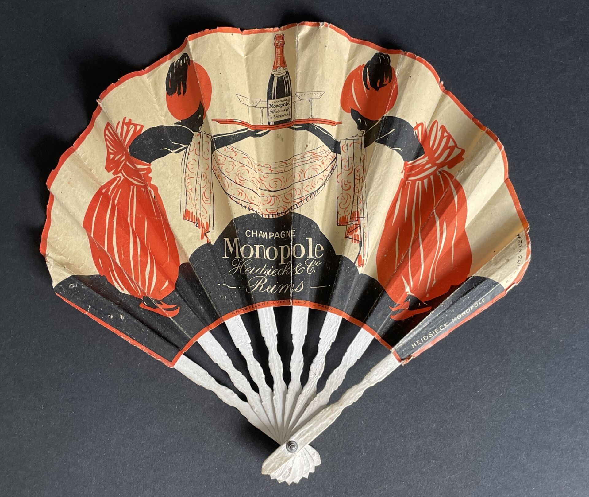 Folded fan, advertising, the paper sheet printed with oriental servants presenting two goblets and a bottle of "Heidsieck Dry Monopole" champagne.