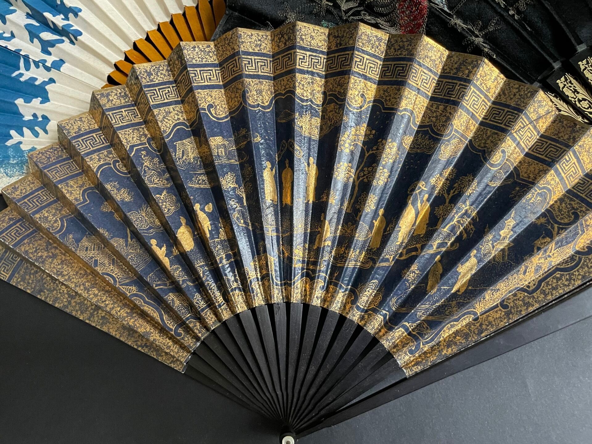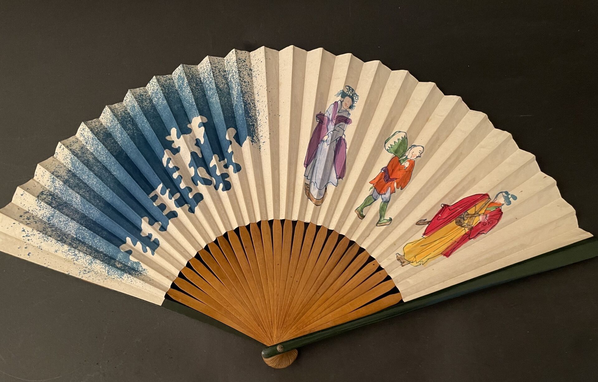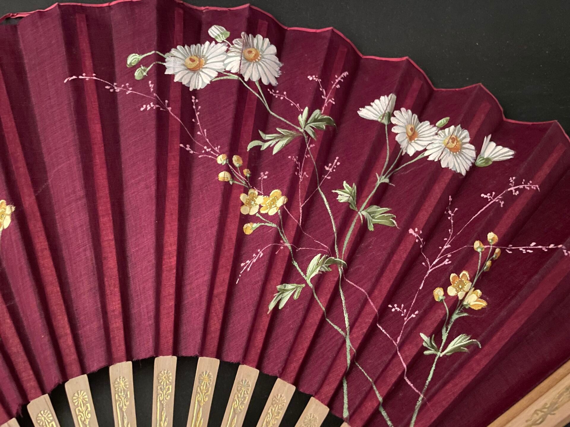 Set of fabric or paper leaf fans with various decorations, wooden frames