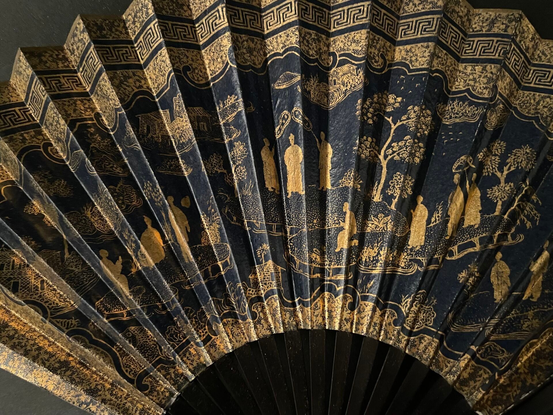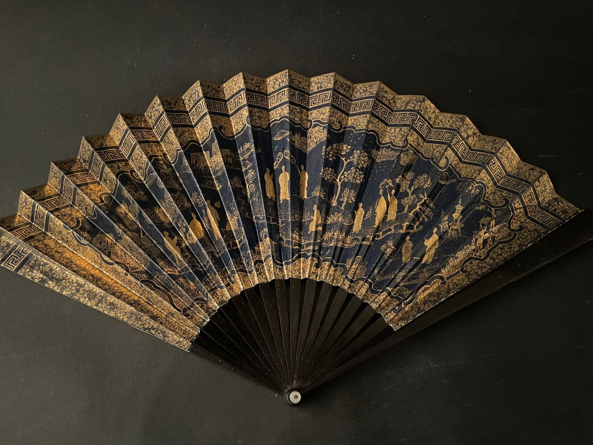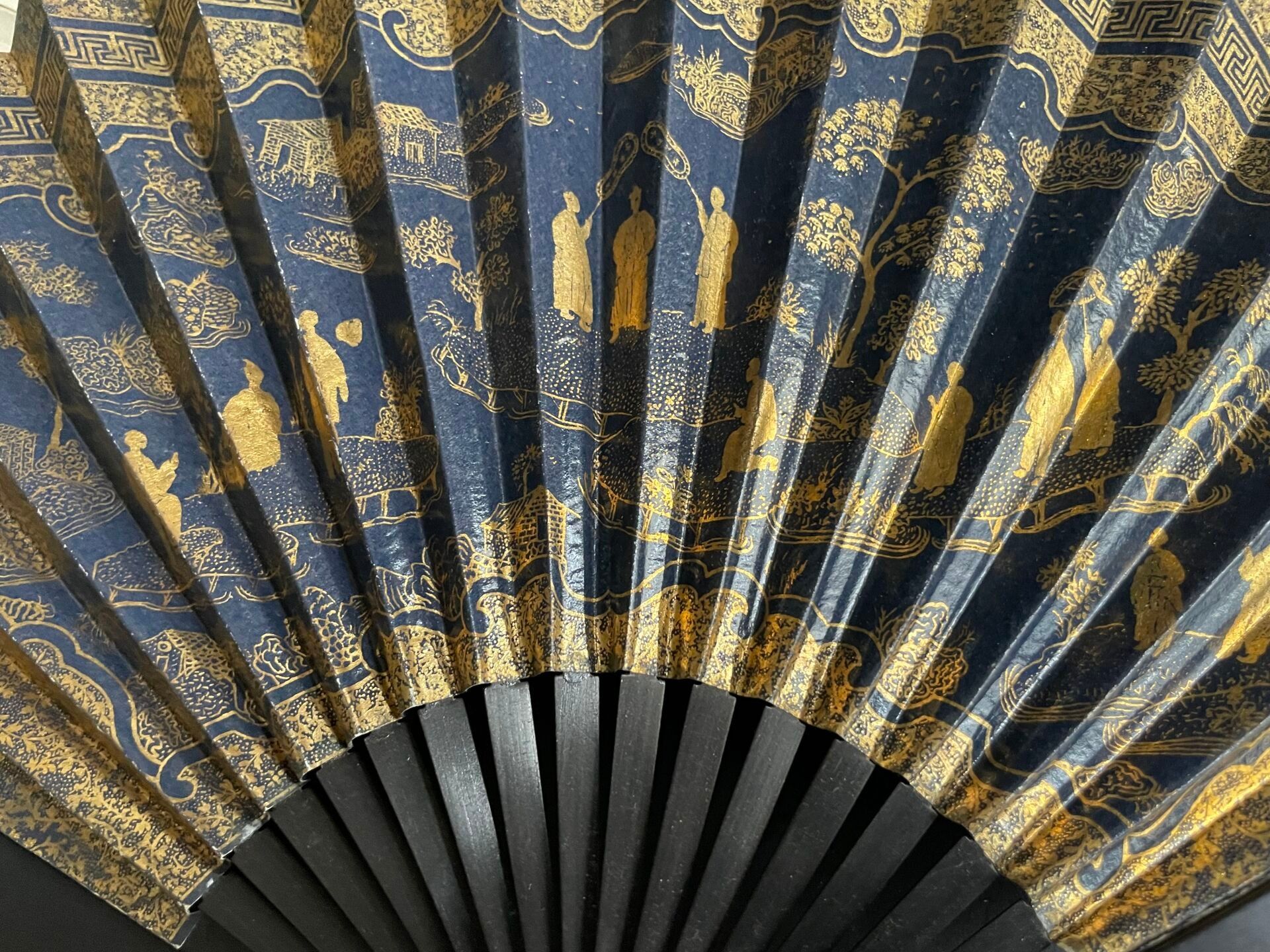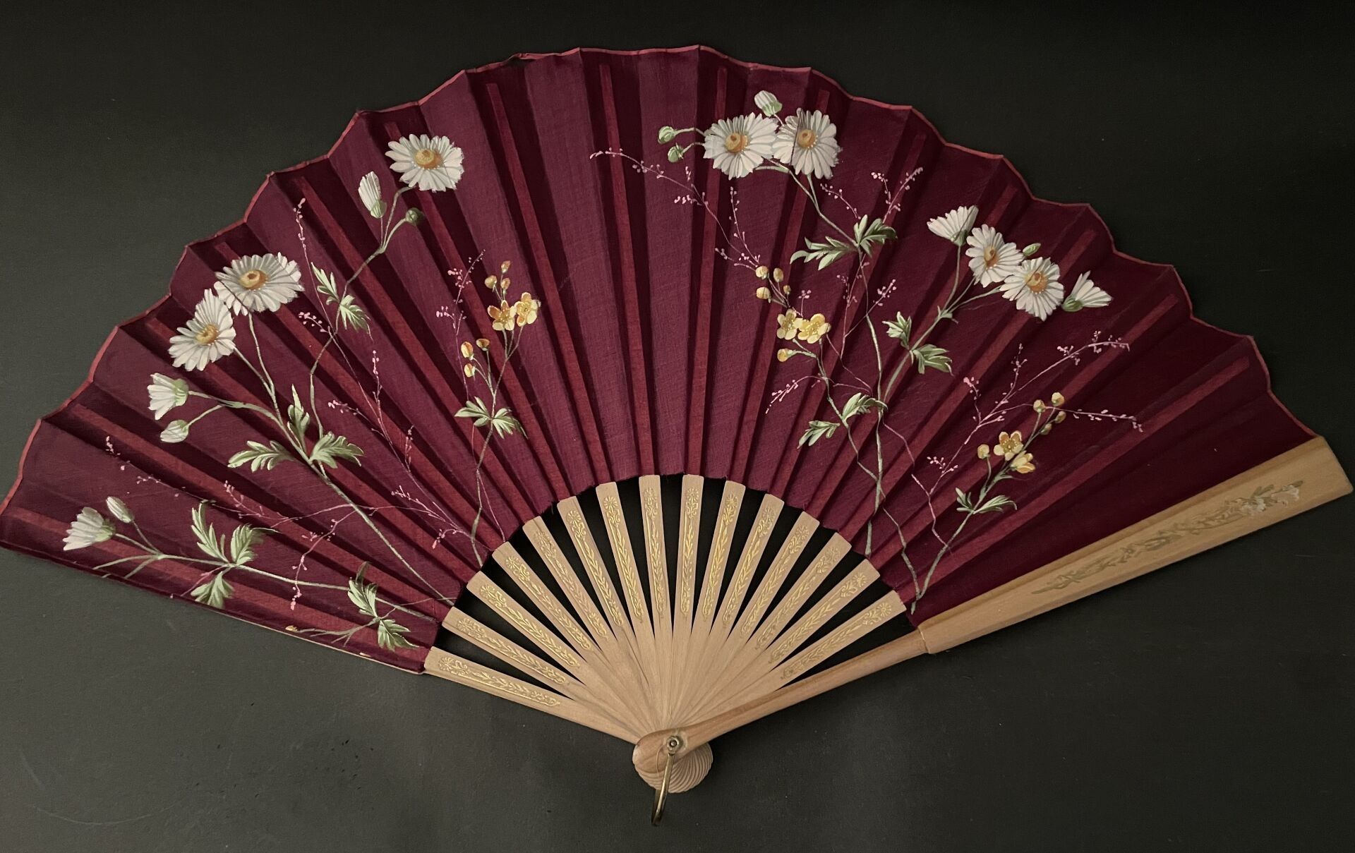 Set of fabric or paper leaf fans with various decorations, wooden frames
