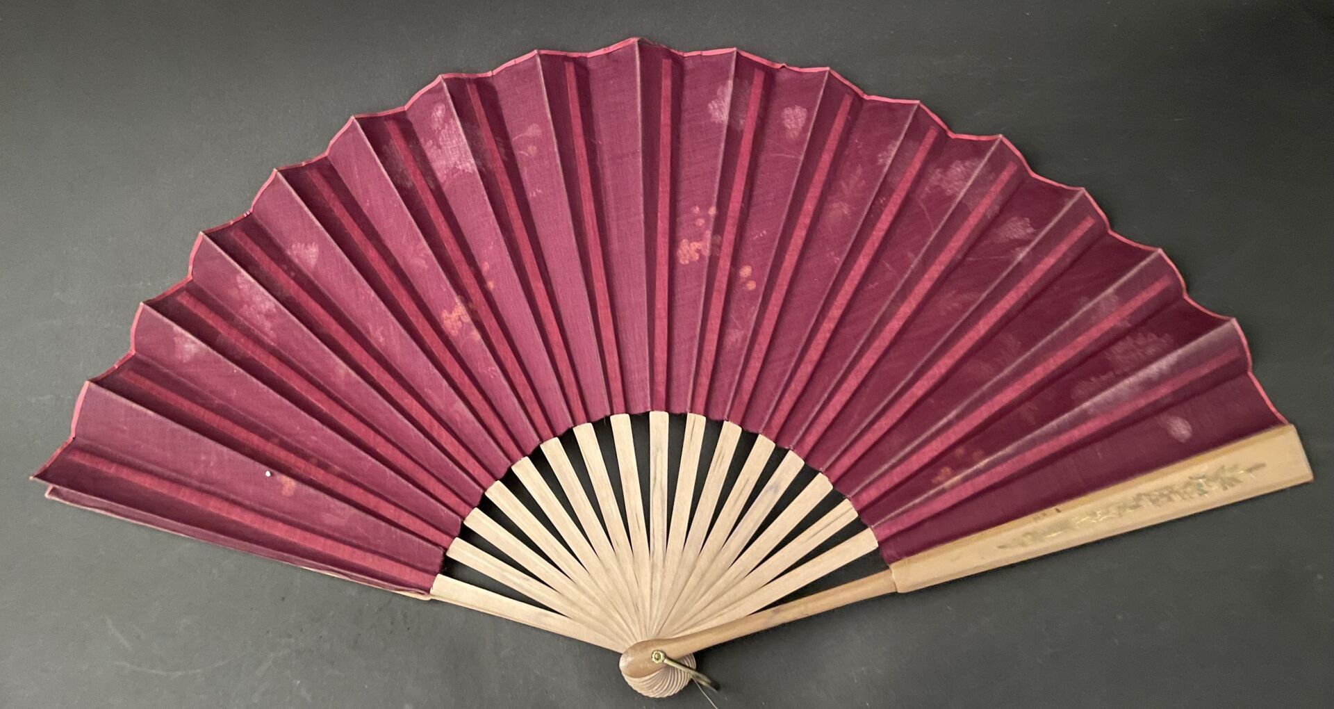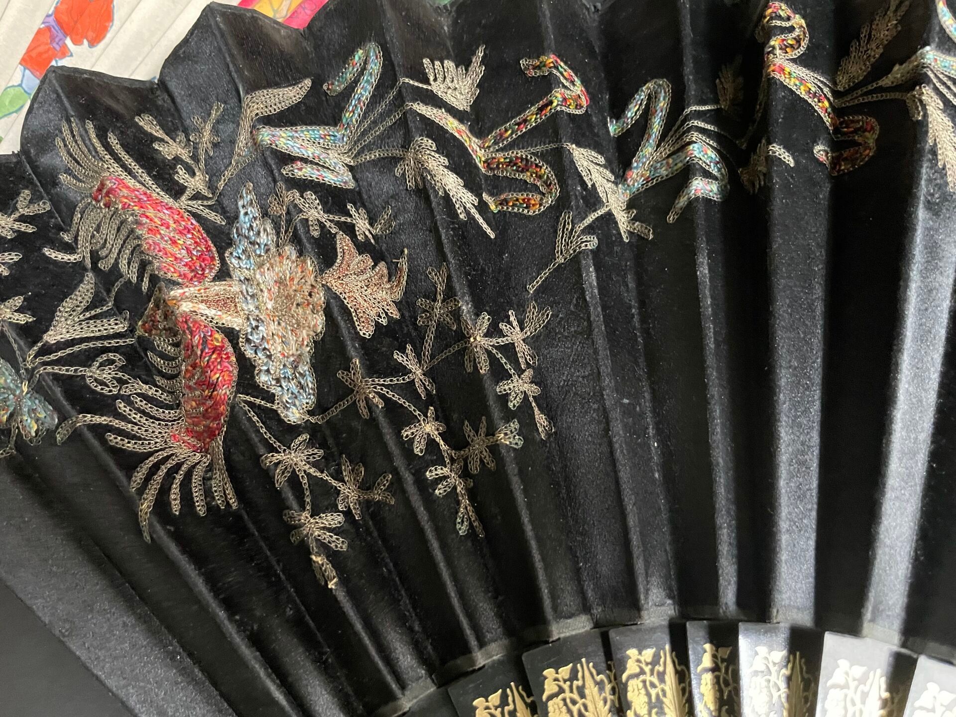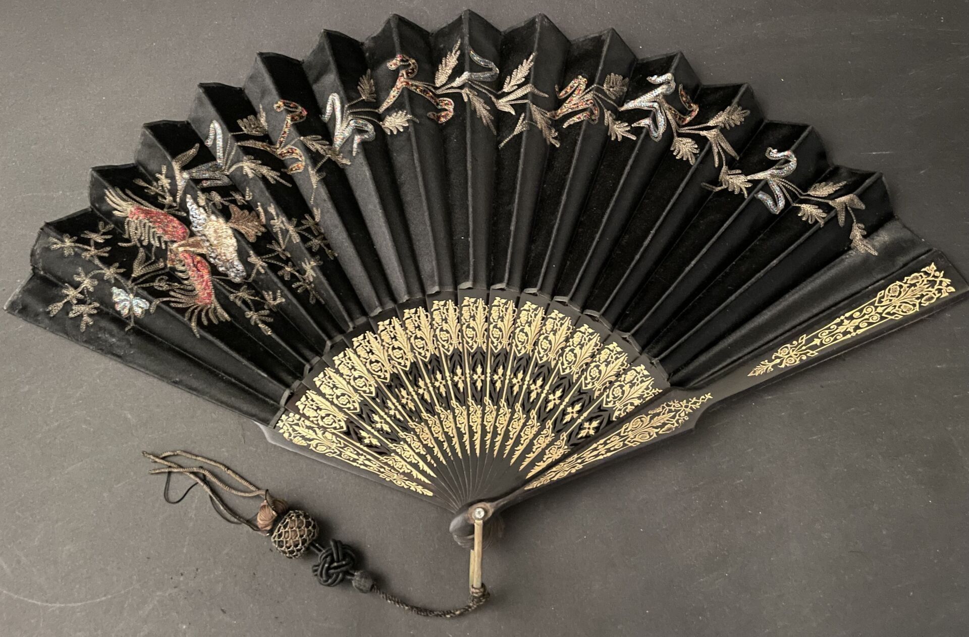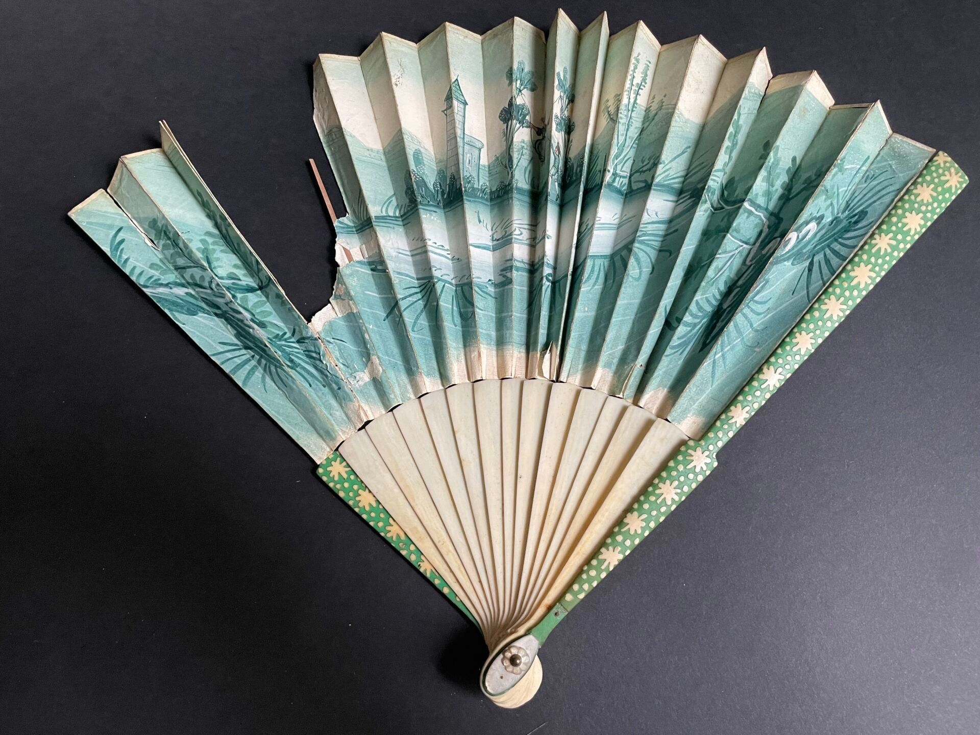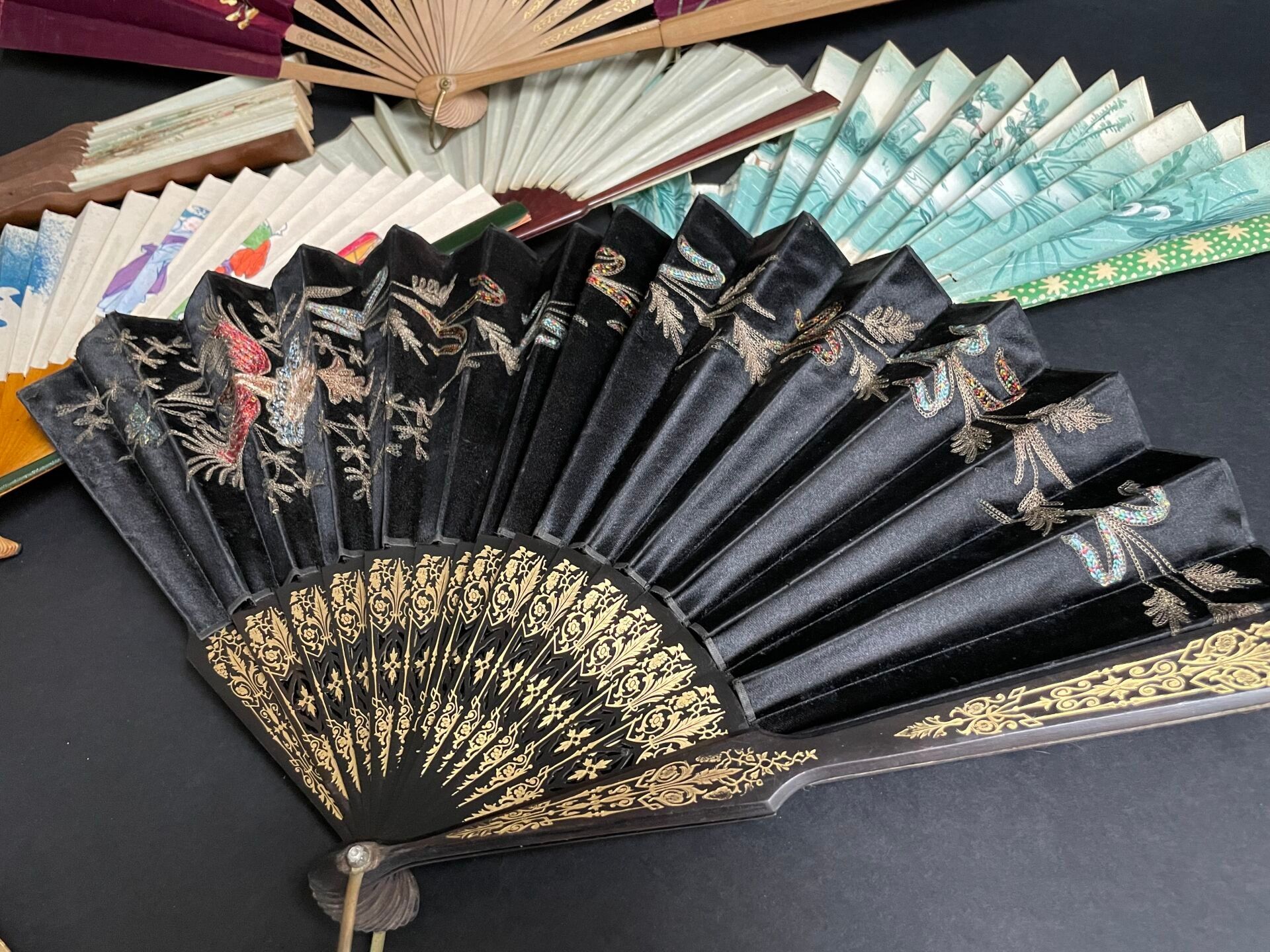 Set of fabric or paper leaf fans with various decorations, w…