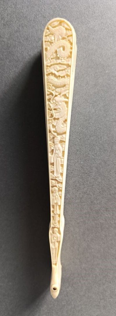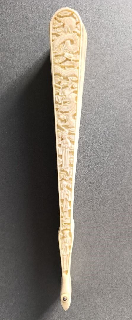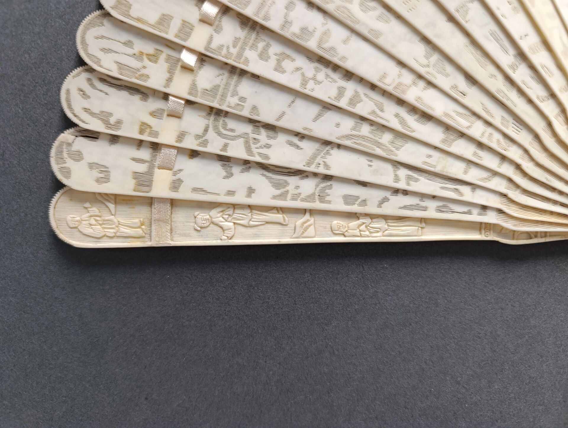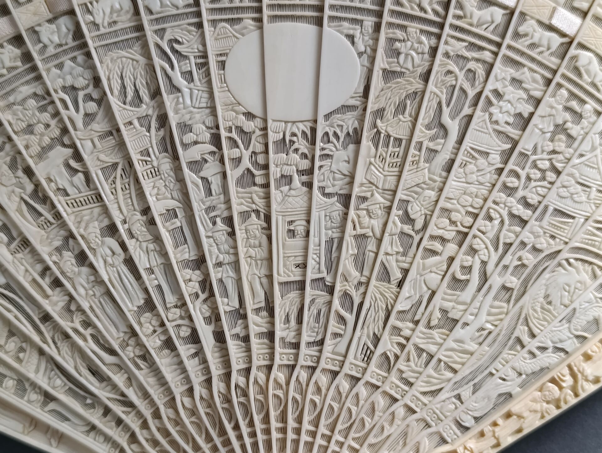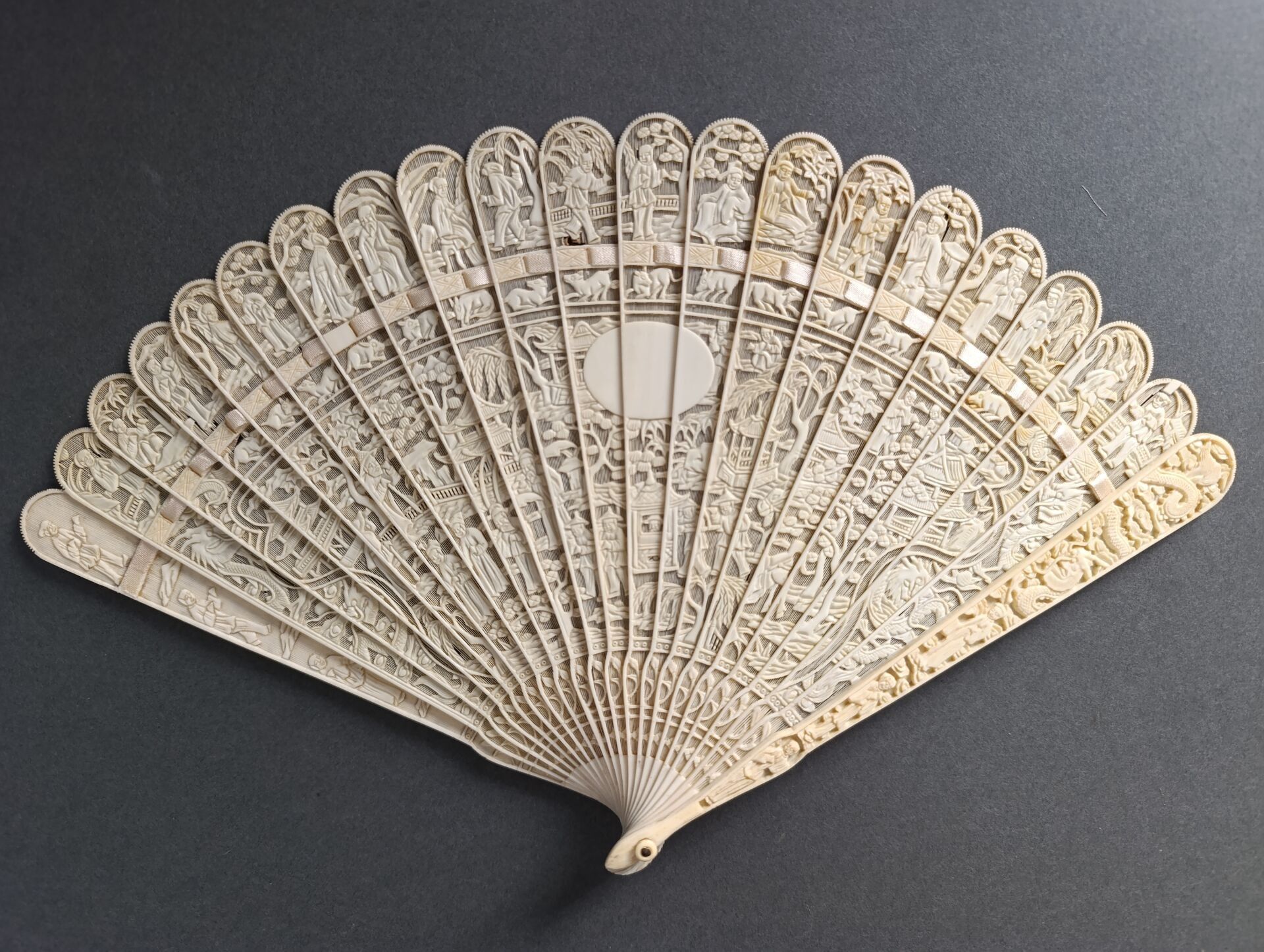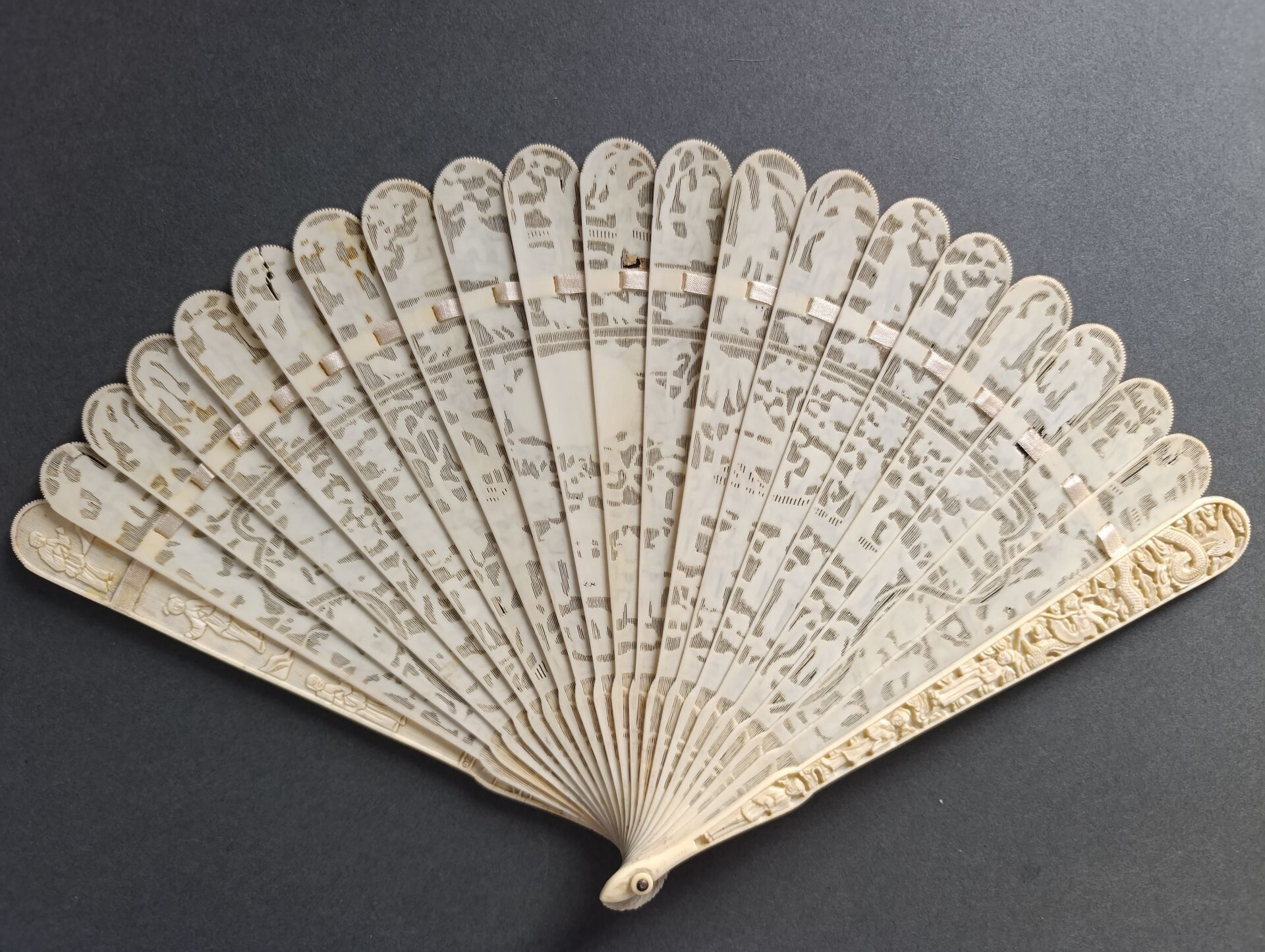 A broken fan in pierced ivory, carved and engraved with figures in gardens with pavilions and kiosk.