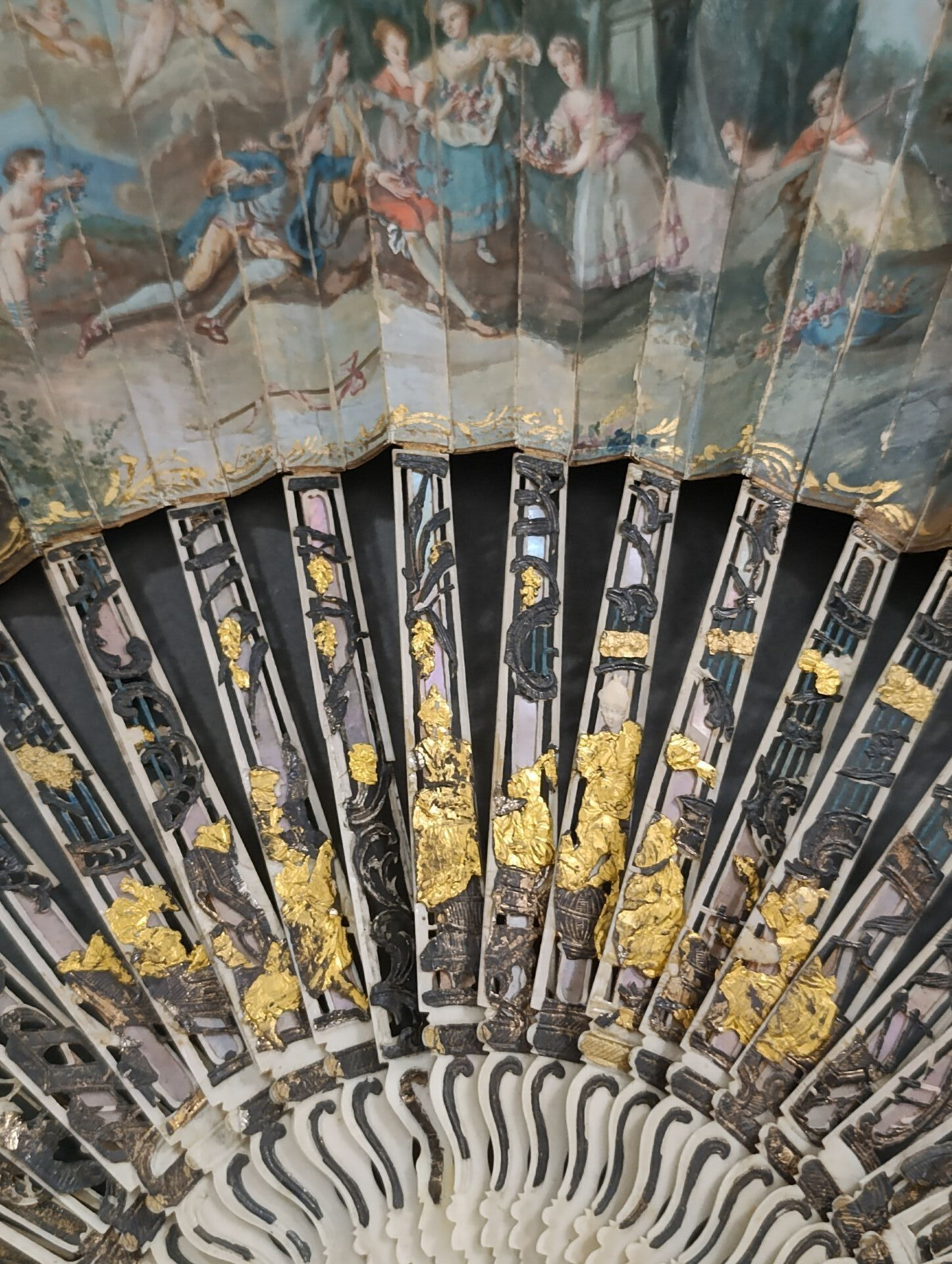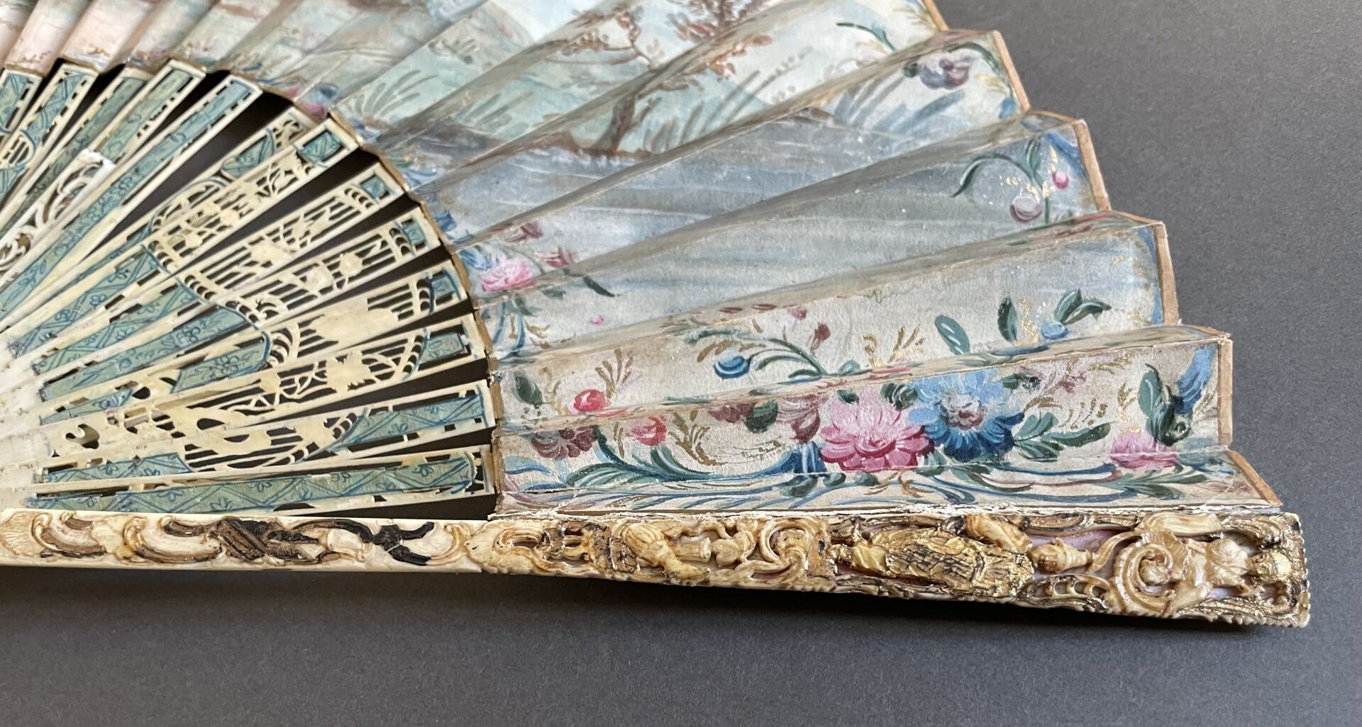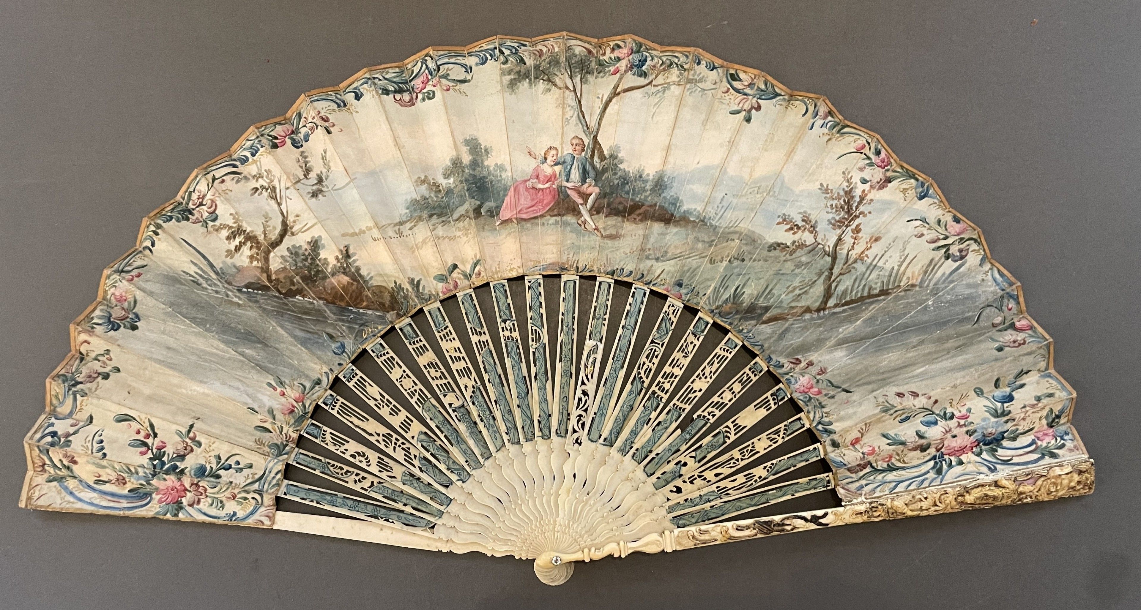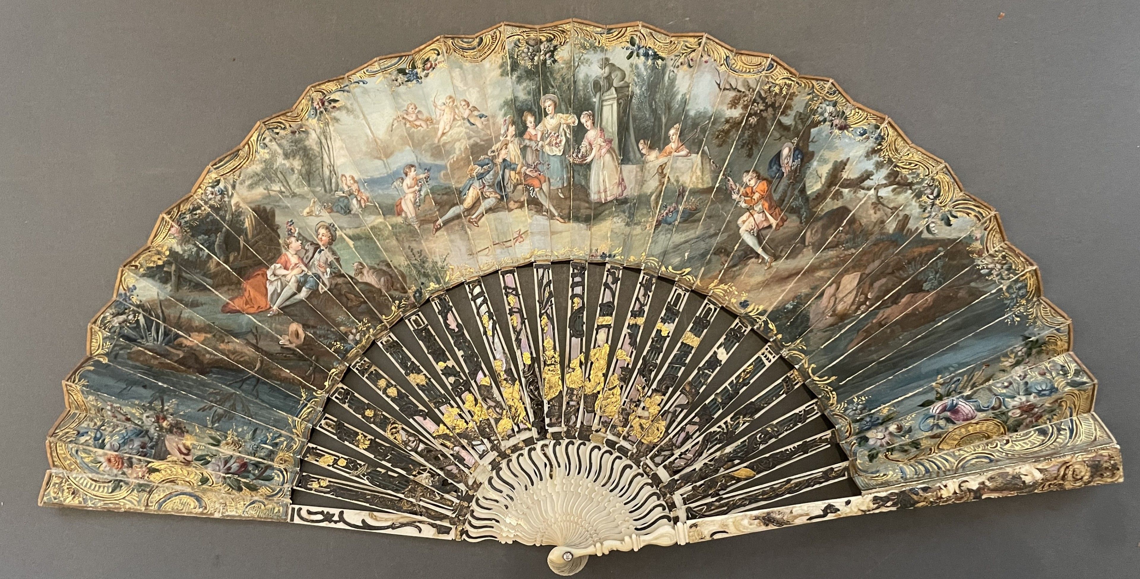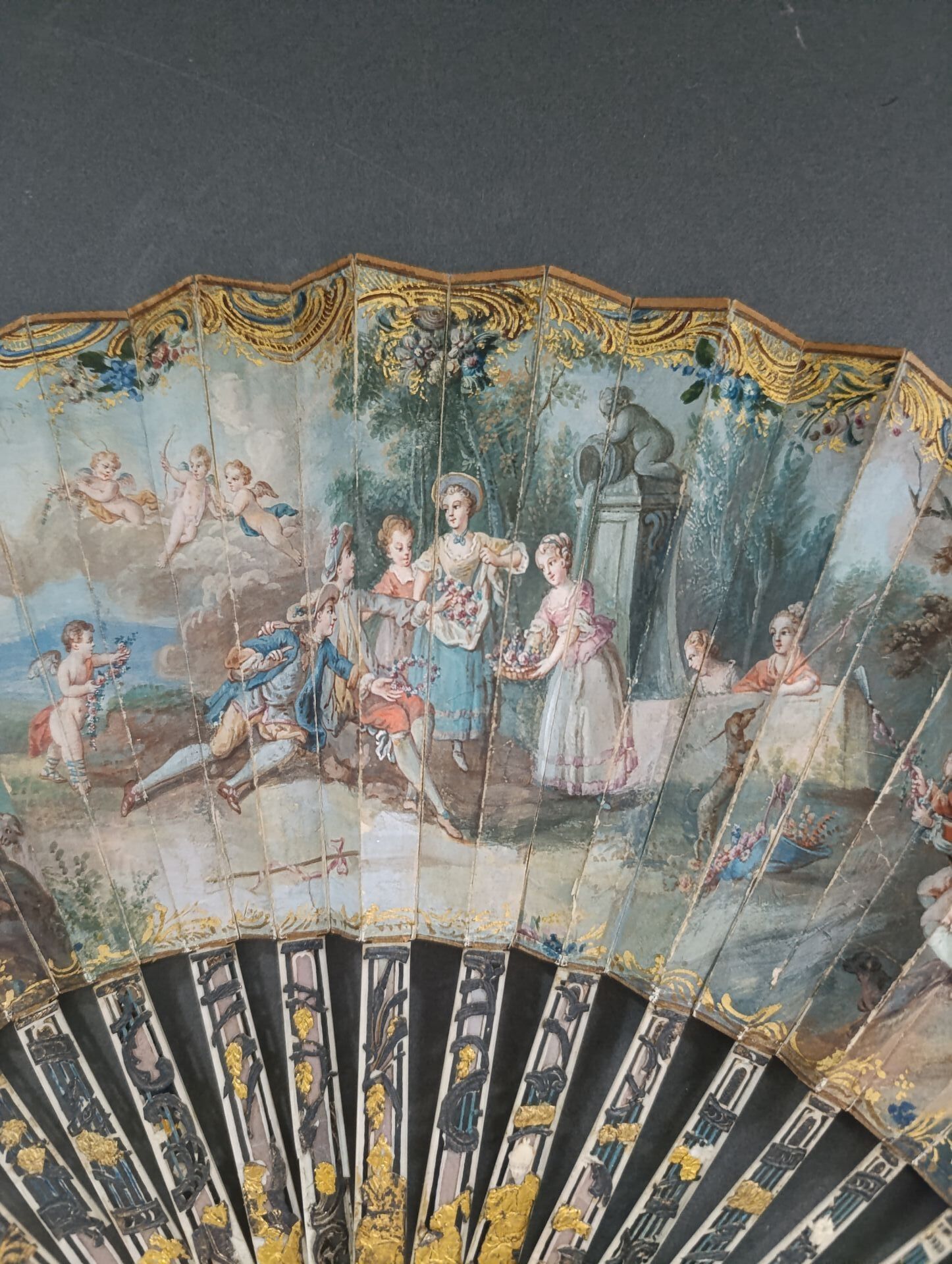 Folded fan, the double sheet of paper painted with couples of shepherds and shepherdesses exchanging crowns and bunches of flowers, among lovers, dogs, symbols of fidelity, and other shepherds.