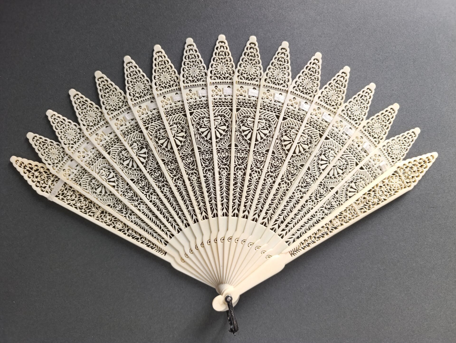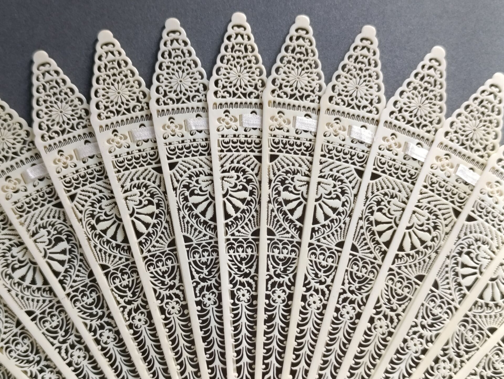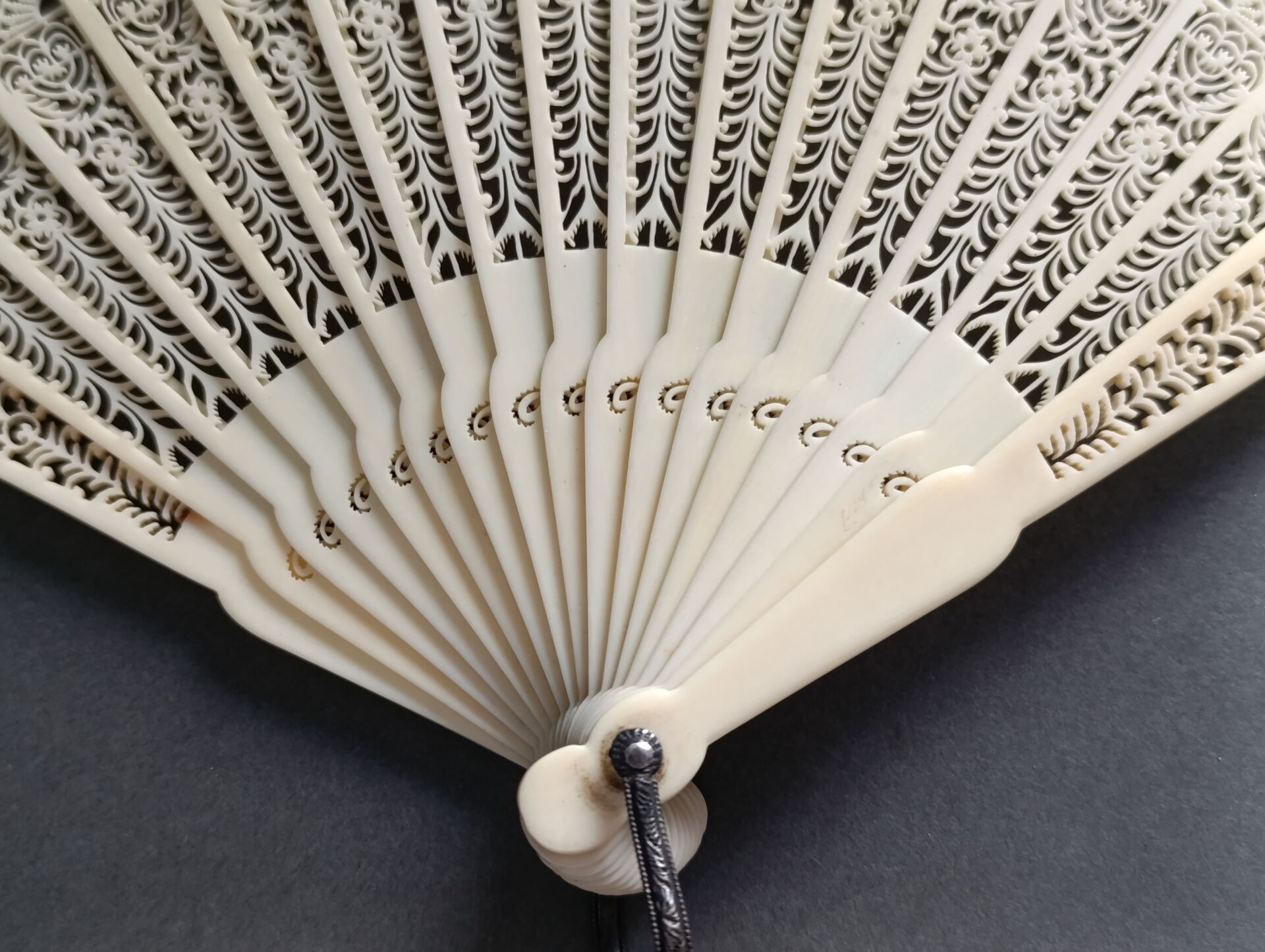 Broken ivory fan (elephantidae spp), pierced with stylised flowers. The strands end in pinnacles.