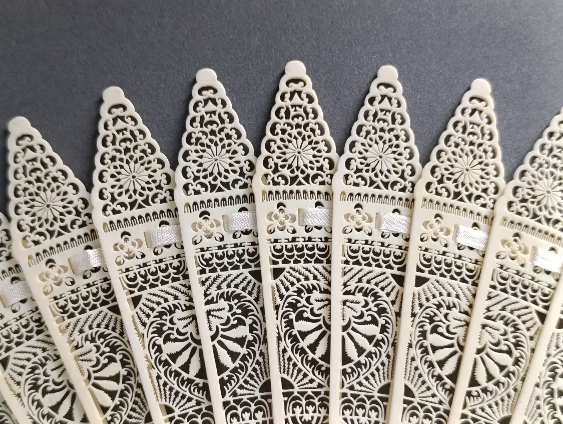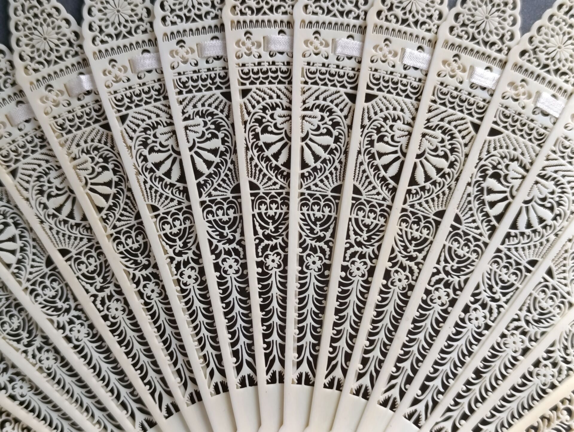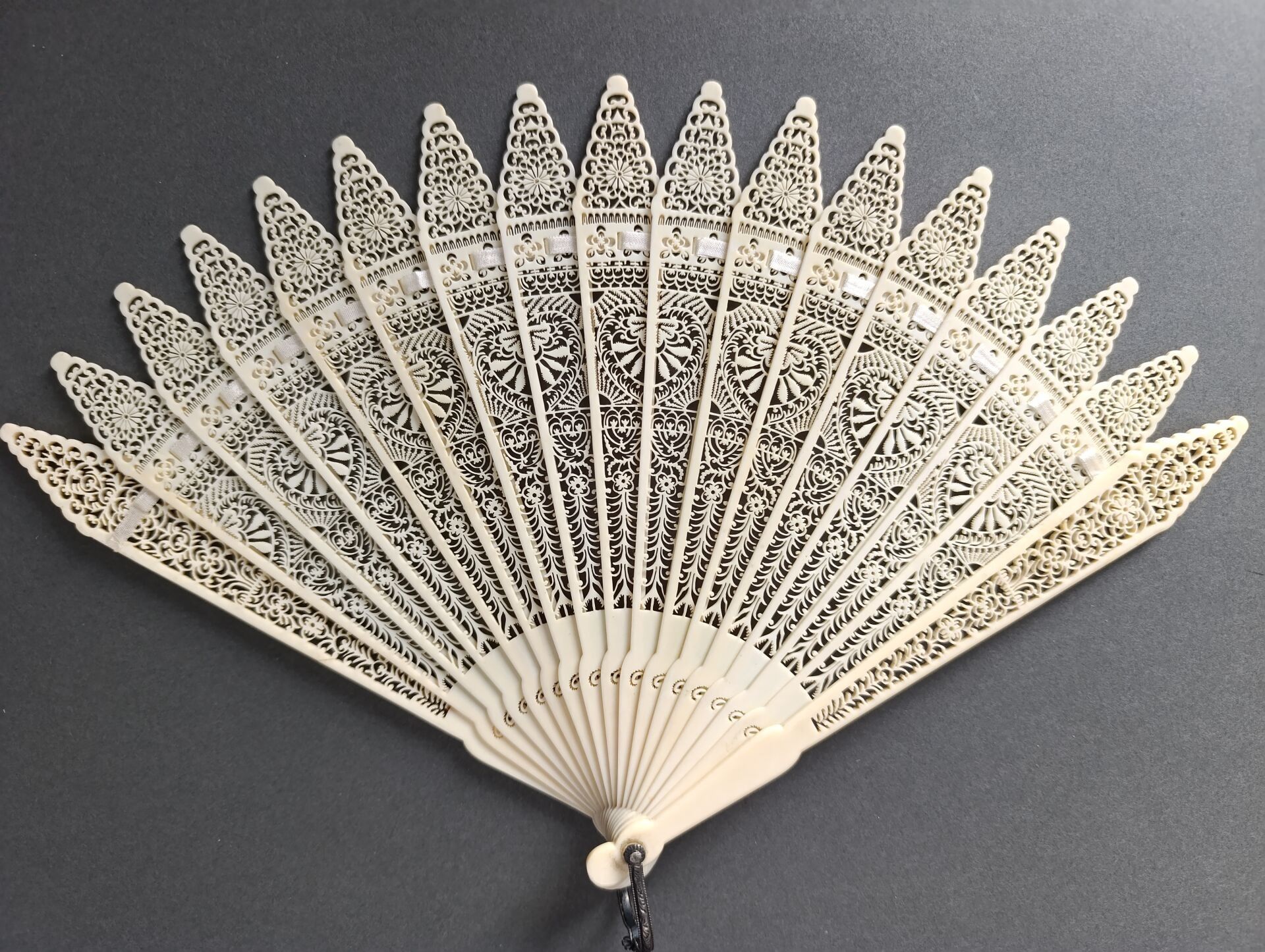 Broken ivory fan (elephantidae spp), pierced with stylised flowers. The strands end in pinnacles.