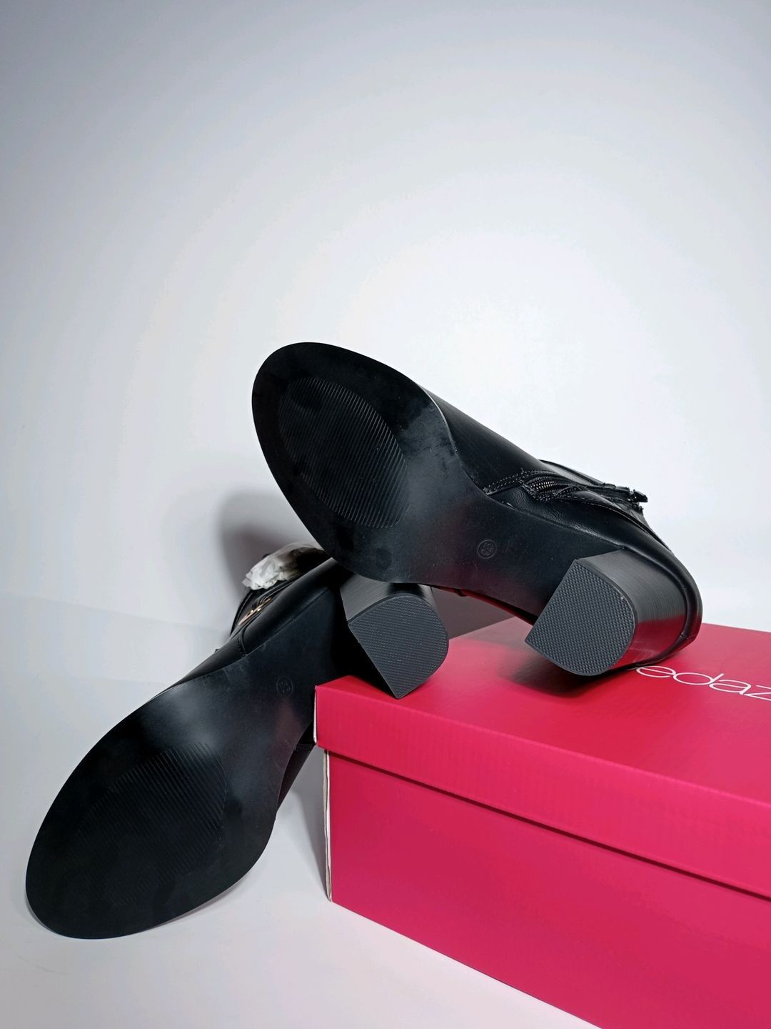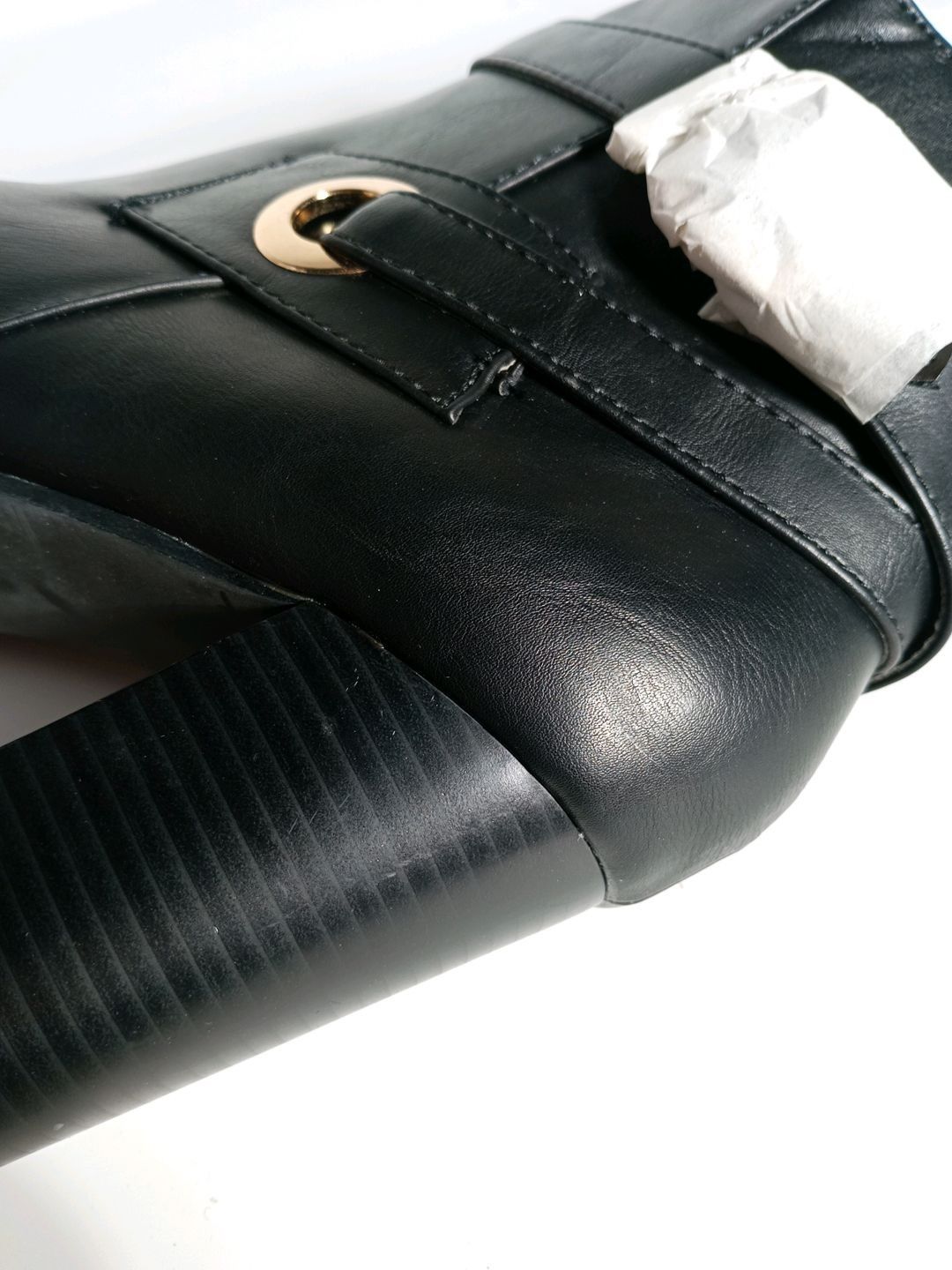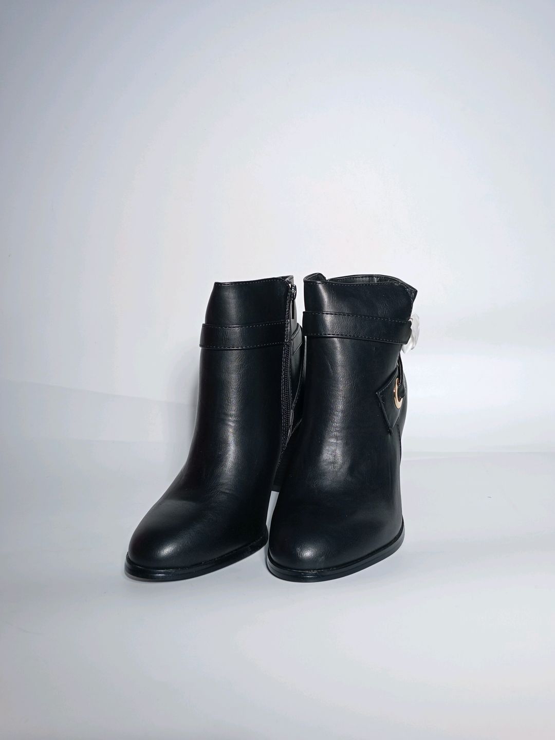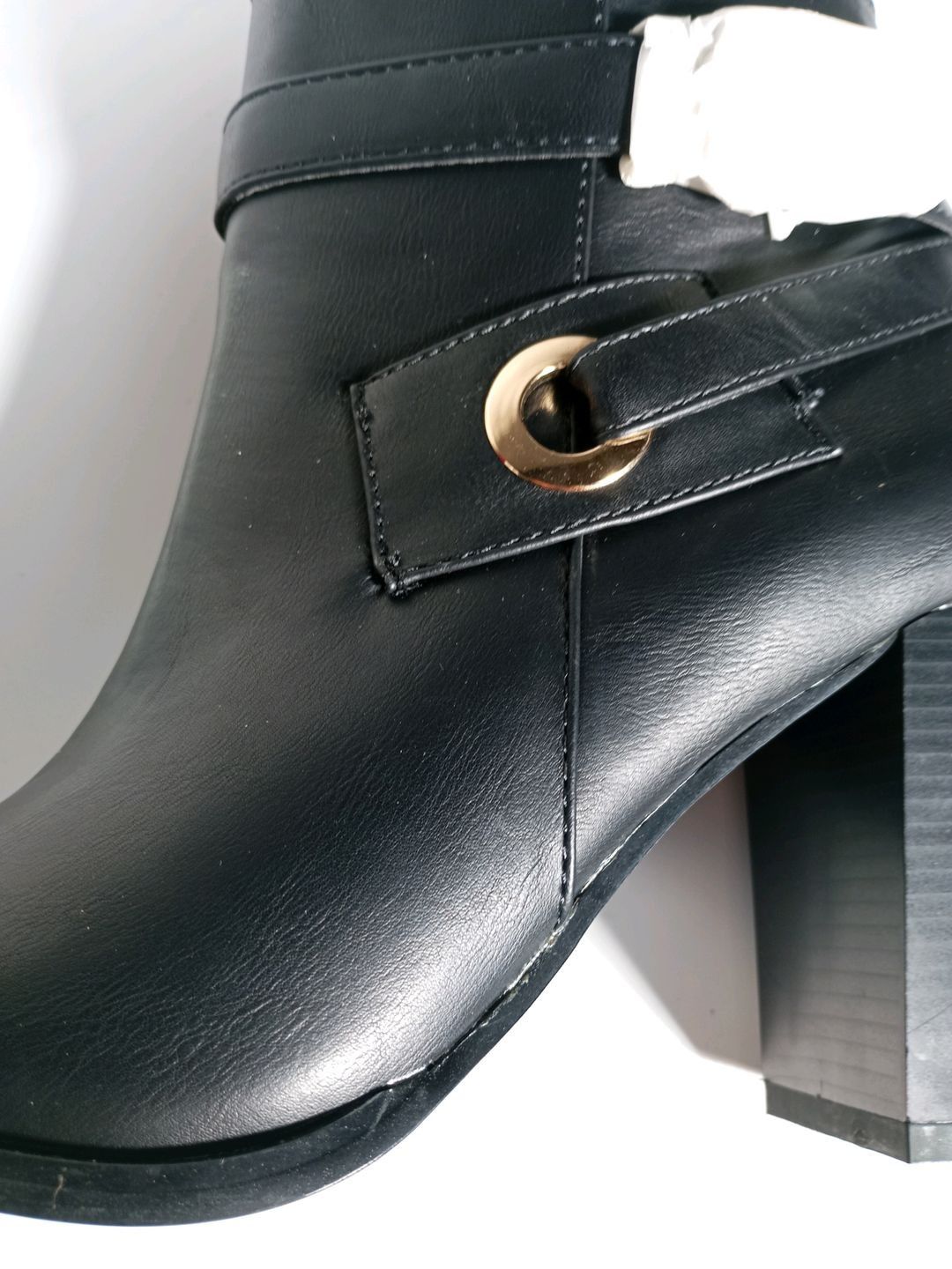 Heeled boots in black leatherette with gold detail - SHOEDAZZLE - size 40.5 - small manufacturing defects visible on the photos - Brand new - Recoverable VAT - This lot available everywhere in France from 12,24 € - This lot available everywhere in Europe from 18,00 €.