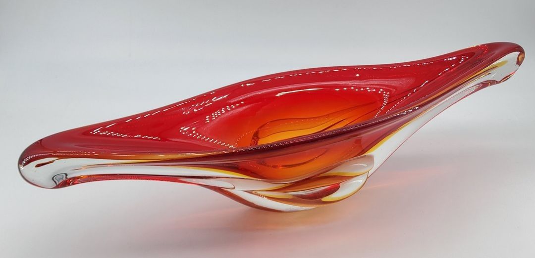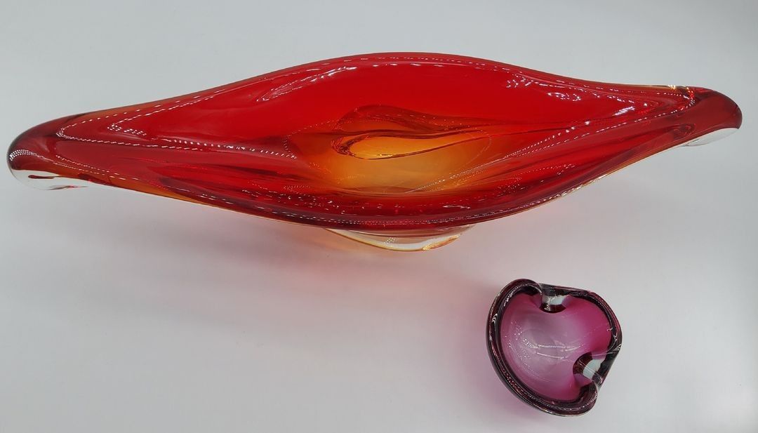 Red glass centrepiece forming a fruit basket and a violet glass pocket. H.12