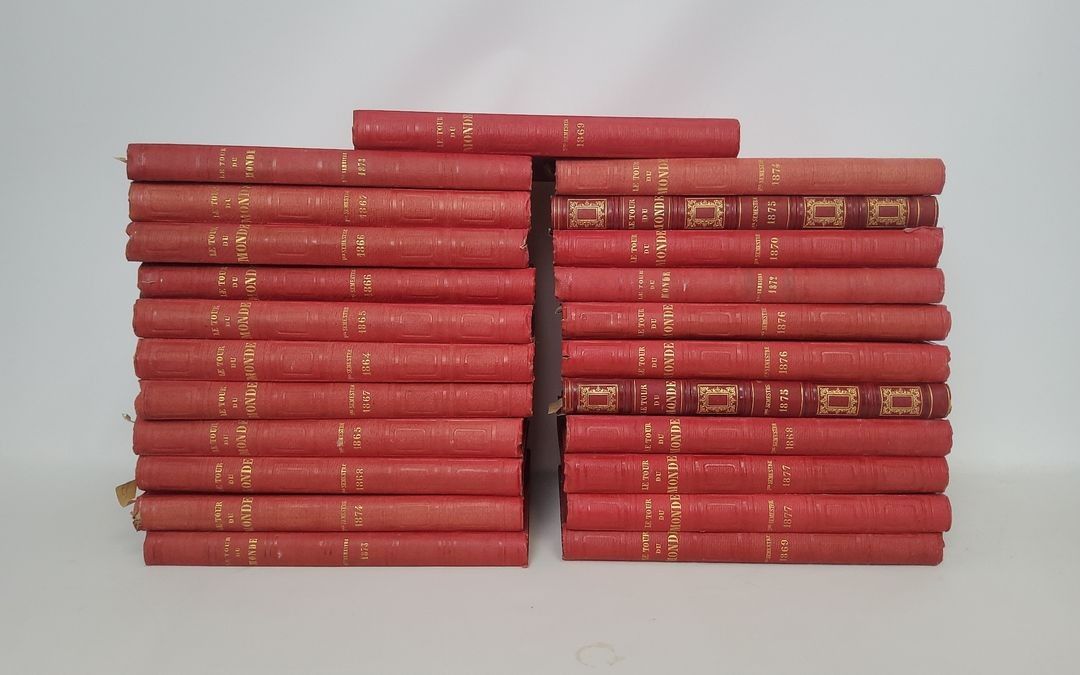 CHARTRON Edouard. Le tour du monde, Nouveau journal des voyages, 23 volumes from 1864 to 1977 (1871 missing). Librairie Hachette. Stains, foxing, dampness. - Can be shipped on pallet