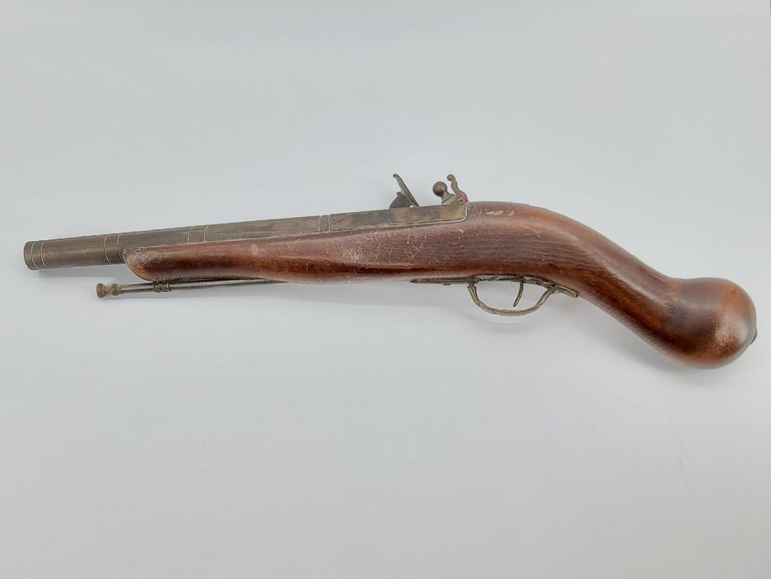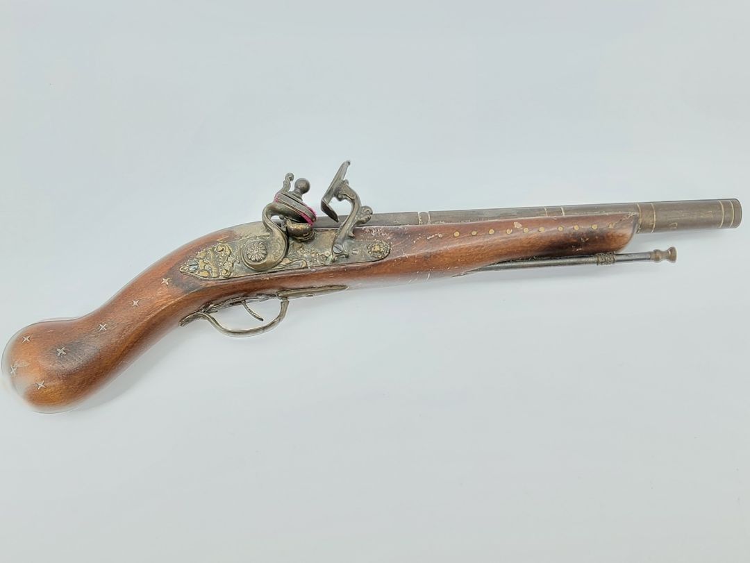 Flintlock pistol for decoration. Modern manufacture. Length : 45 cm. Appraised by JC Dey. - This lot available anywhere in mainland France from €12.24 - This lot available anywhere in Europe from €18.00