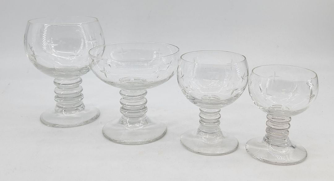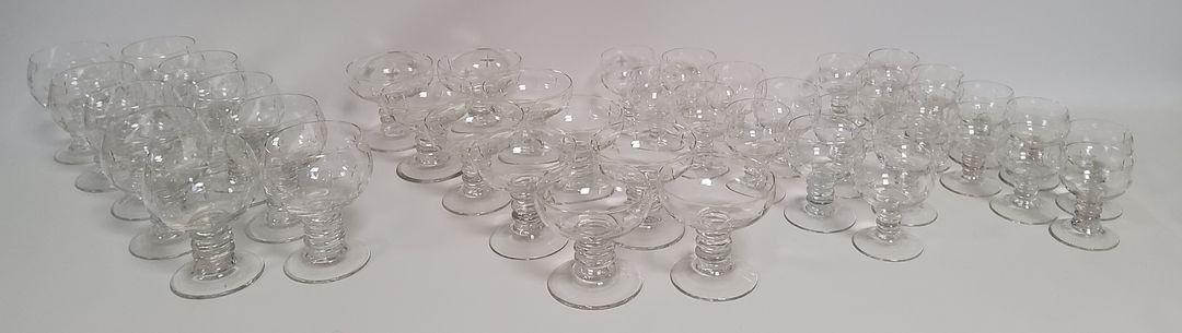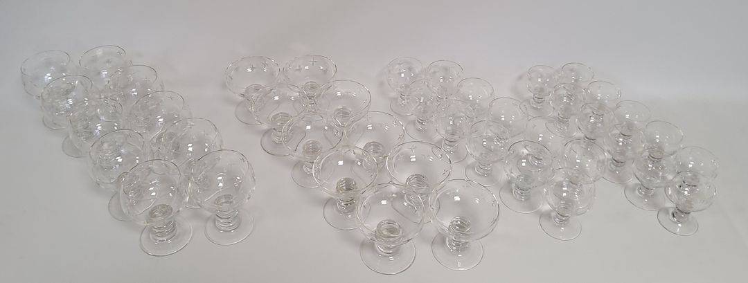 Set of cut crystal glasses with star decoration comprising 10 cognac glasses; Height: 12.4 cm; 10 champagne glasses. Height: 9.6 cm; 11 port glasses. Height: 9.4 cm; 11 liqueur glasses. Height: 8.2 cm.