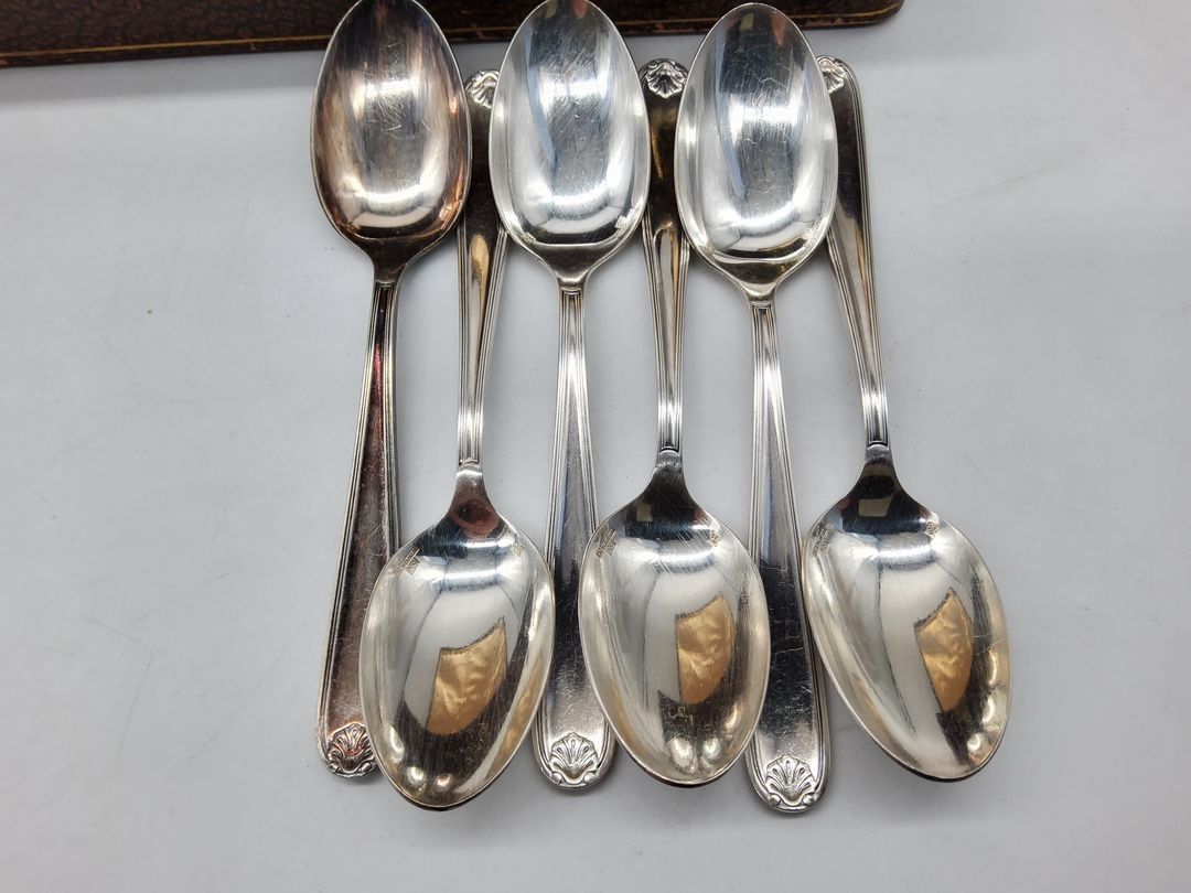 ERCUIS - 25-piece silver-plated metal set, shell model, comprising - 12 table spoons - 12 table forks - 1 ladle. There are 6 Christofle dessert spoons and 6 Boulenger dessert spoons, shell model. - This lot is available anywhere in mainland France from €15.72 - This lot is available anywhere in Europe from €30.00