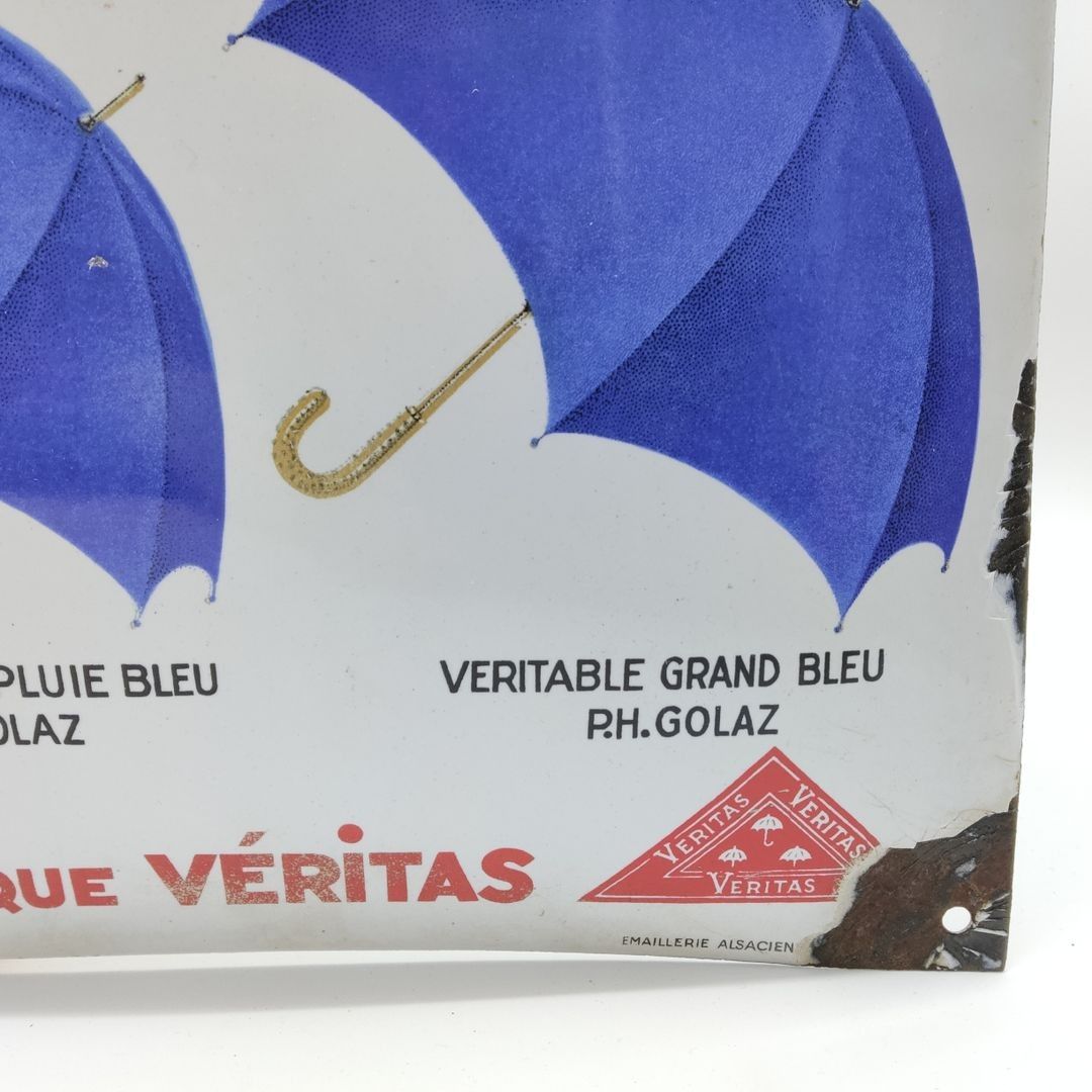 PARAPLUIE VERITAS - "Ici dépôt officiel" - Curved enamelled plaque Parapluie Véritas P.H.Golaz - Signed Emaillerie Alsacienne Strasbourg - H.33 x W.50 cm - This lot available everywhere in France from 17,40 € - This lot available everywhere in Europe from 32,52 €.