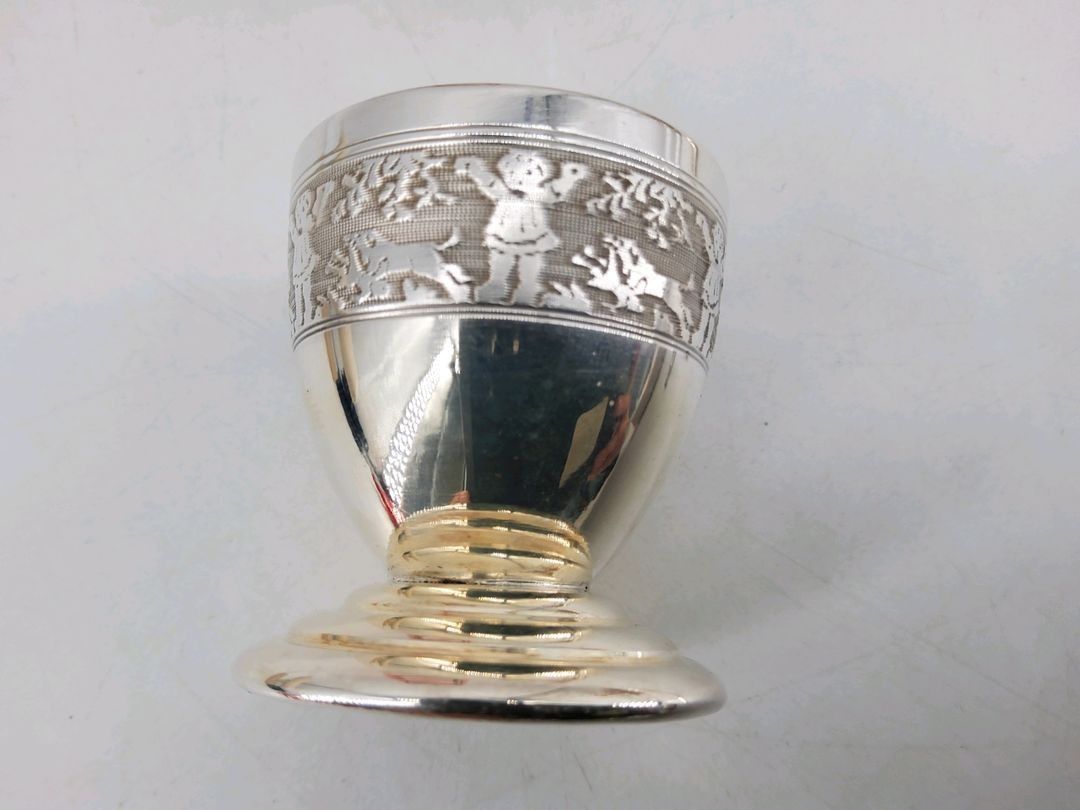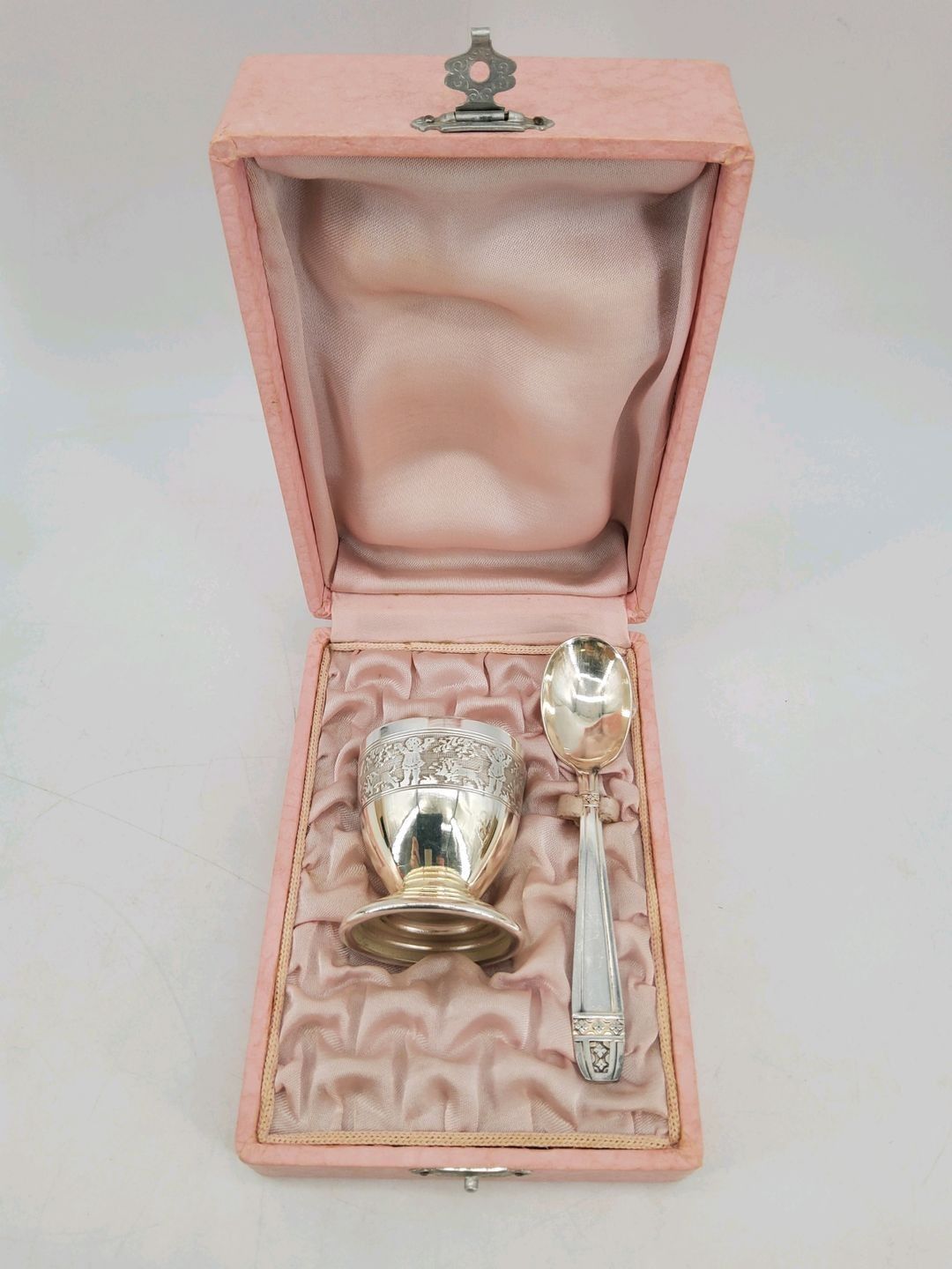 In its case: silver-plated egg cup and spoon, the egg cup decorated with a frieze of children. - This lot available anywhere in mainland France from €12.24 - This lot available anywhere in Europe from €18.00