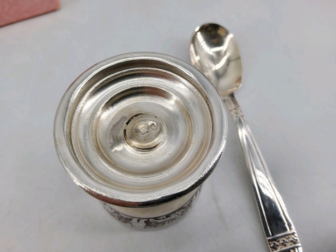 In its case: silver-plated egg cup and spoon, the egg cup de…