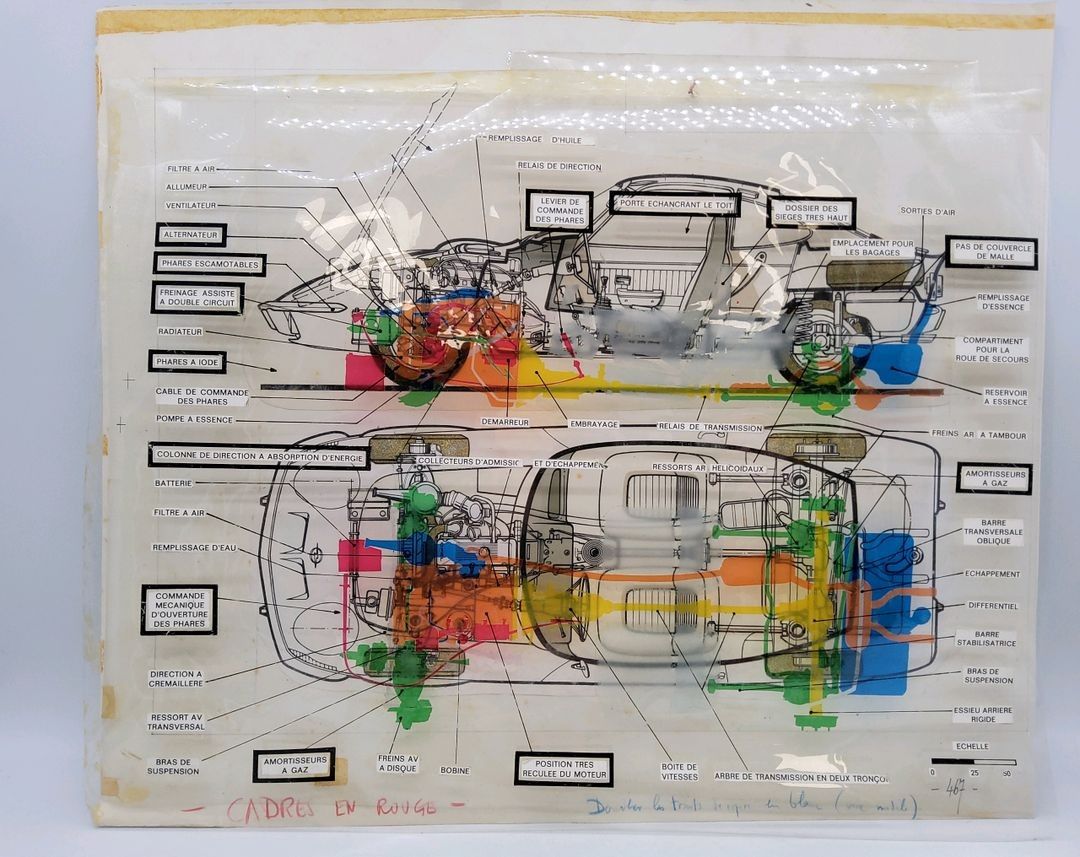 Original drawing of the Opel GT mounted on cardboard with original inscriptions. Found on page 3 of issue 467 of Auto Journal. Dimensions: 56 cm x 49 cm - This lot is available everywhere in France from 12,24 € - This lot is available everywhere in Europe from 18,00 €.