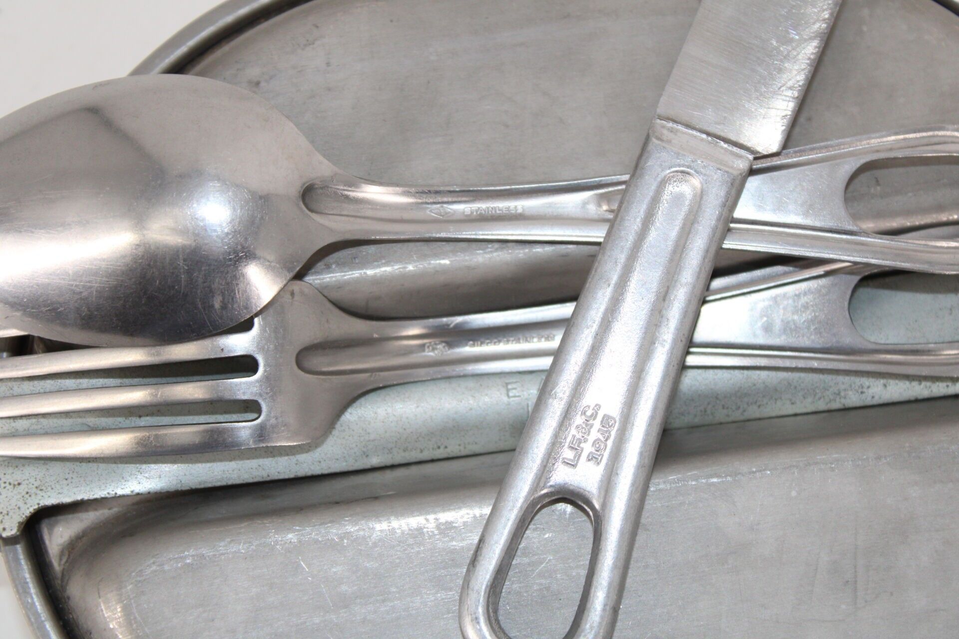 Canteen, bowl & cutlery - US Army Gourd, quarter & cover dated 1945. E.A.Co & dated 1945. Three pieces of cutlery including knife dated 1945.