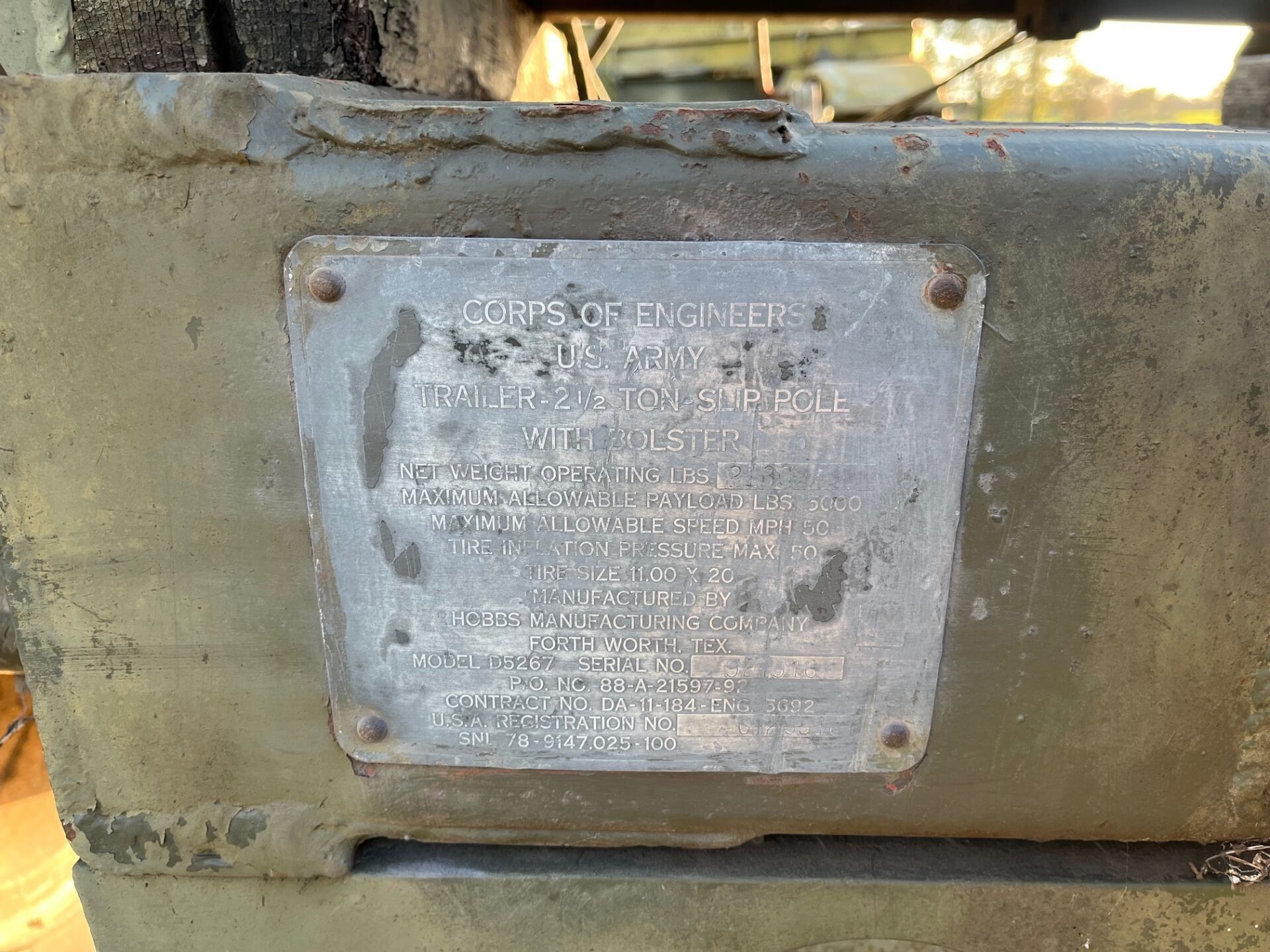 The D5267 trailer is in very good condition, with its original Us Army Corps of Engineers production and instruction plates. The wooden drawbar slides and its locking plate is original and functional.