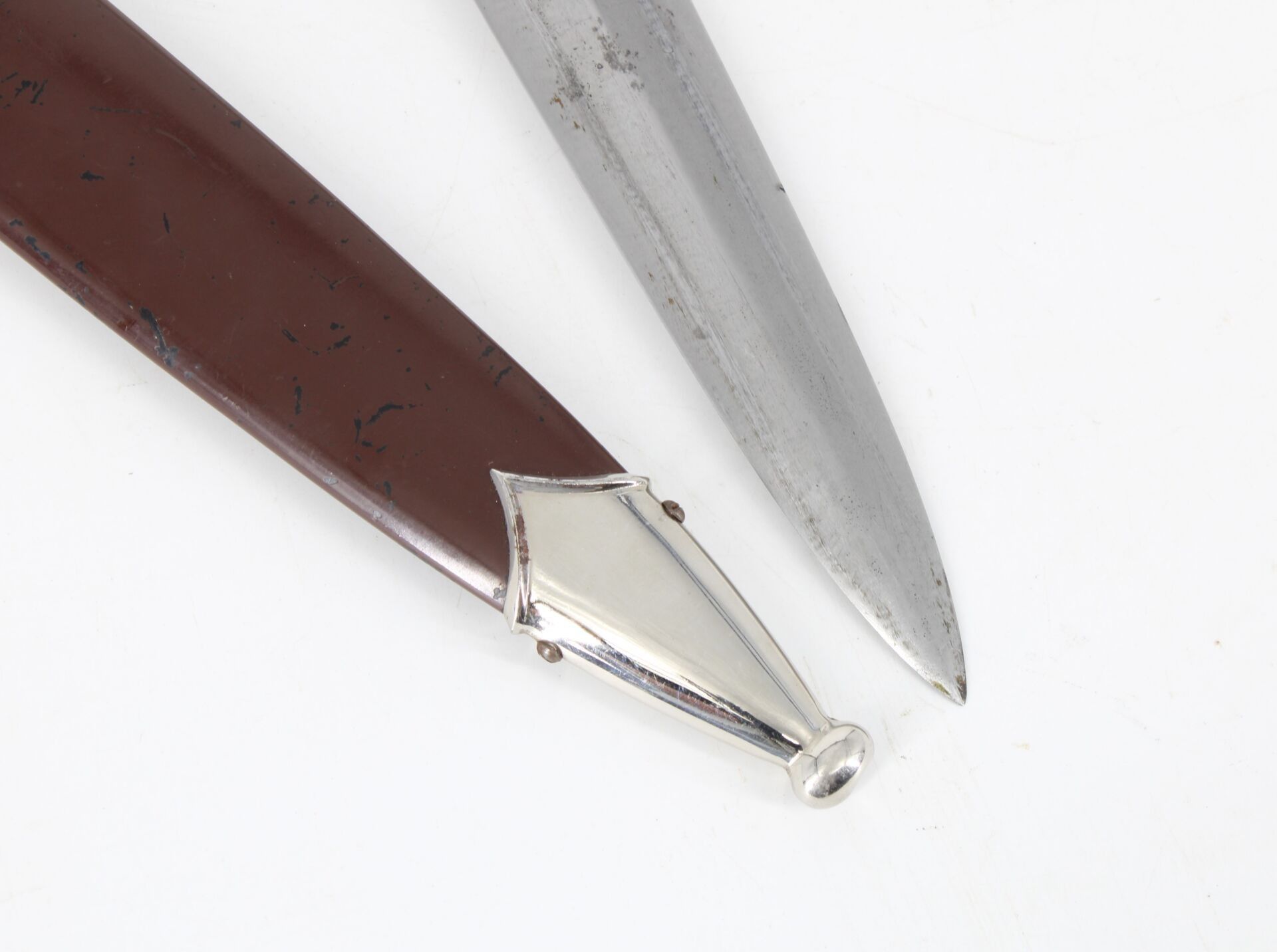 As is, chip on handle, one screw missing from scabbard.