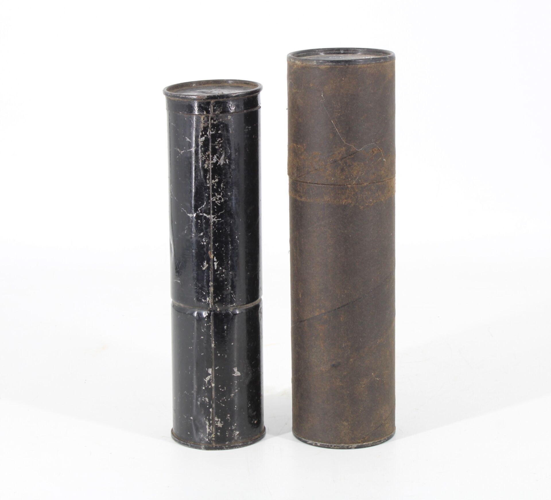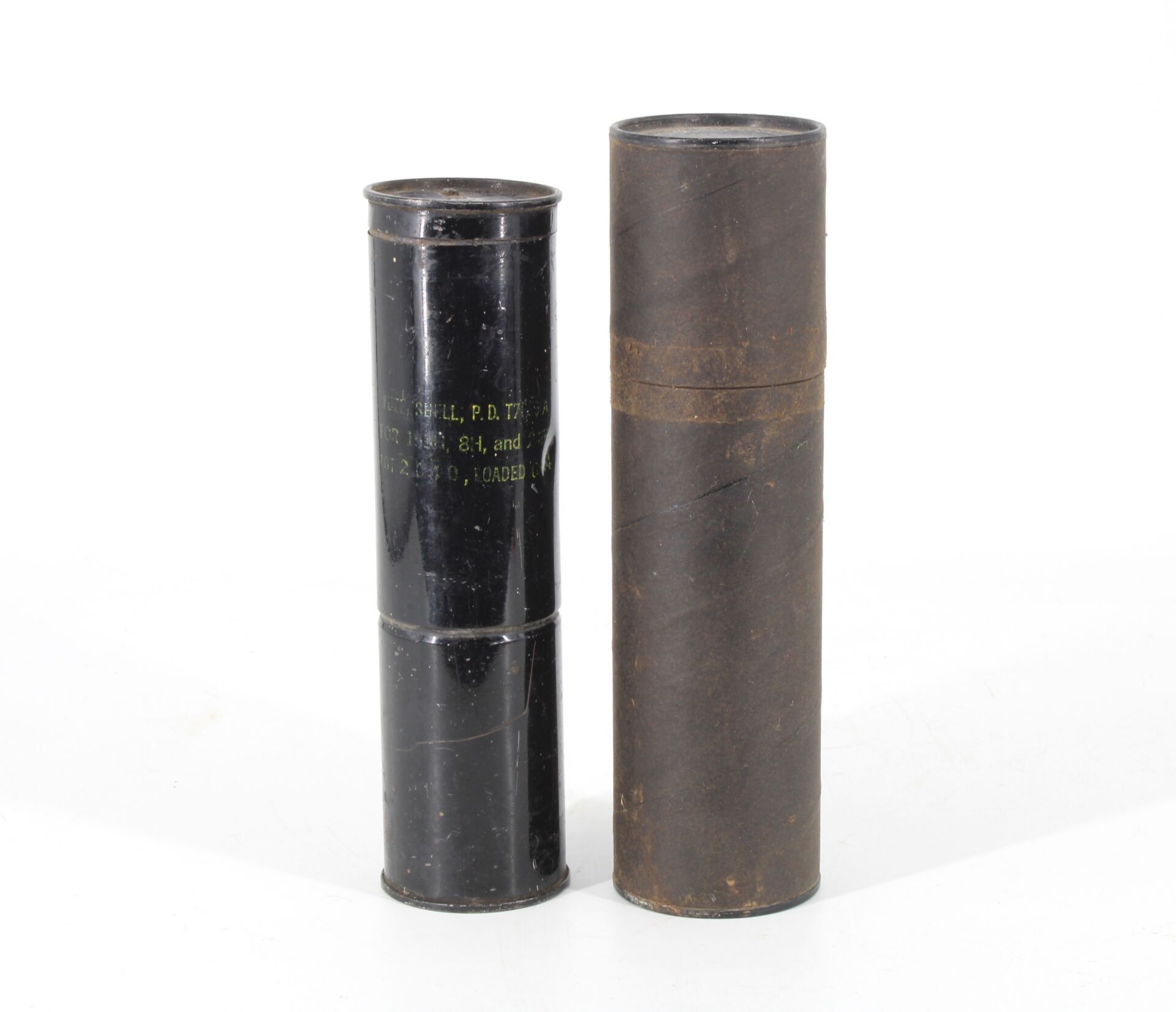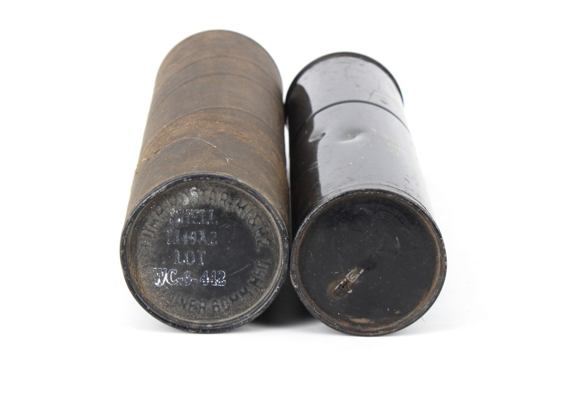 A tarred cardboard container for transporting a 60mm mortar shell.