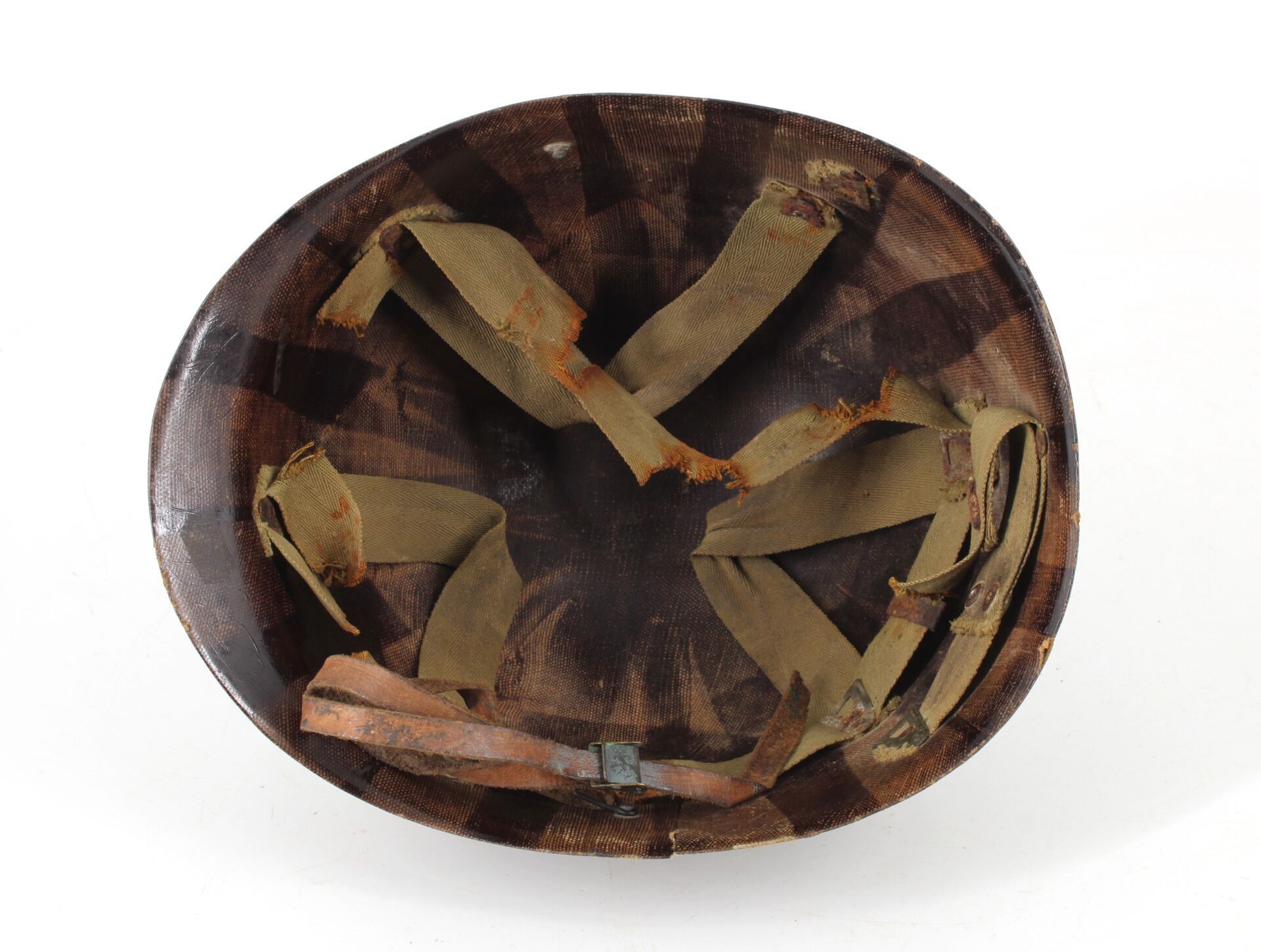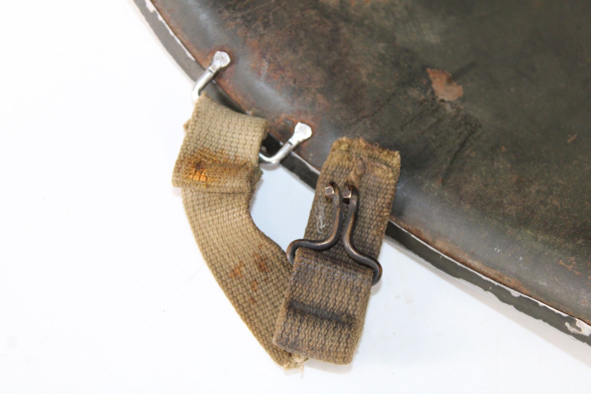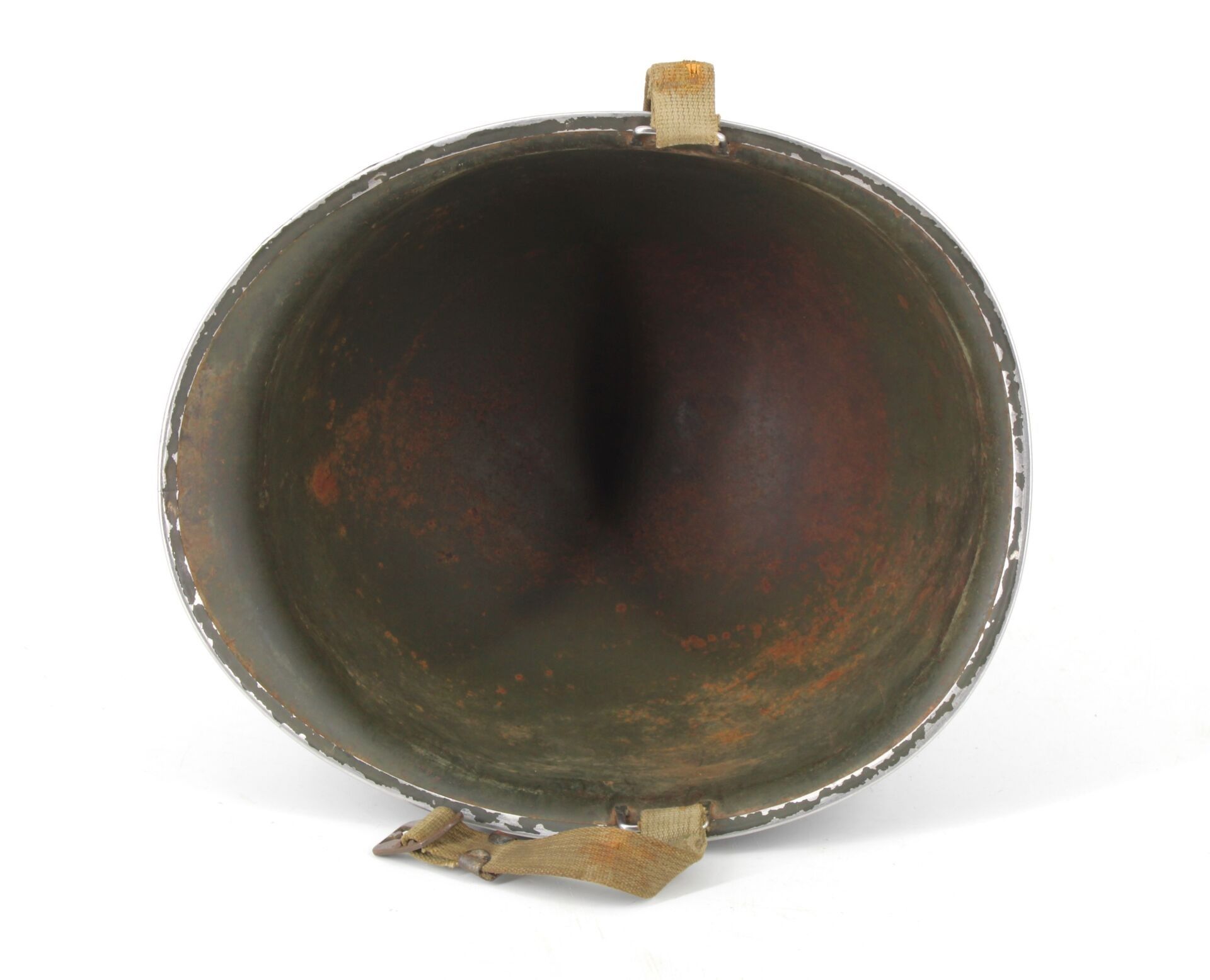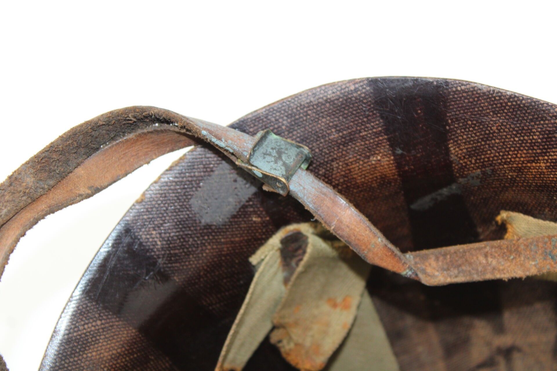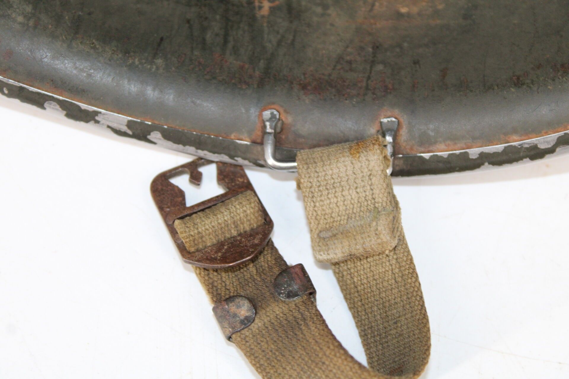 With cap, leather chinstrap & back protector. Several chips & traces of wear.