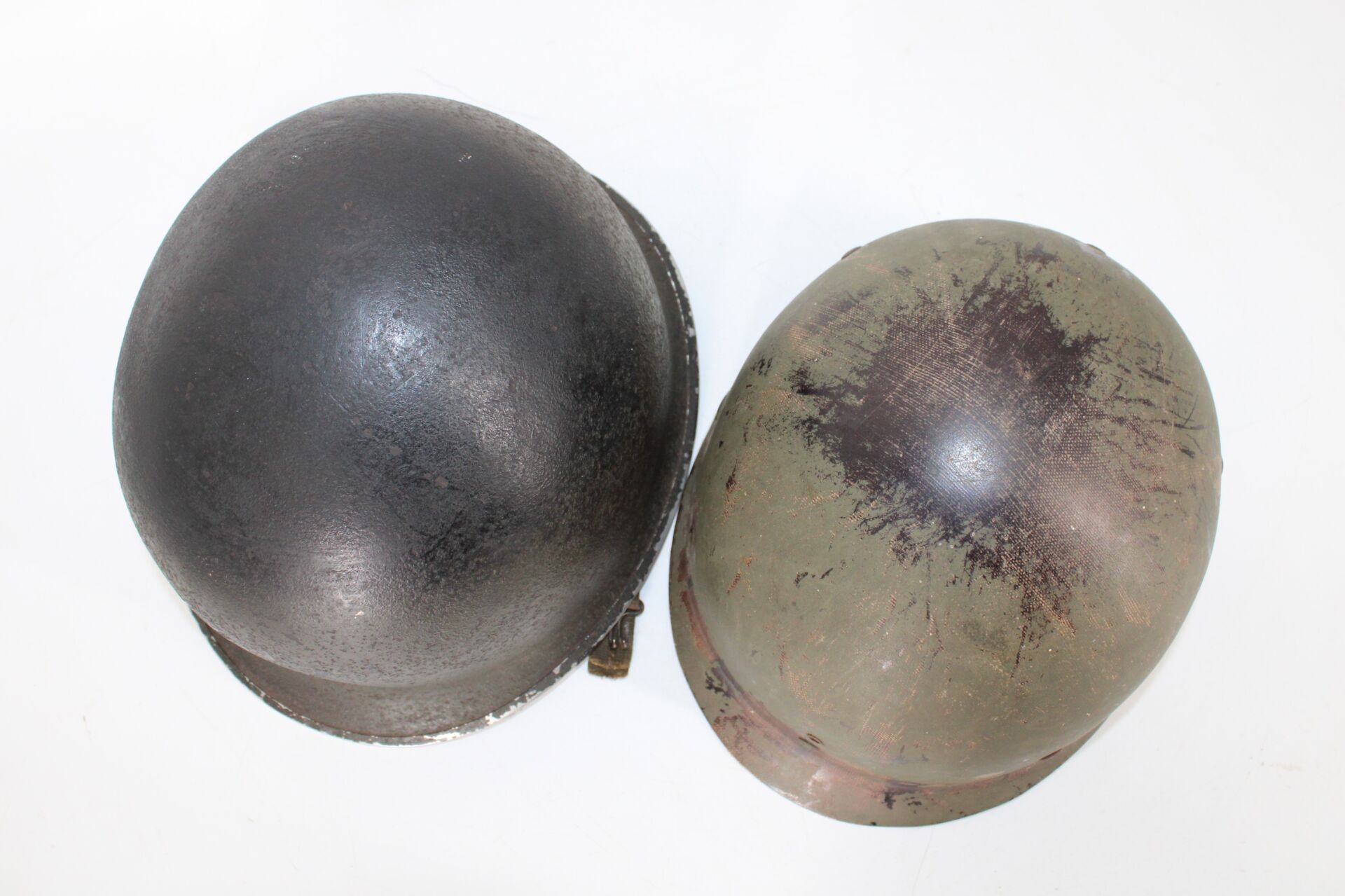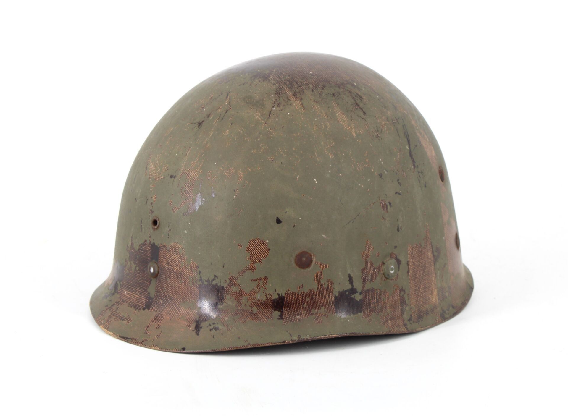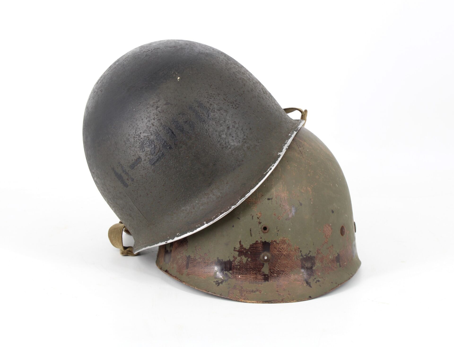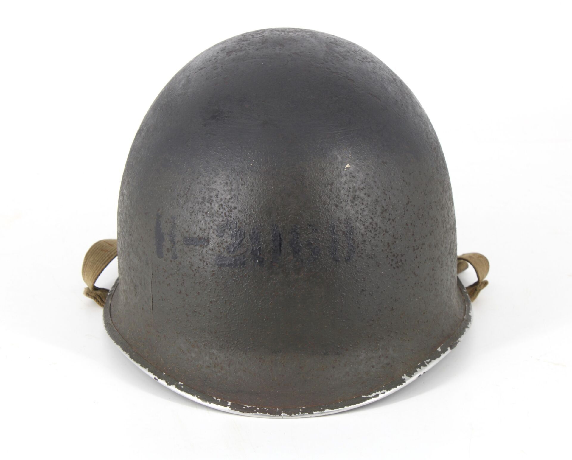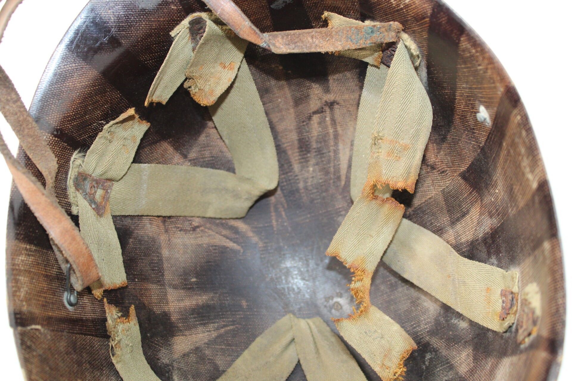 With cap, leather chinstrap & back protector. Several chips & traces of wear.