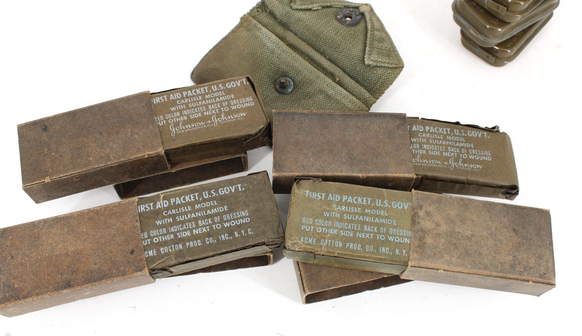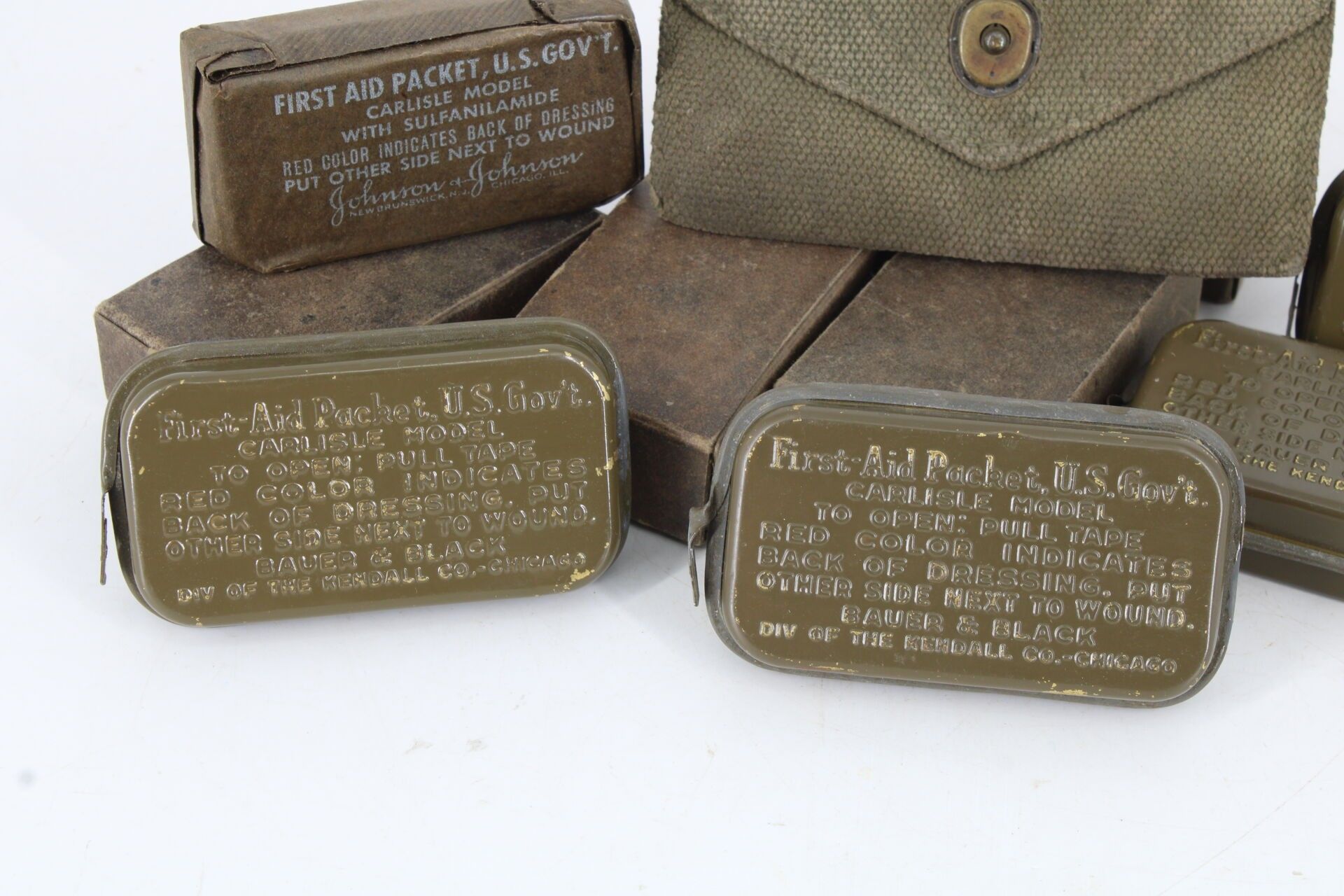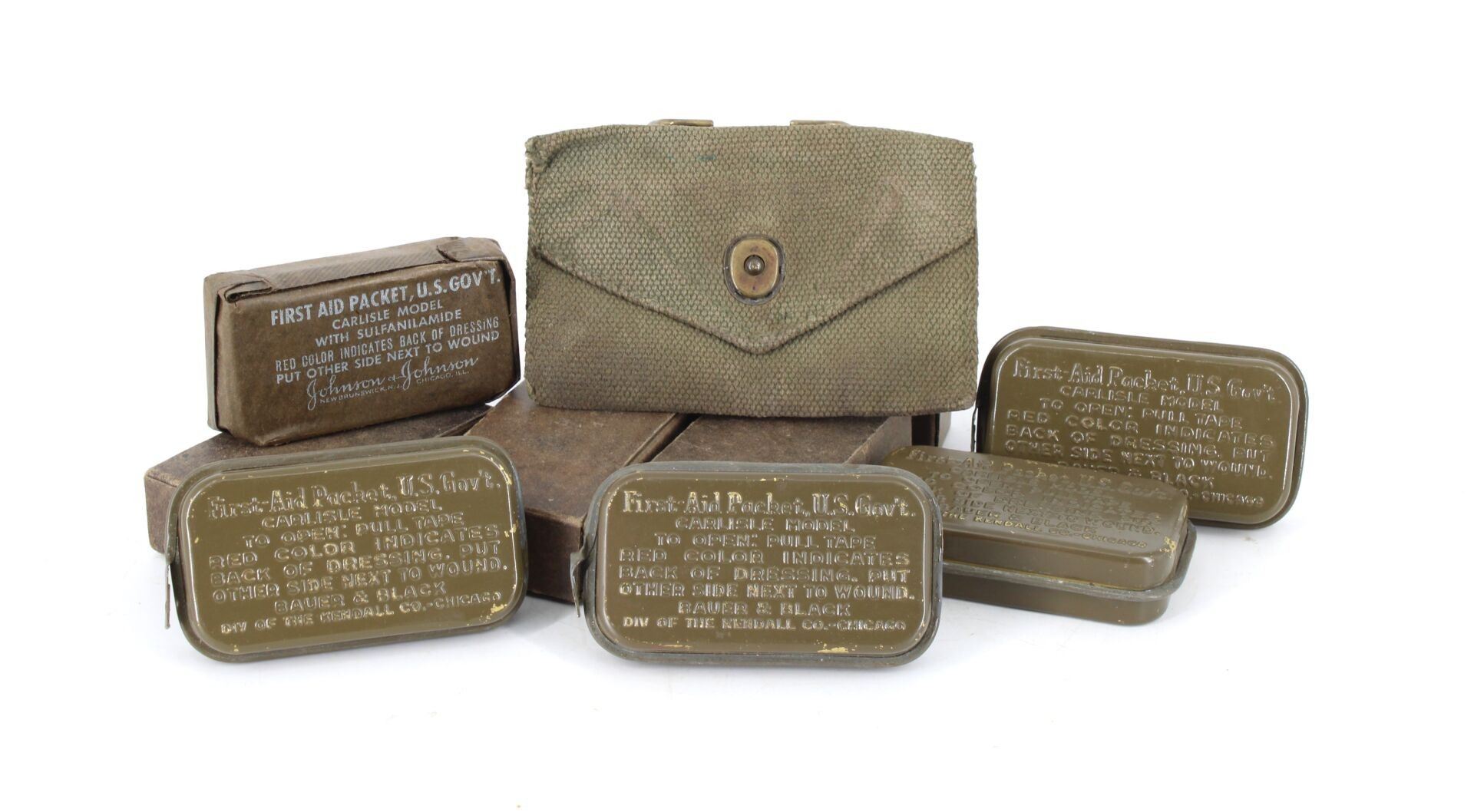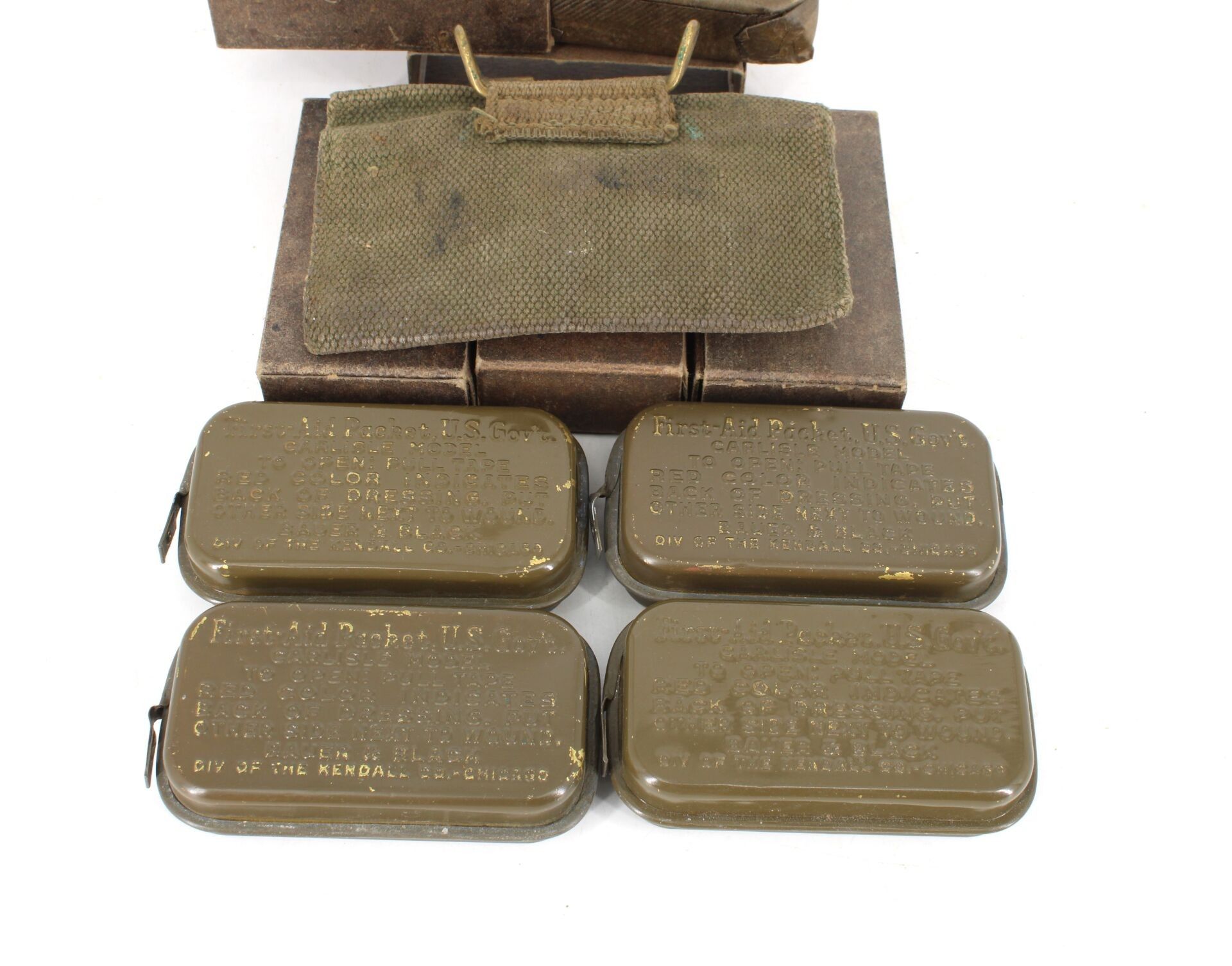 Set comprising one dressing pouch, four unopened metal box dressings & four cardboard box dressings.