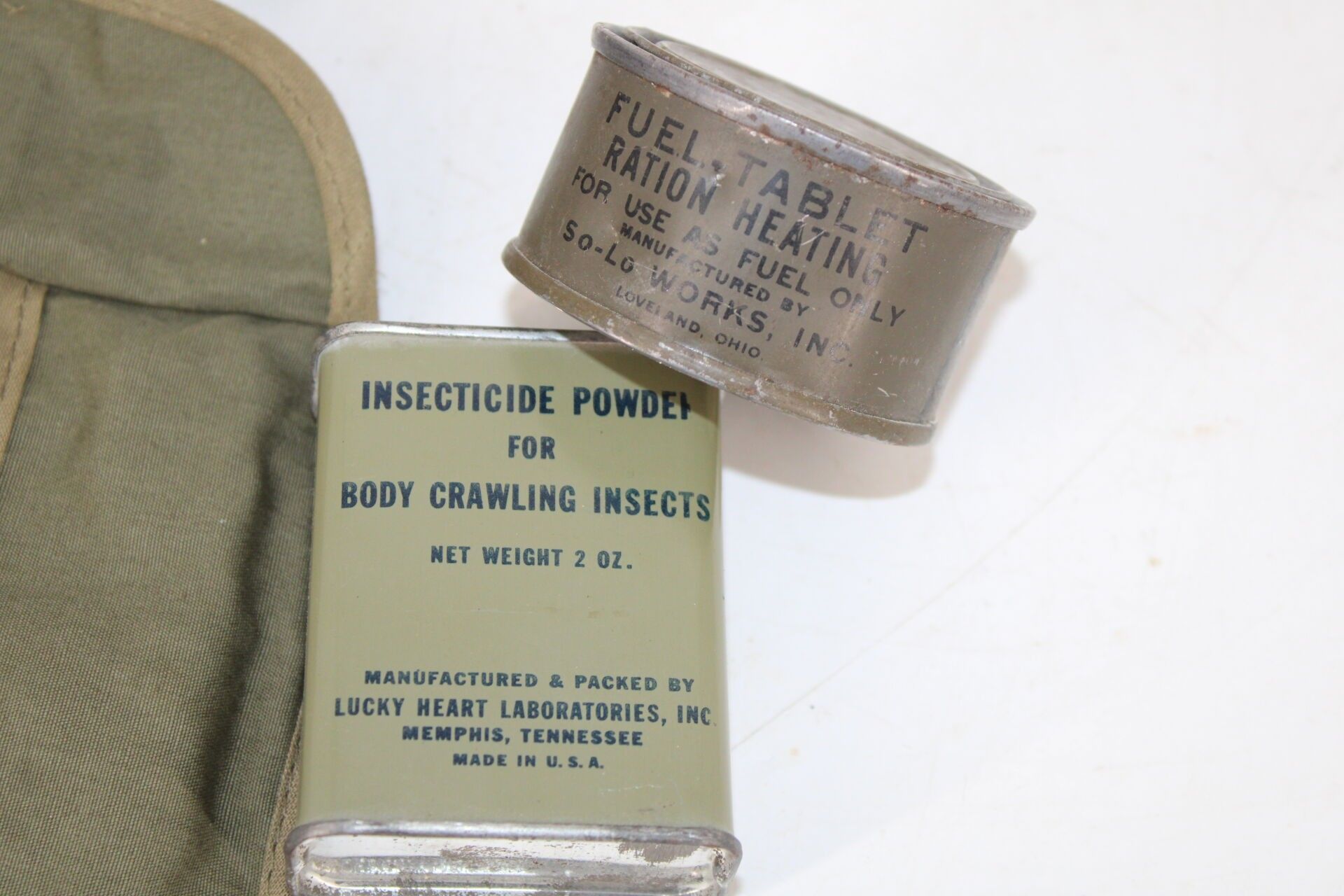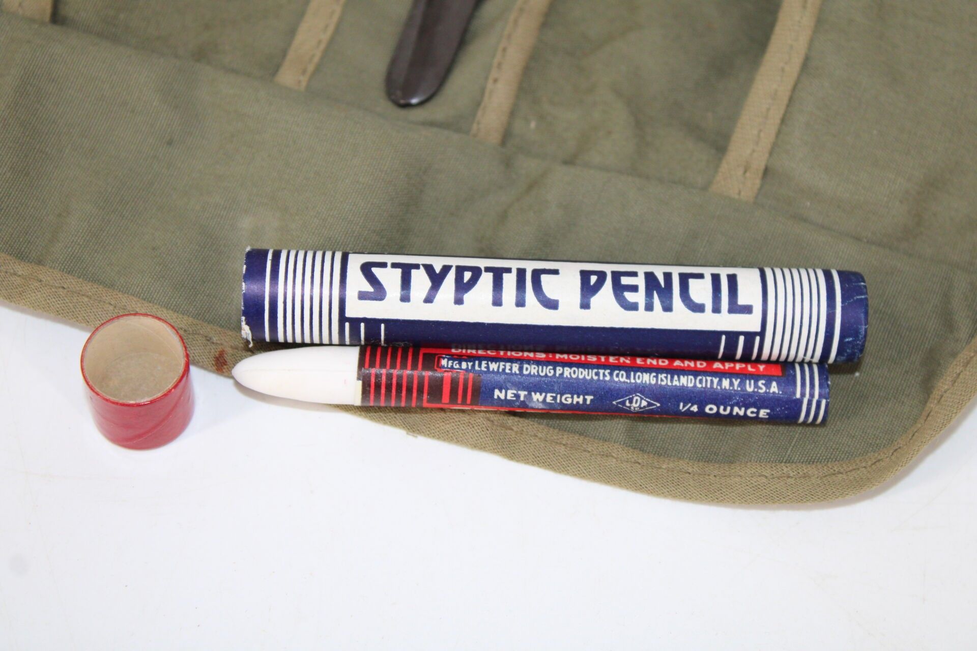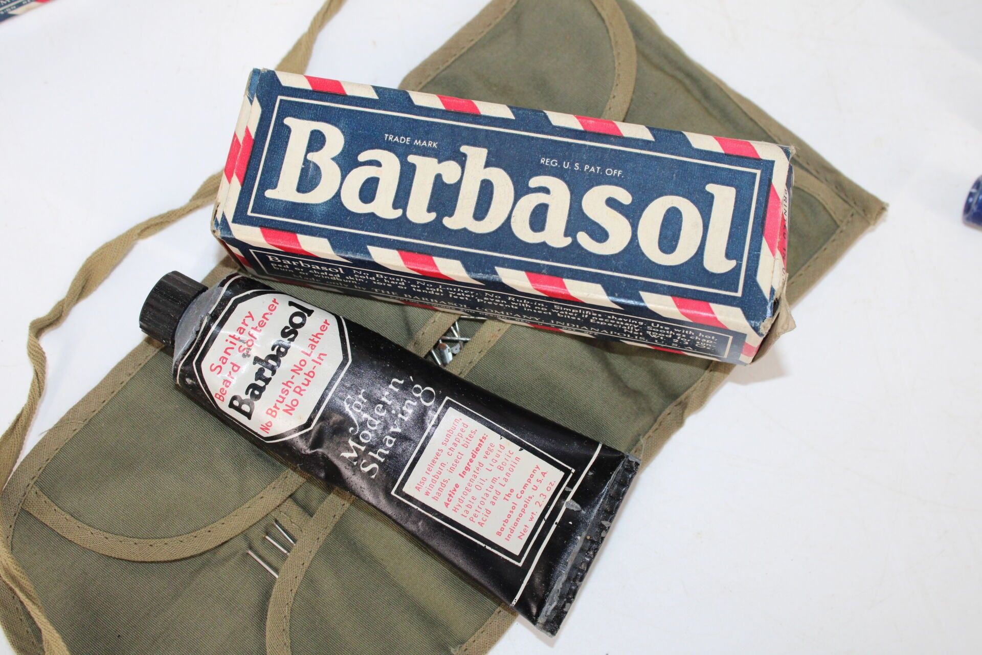 Boxes of powder, ration, two Styptic Pencils, two Barbasol boxes, one complete.