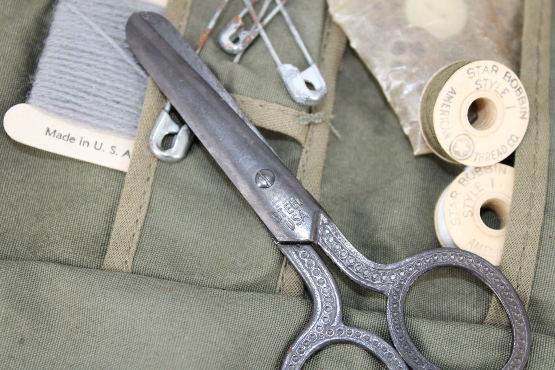 Set including a sewing kit with a pair of "USA" scissors, buttons, khaki thread, sewing thimbles, needles...