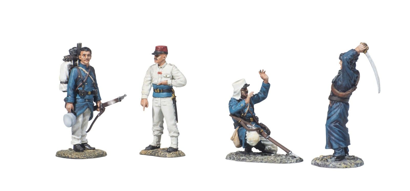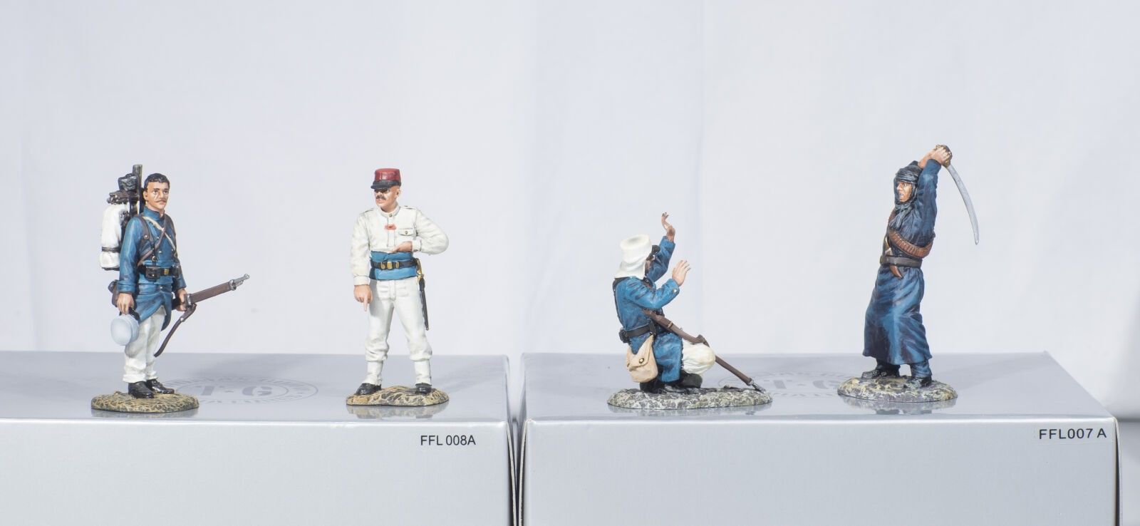 Thomas Gunn. Foreign Legion in the Sahara /4. Circa 1910. Officer, 2 Soldiers and an Arab. Sets sold out. Ref. FFL007A and FFL008A (4 Fig). 2 new boxes.