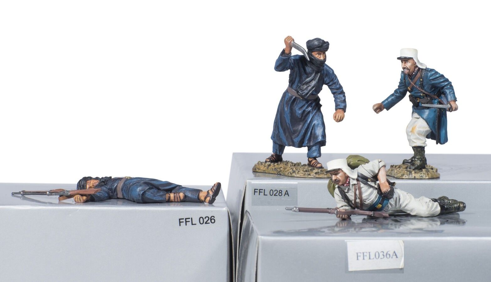Thomas Gunn. Foreign Legion in the Sahara /9. Circa 1910. 2 Soldiers and 2 Arab Warriors. Sets sold out Ref. FFL026 and FFL028A and FFL036 A. (4 Fig.). 3 new boxes.