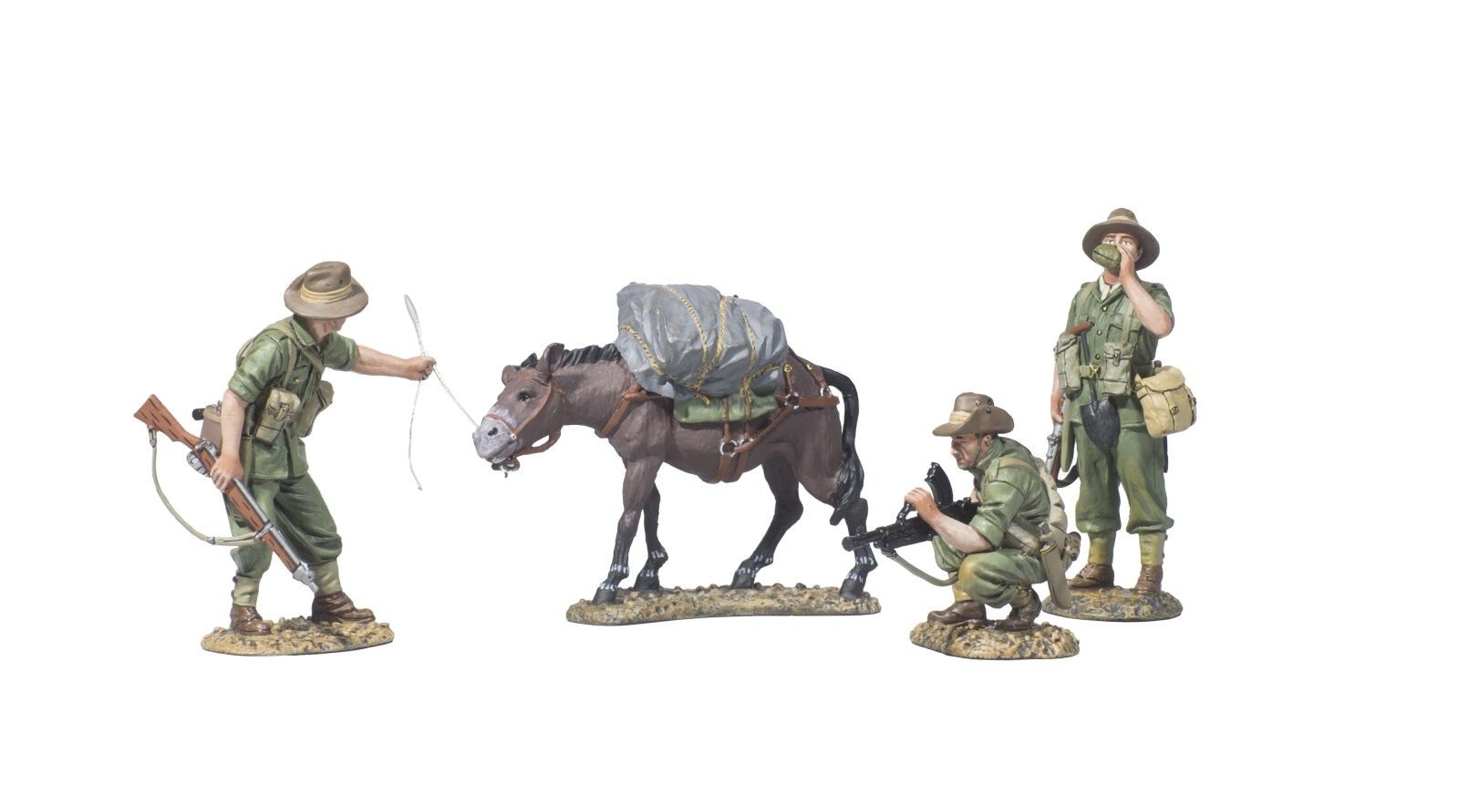 Thomas Gunn. Second World War Pacific /5. Australian soldiers with mule. Sets sold out. Ref. RS006, RS013A and RS037 (4 Fig.). 3 new boxes.