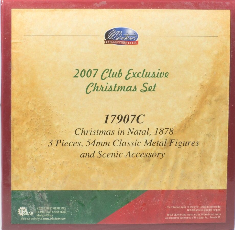 William Britain. Collector Club special Christmas 2007. Christmas in Natal, 1878. Sold out set in limited and numbered edition 209/250. Copies with numbered certificate (3 Fig. with decoration). Ref. 17907C in box (Traces of wear). Brand new.