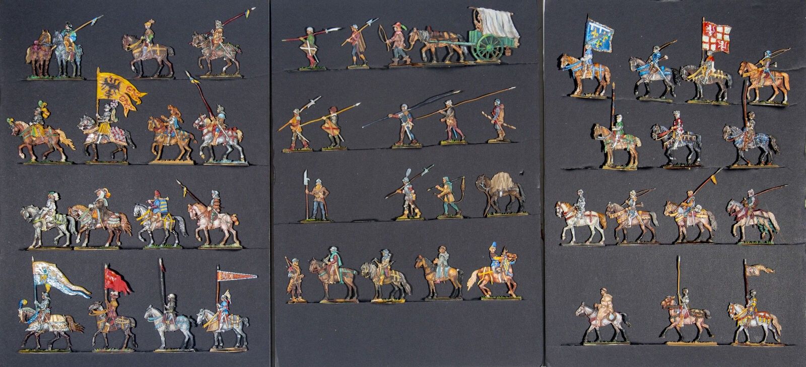 Middle Ages. Knights with banners and Standards, Cavaliers with spears, Monks, Archers and Carriole. Good amateur painting. 46 Pieces in 3 plates. T.B.E.