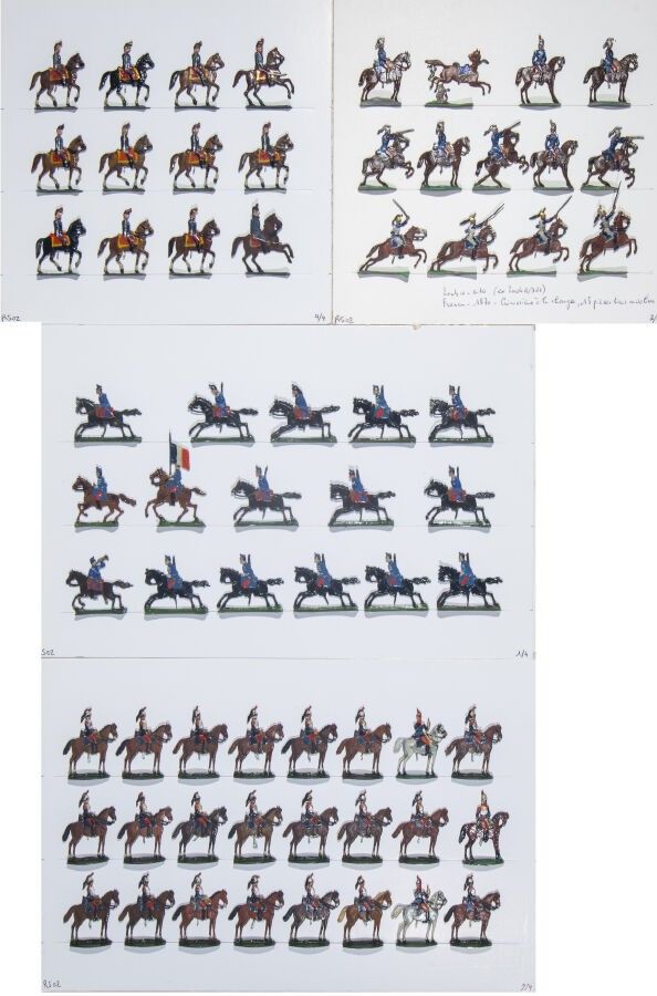 War of 1870. French Cavalry. Cuirassiers, Chasseurs, Artilleurs, etc... At the walk, waiting or charging. Amateur painting. 65 Pieces in 4 plates. T.B.E.